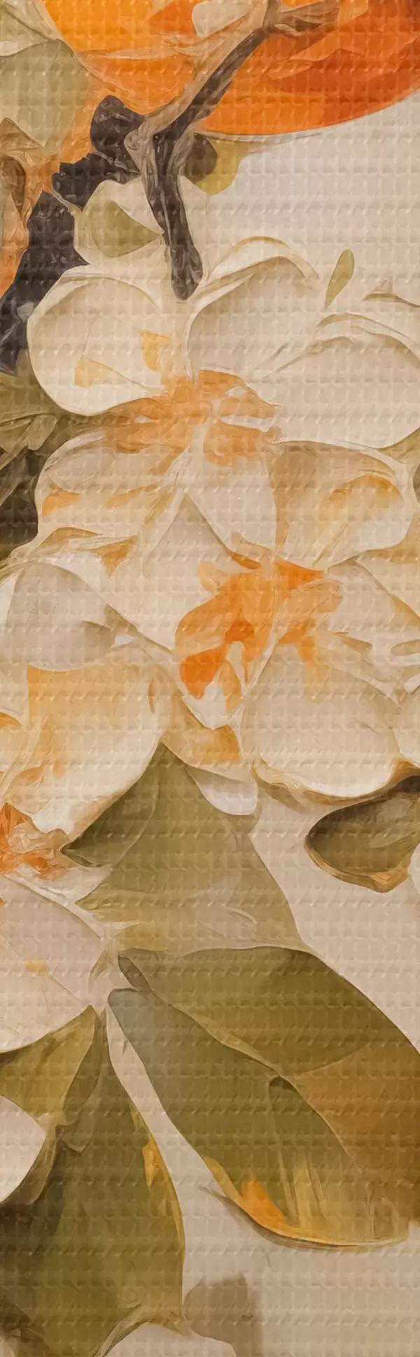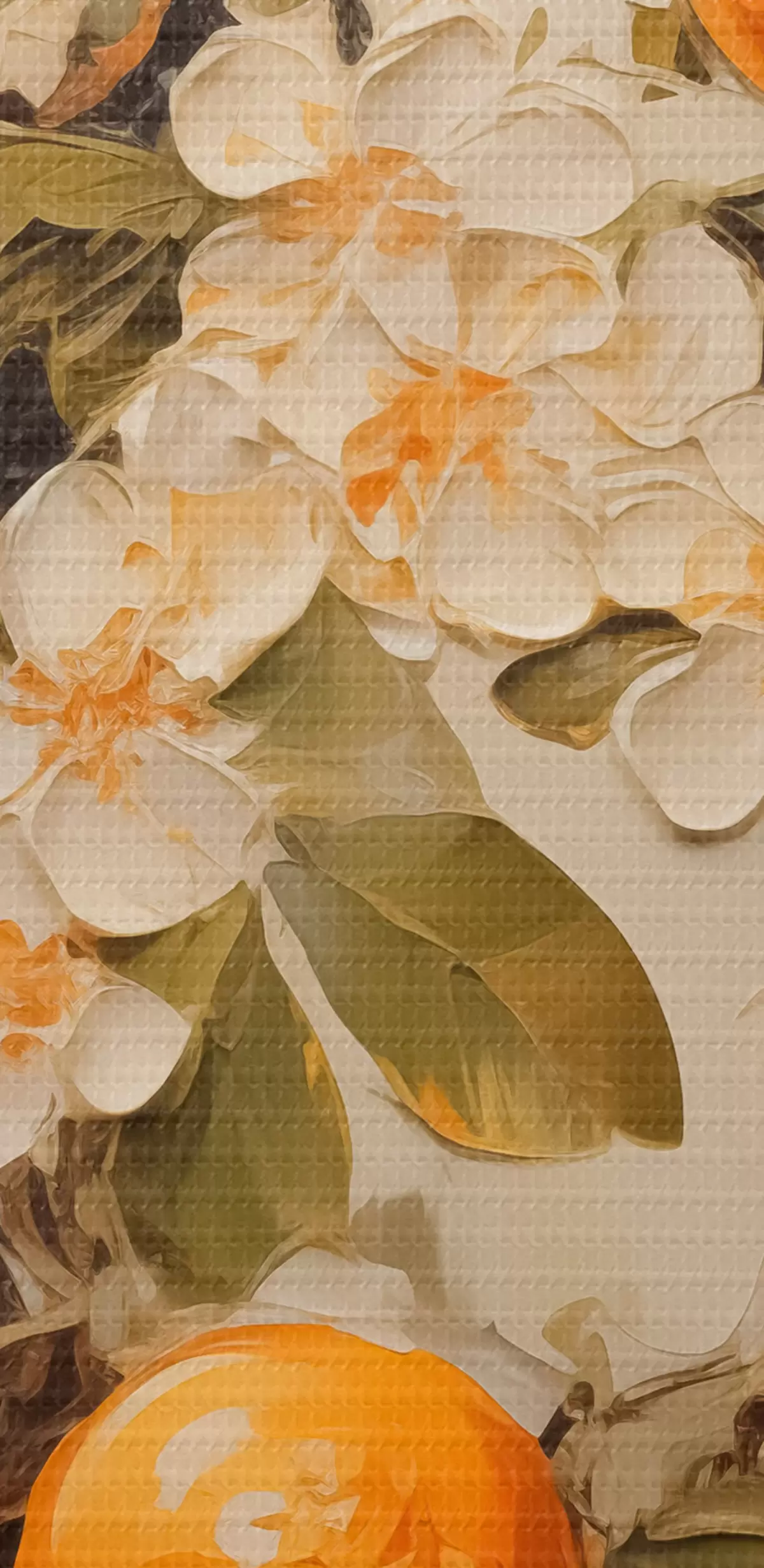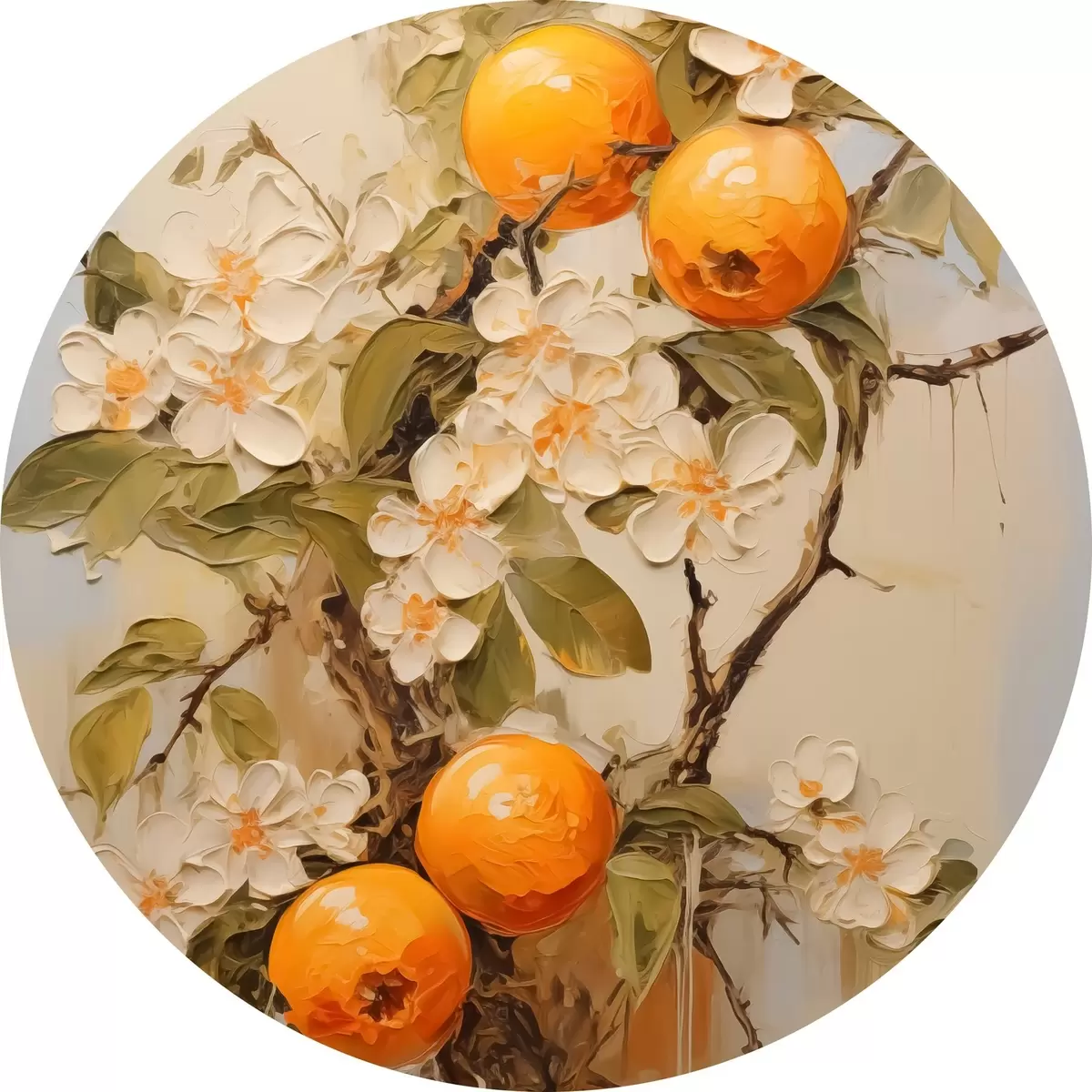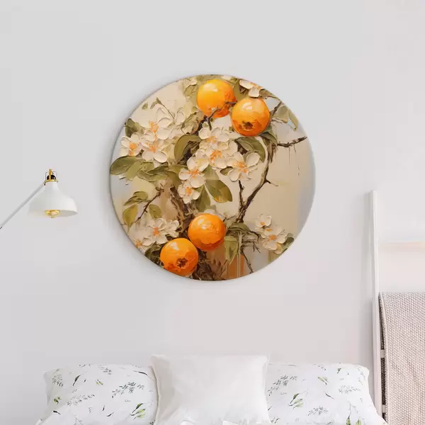 Pilt Valgete lillede ja apelsinidega oks hallikasbeežil taustal Nr r40486