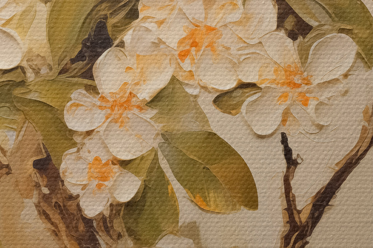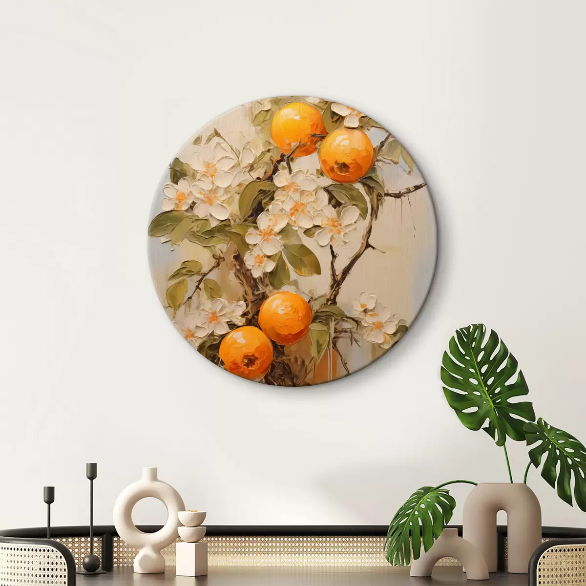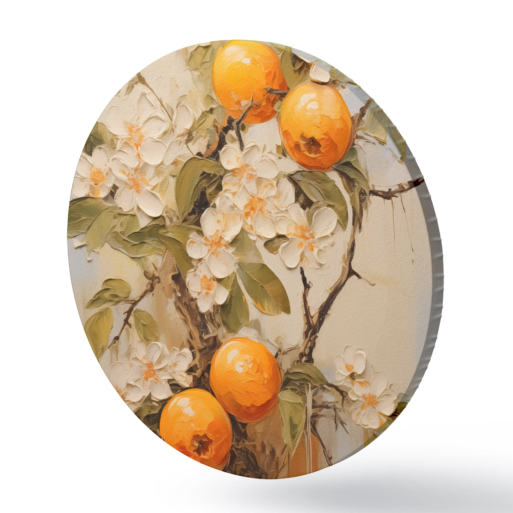 Pilt Valgete lillede ja apelsinidega oks hallikasbeežil taustal Nr r40486