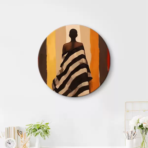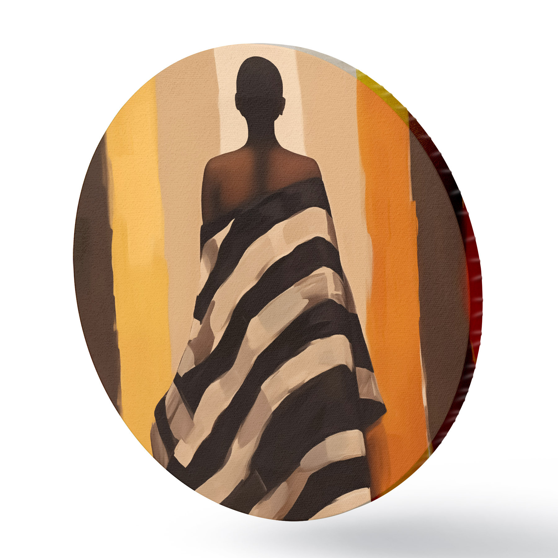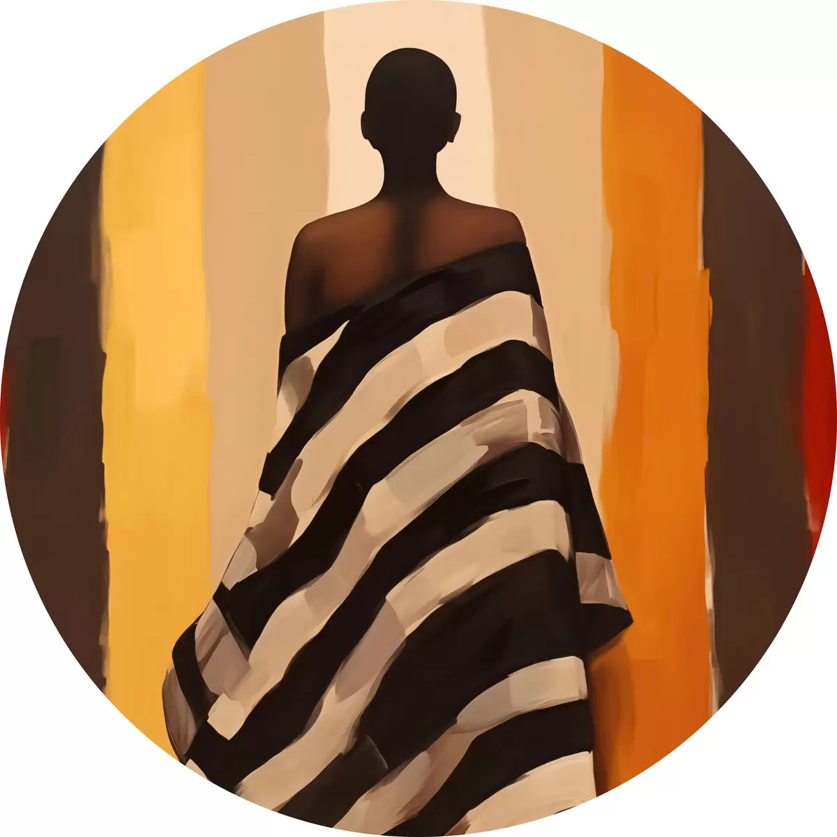 Pilt Aafrika ameeriklanna siluett triibulise keebiga taustal vertikaalsete triipudega, must, beež, kollane, punane, pruun Nr r40487