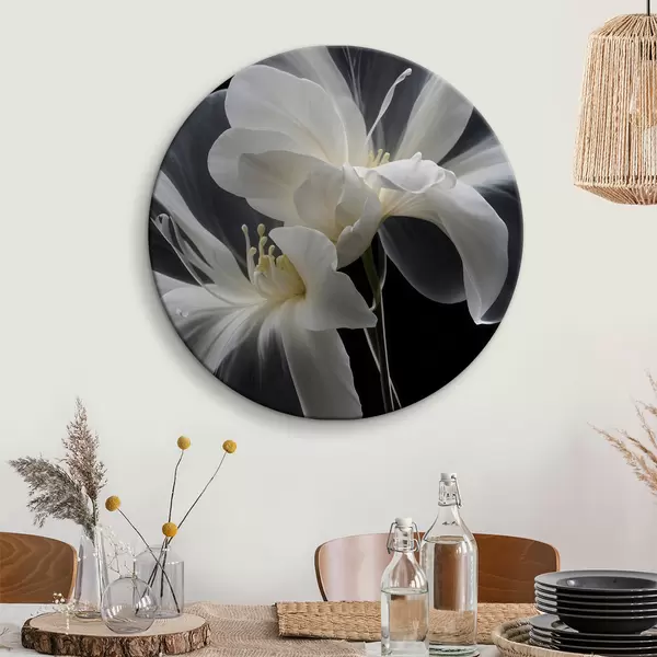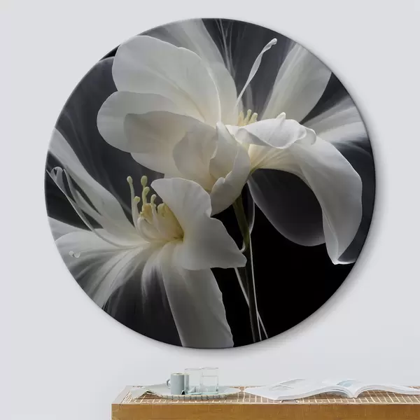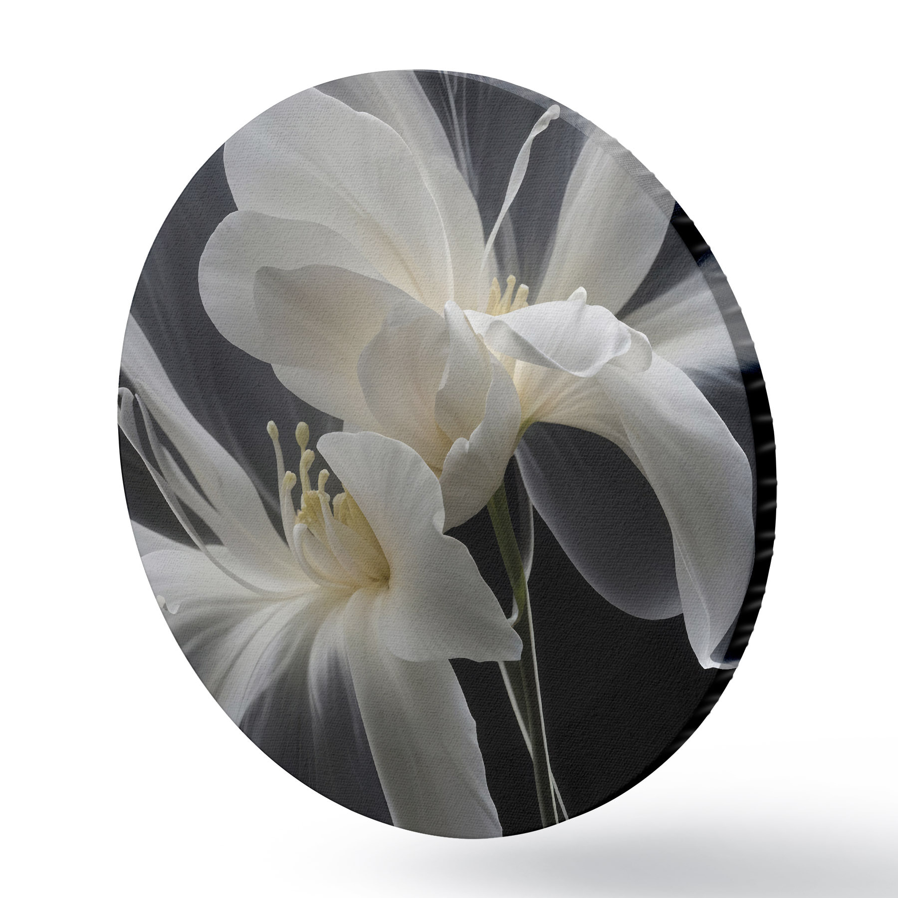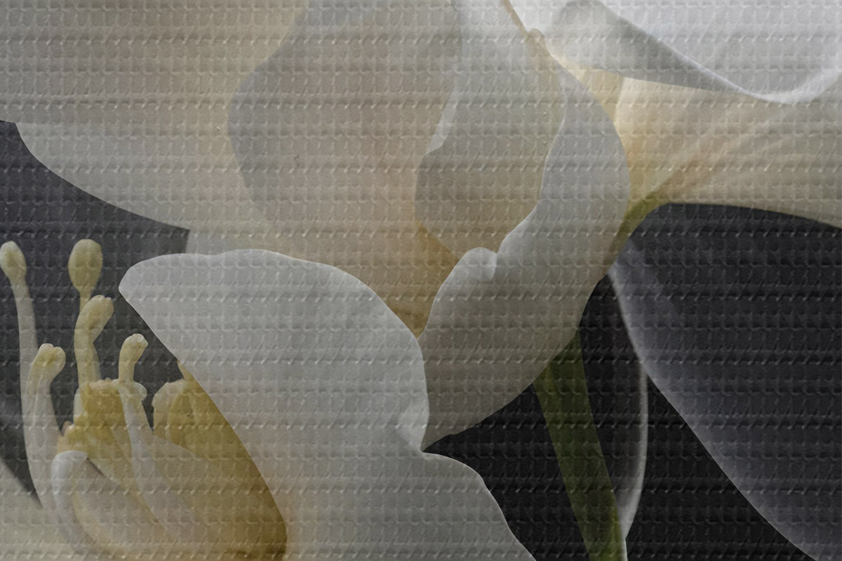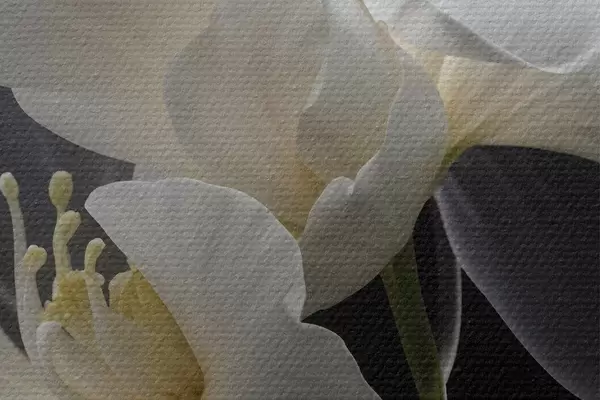 Pilt Lähivõtte kahest valgest õrnade kroonlehtedega ja kollase keskusega lillest tumedal taustal Nr r40549