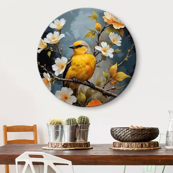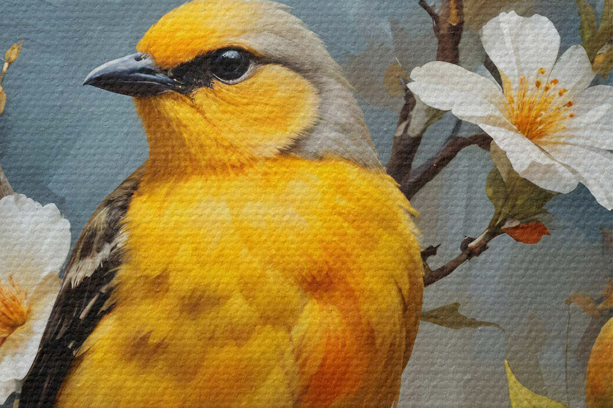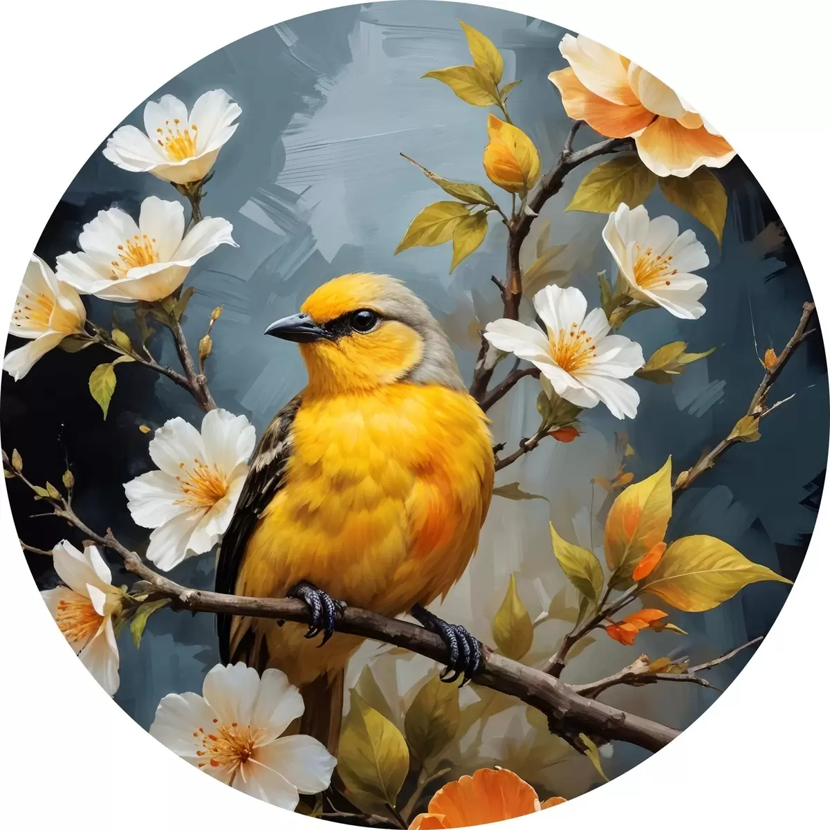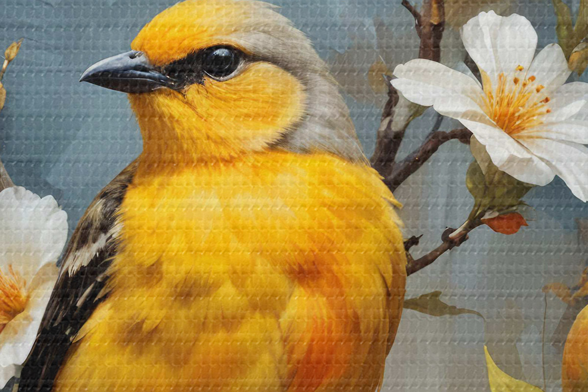 Pilt Kollane lind istub oksal, taustal on valged ja oranžid lilled Nr r40550