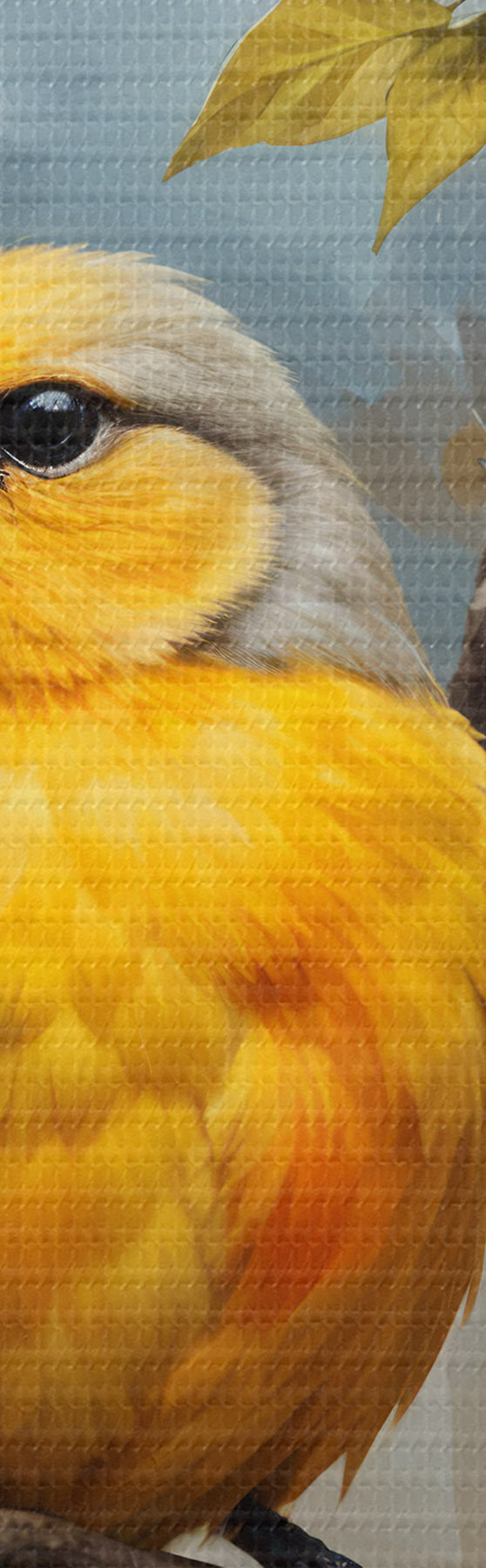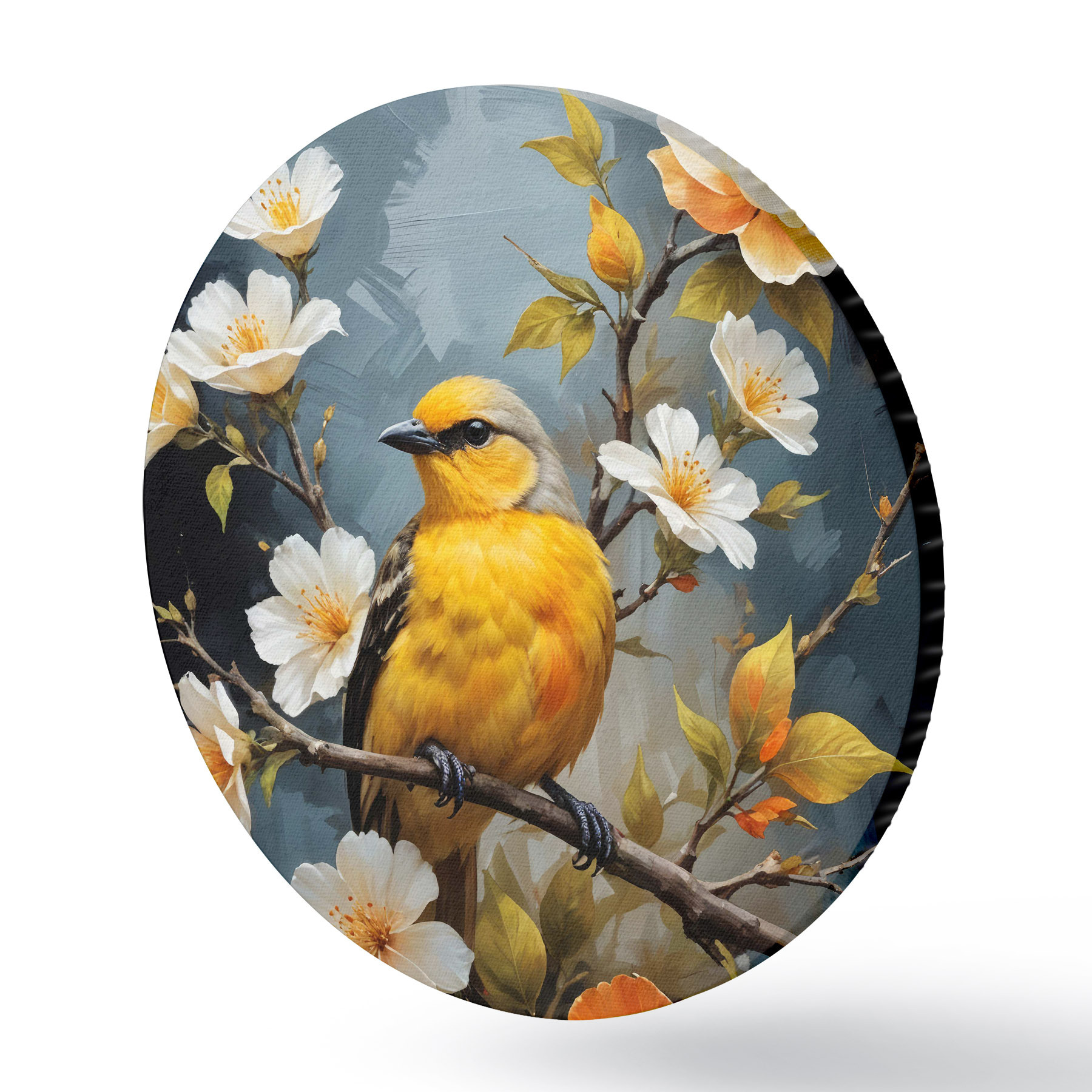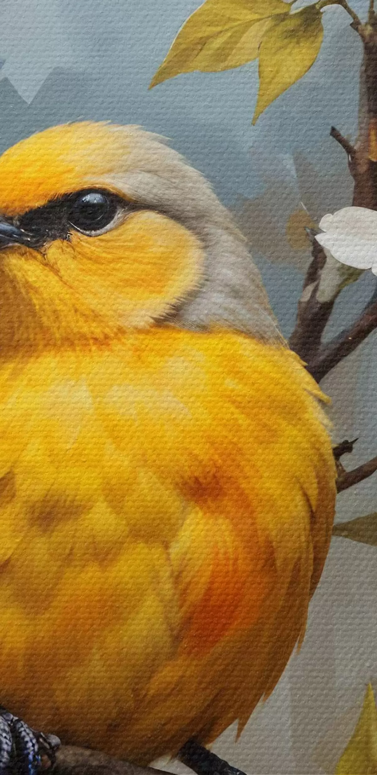 Pilt Kollane lind istub oksal, taustal on valged ja oranžid lilled Nr r40550