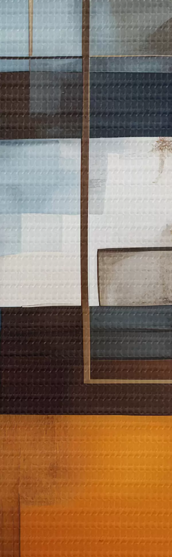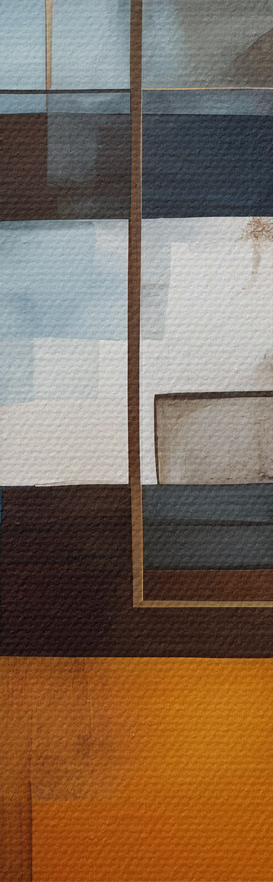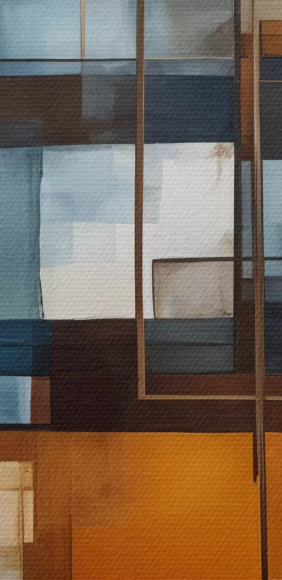 Pilt Abstraktsed geomeetrilised kujundid sinistes, oranžides ja pruunides toonides loovad kaasaegse, minimalistliku kompositsiooni. Nr r40563