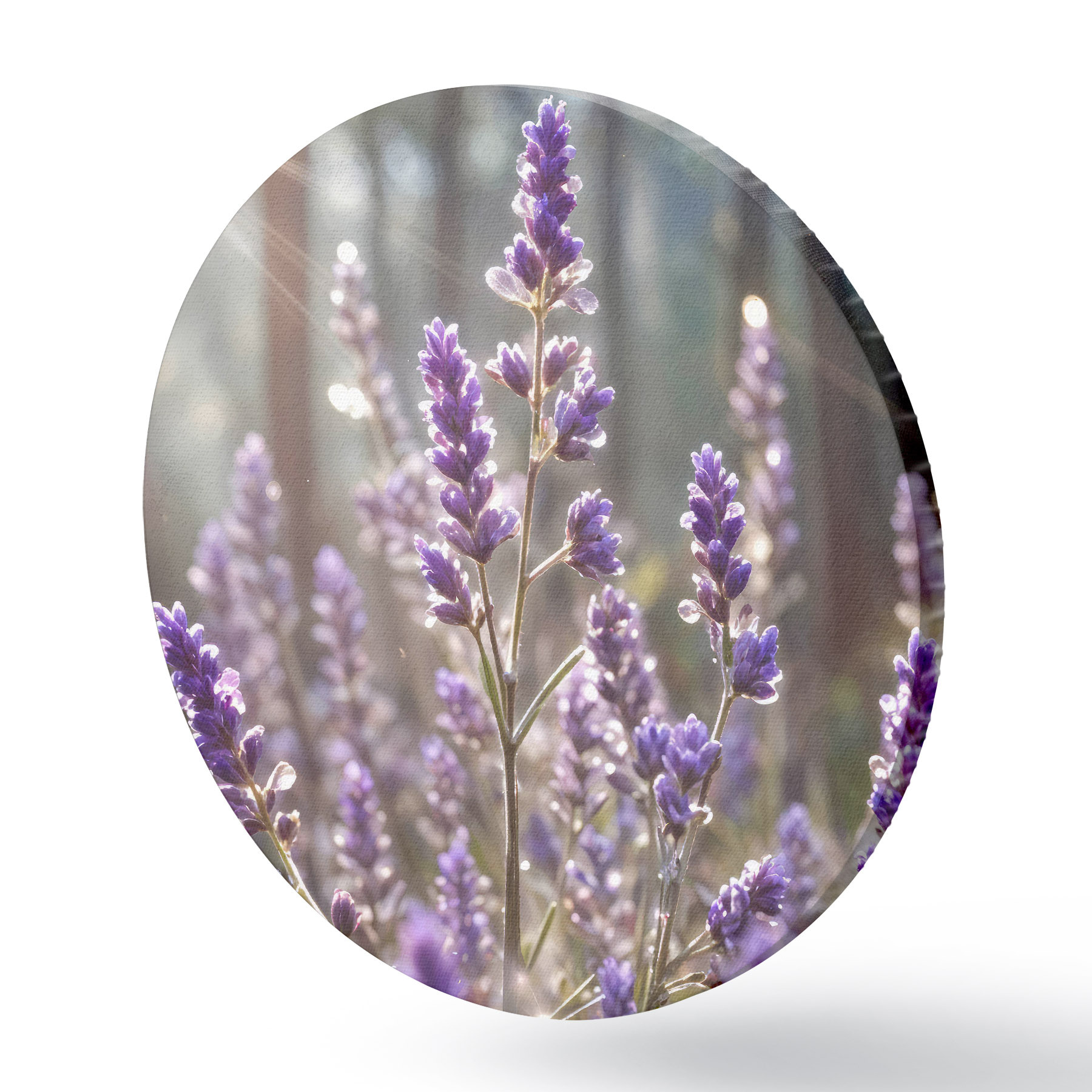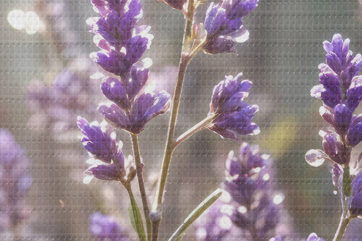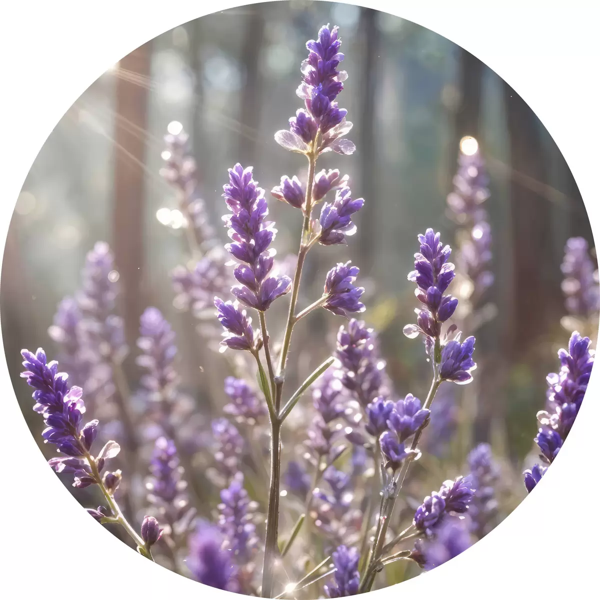Pilt Lillad lavendlililled põllul, hägune metsa taust ja läbi nende paistev päikesevalgus Nr r40570