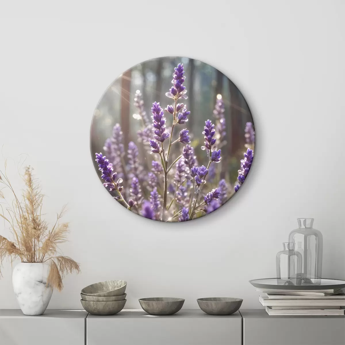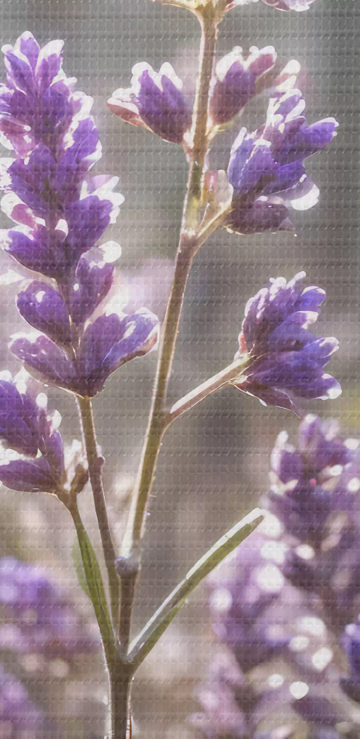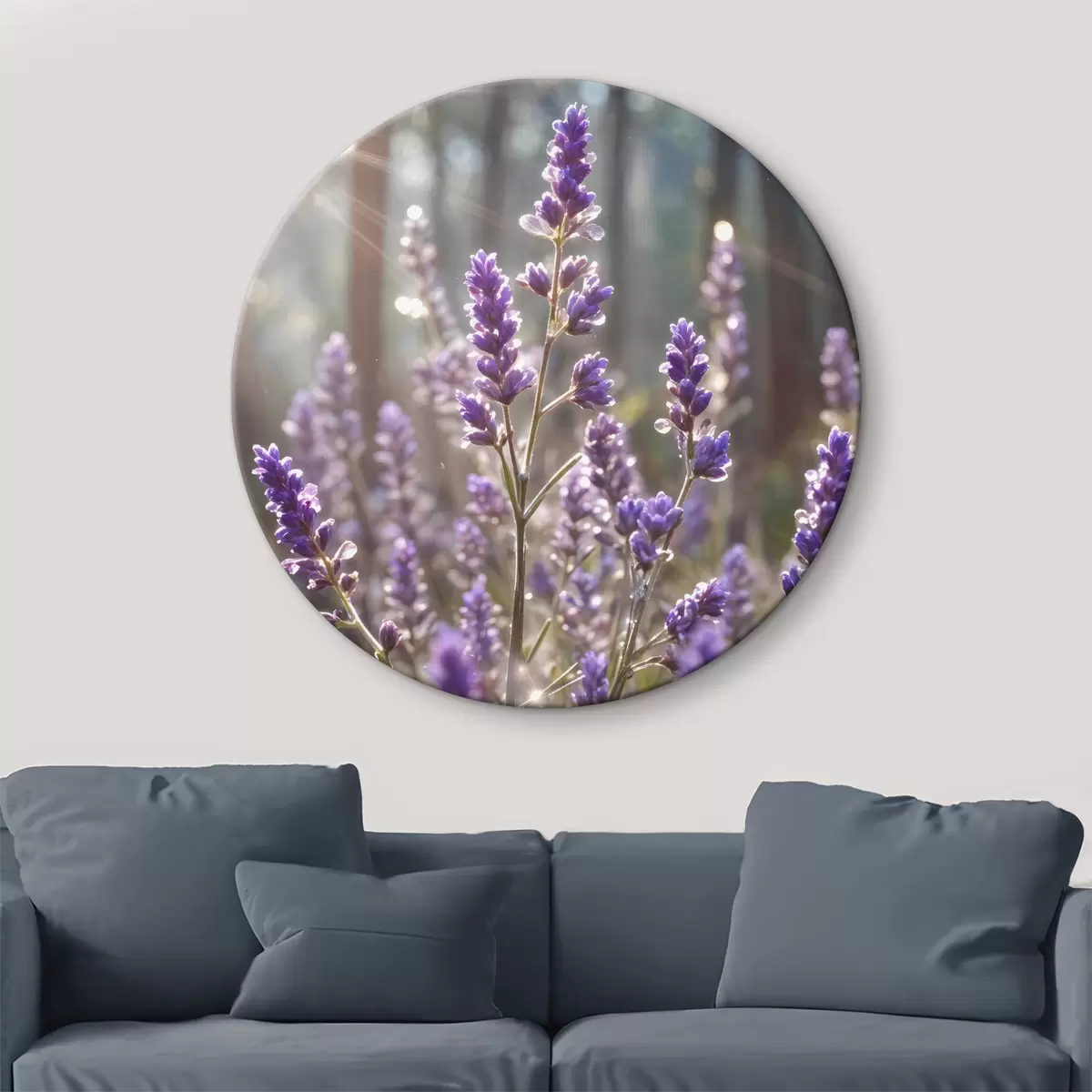 Pilt Lillad lavendlililled põllul, hägune metsa taust ja läbi nende paistev päikesevalgus Nr r40570
