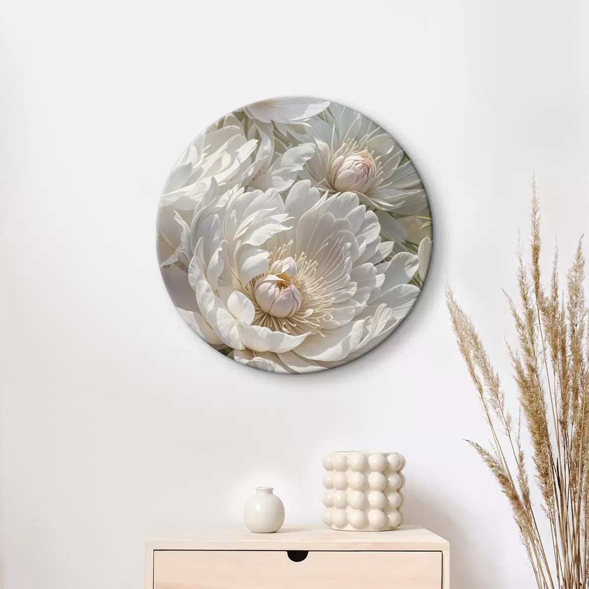 Pilt Lähivaade mitmest suurest, valgest pioonilillest, millel on pehmed, õrnad kroonlehed ja helekollane keskosa Nr r40575