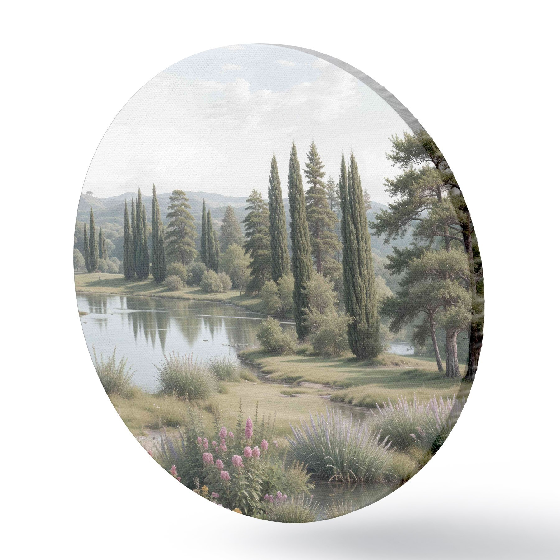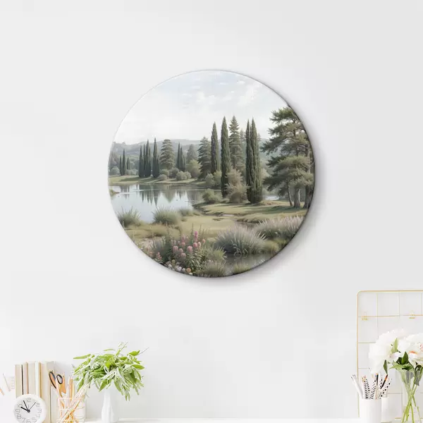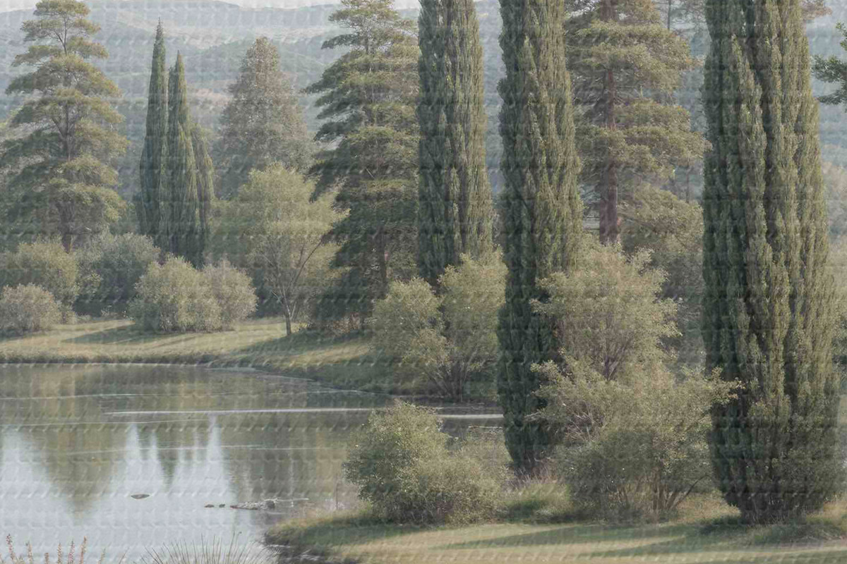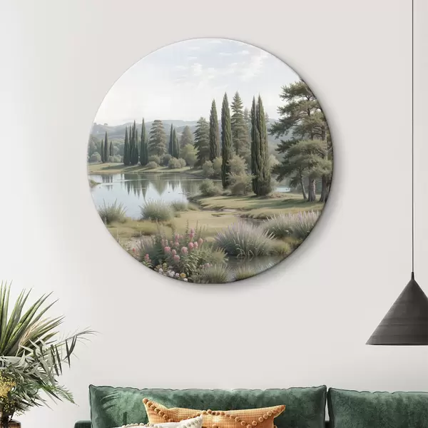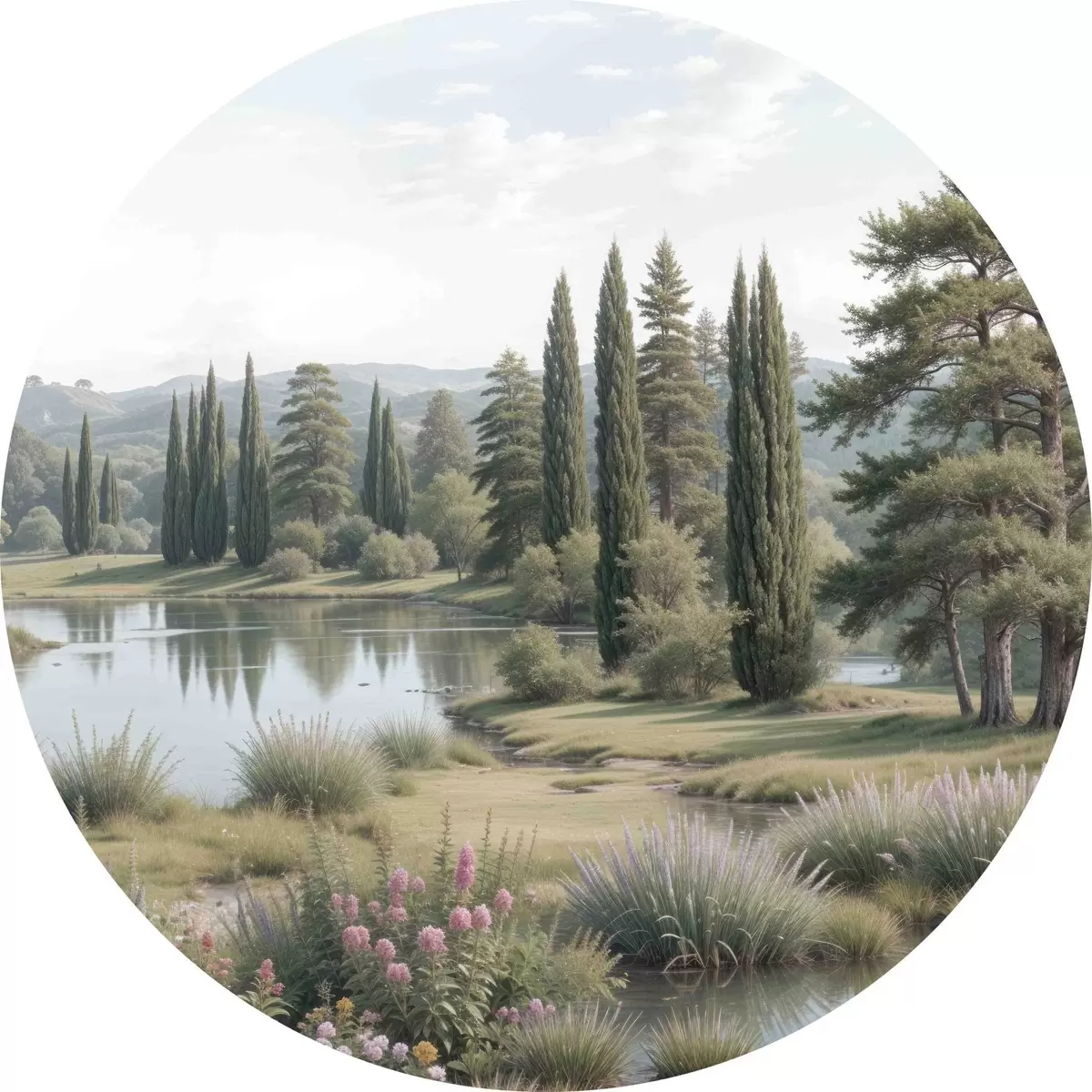 Pilt Rahulik maastik vaikse järvega, mida ümbritsevad männid, küpressid ja muu lopsakas taimestik Nr r40579