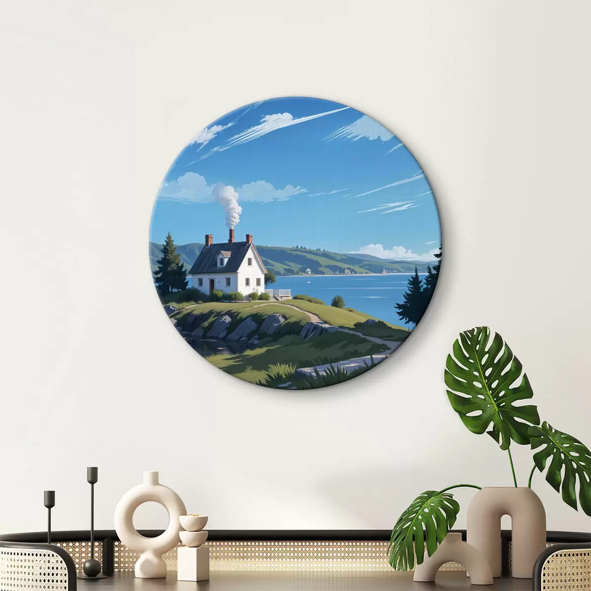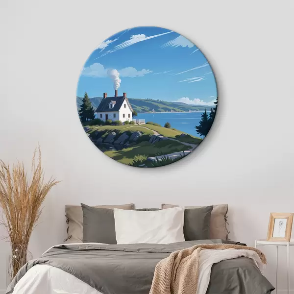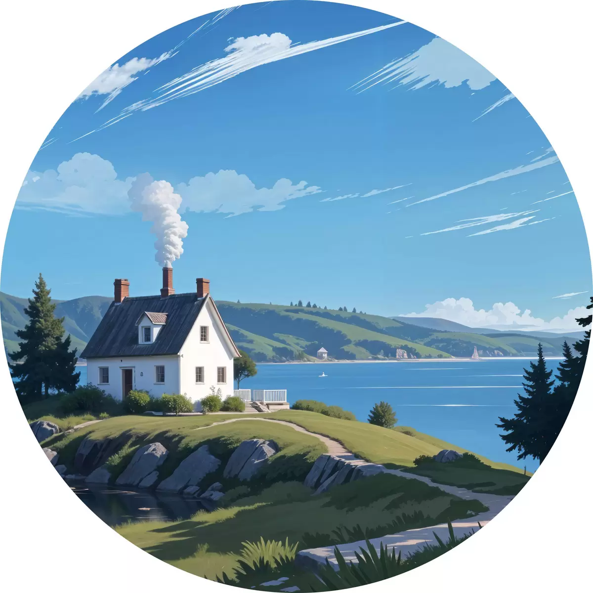 Pilt Valge maja rohukünkal, taustal mäed ja sinine taevas, kus on paisutatud pilved Nr r40587