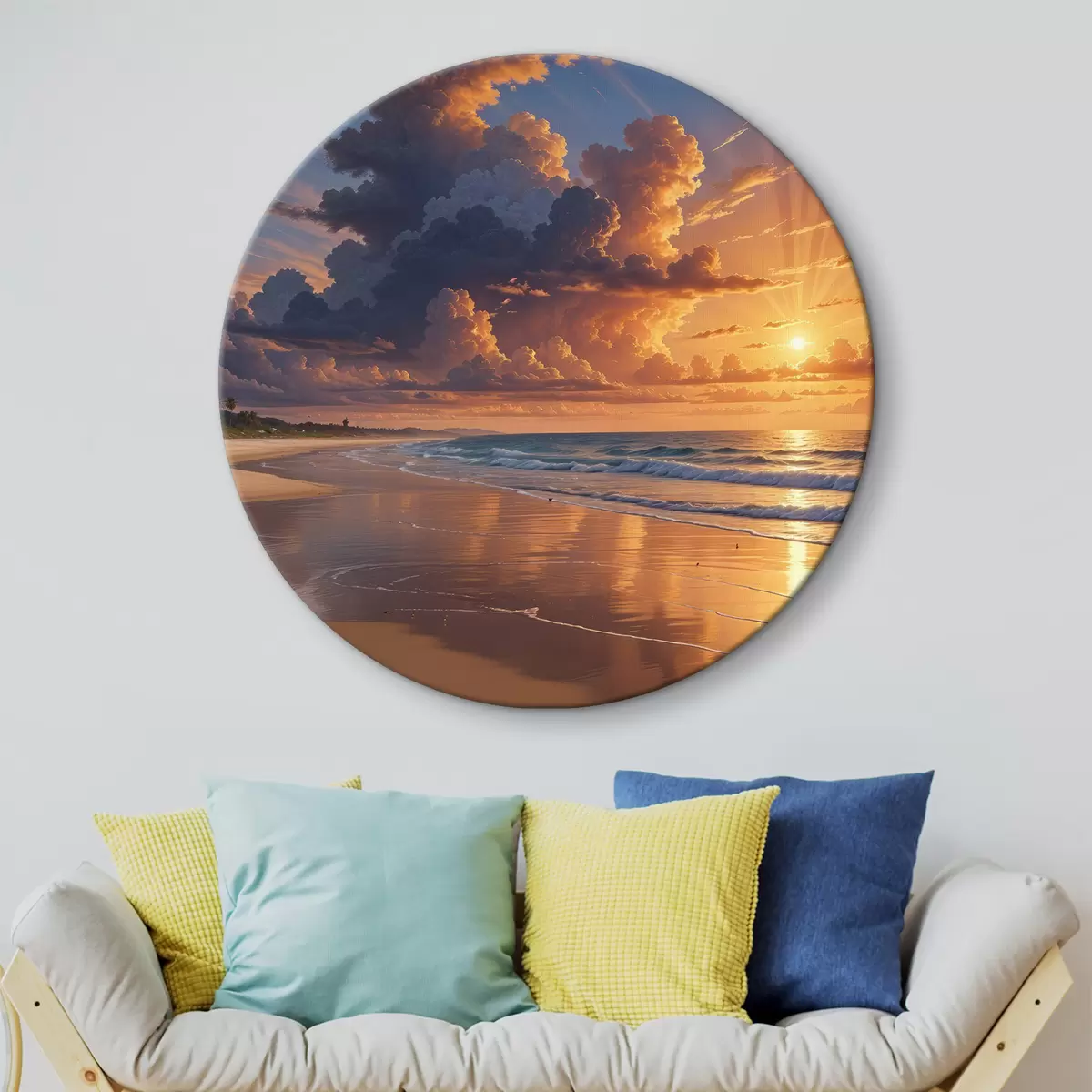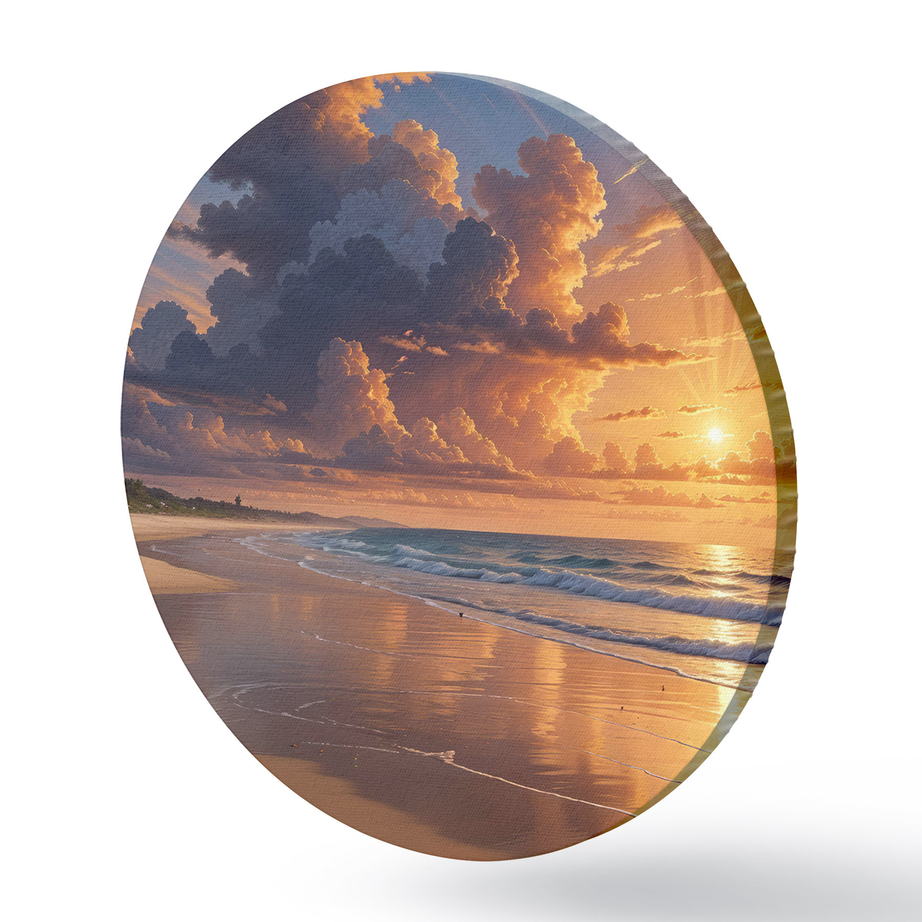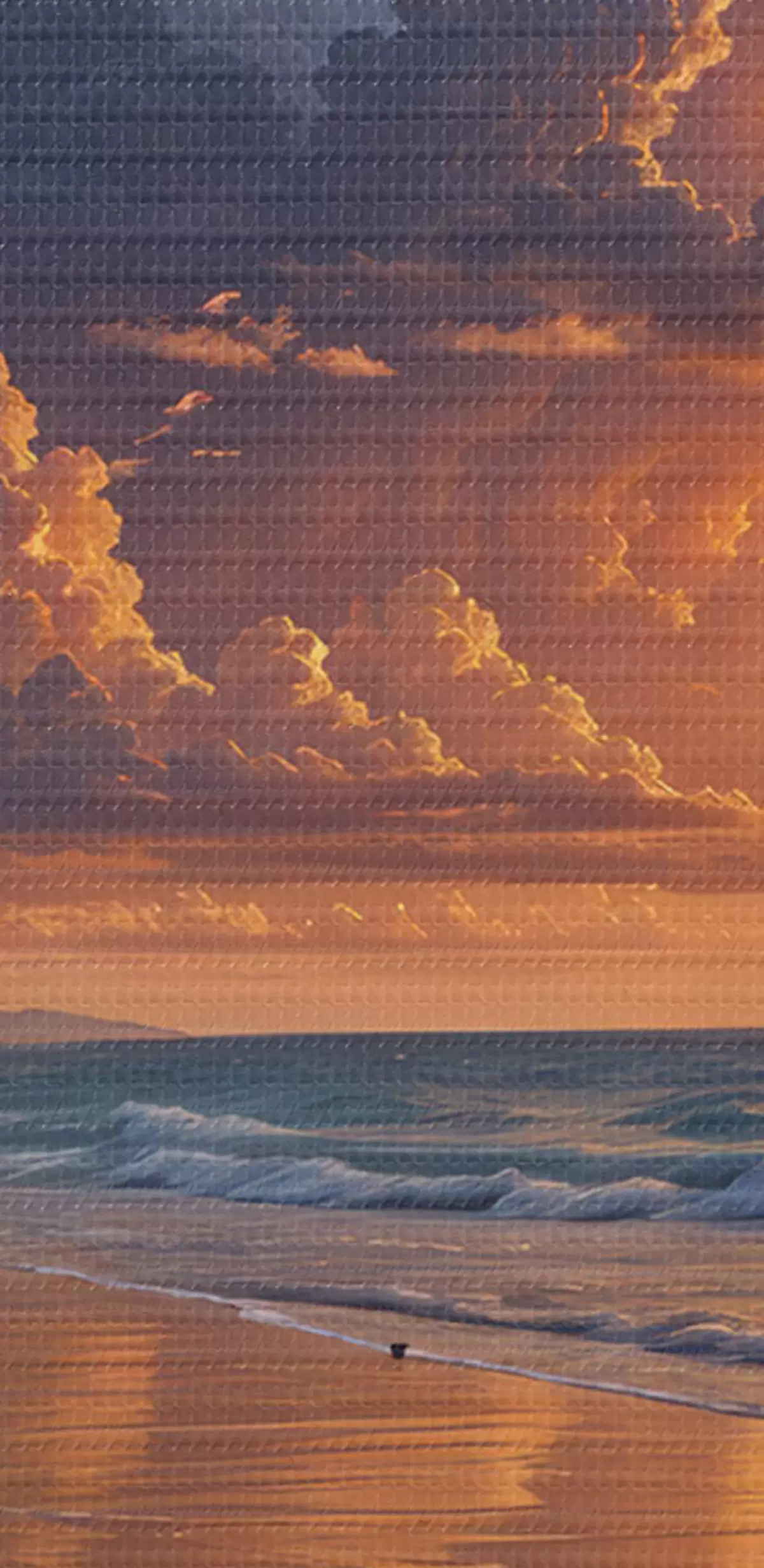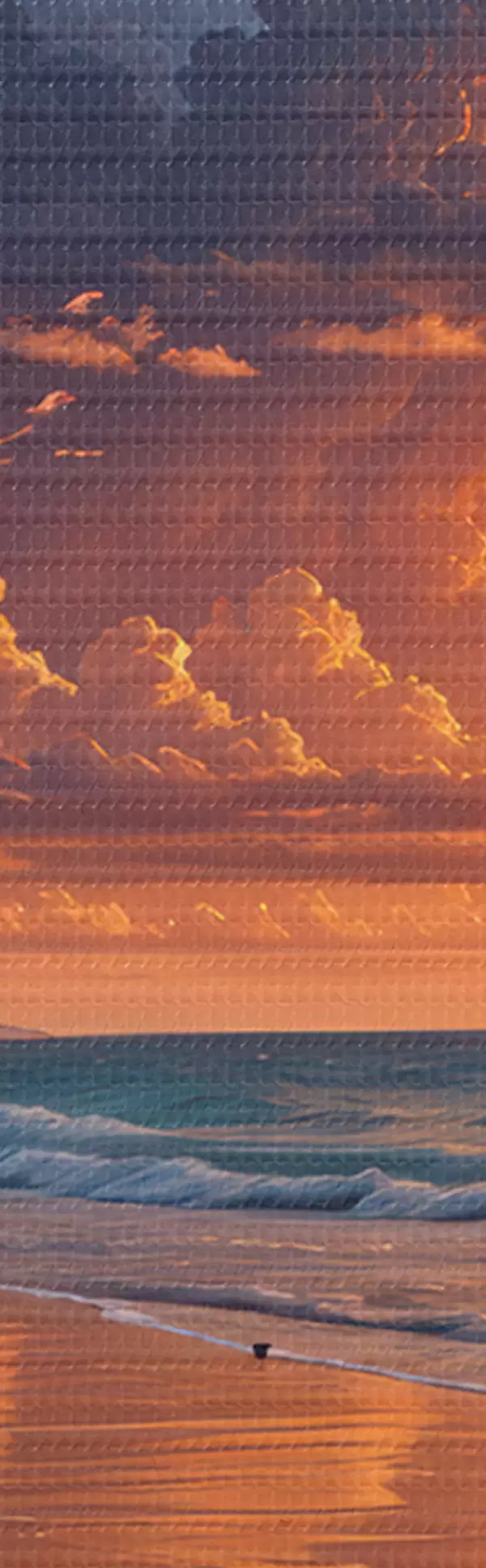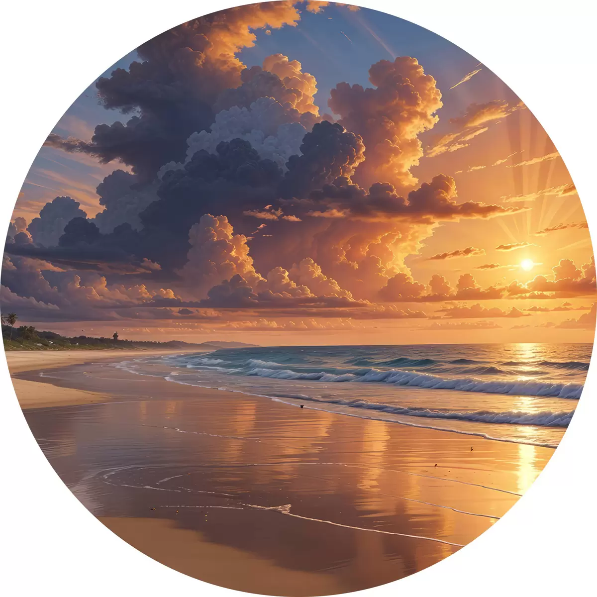 Pilt Dramaatiline päikeseloojang troopilise ranna kohal, kus rahulikus vees peegelduvad elurõõmsad oranžid ja roosad pilved Nr r40599