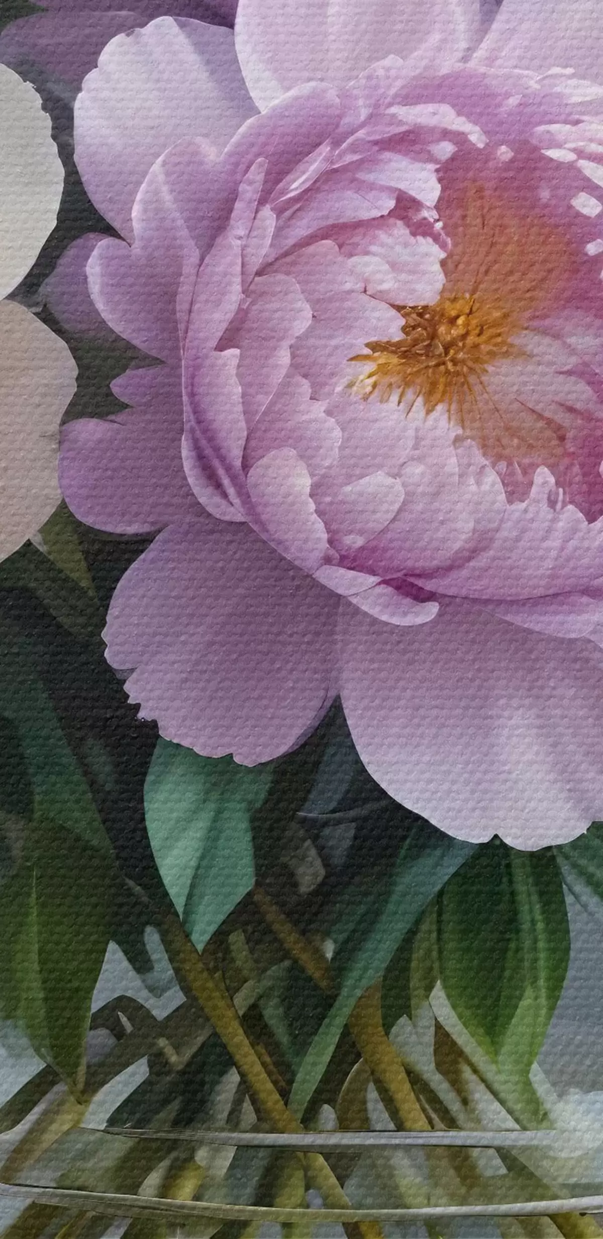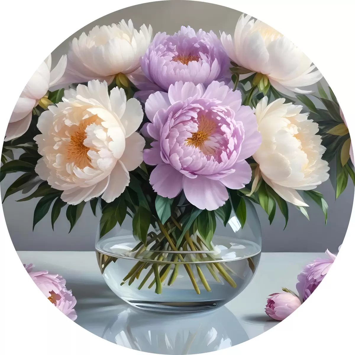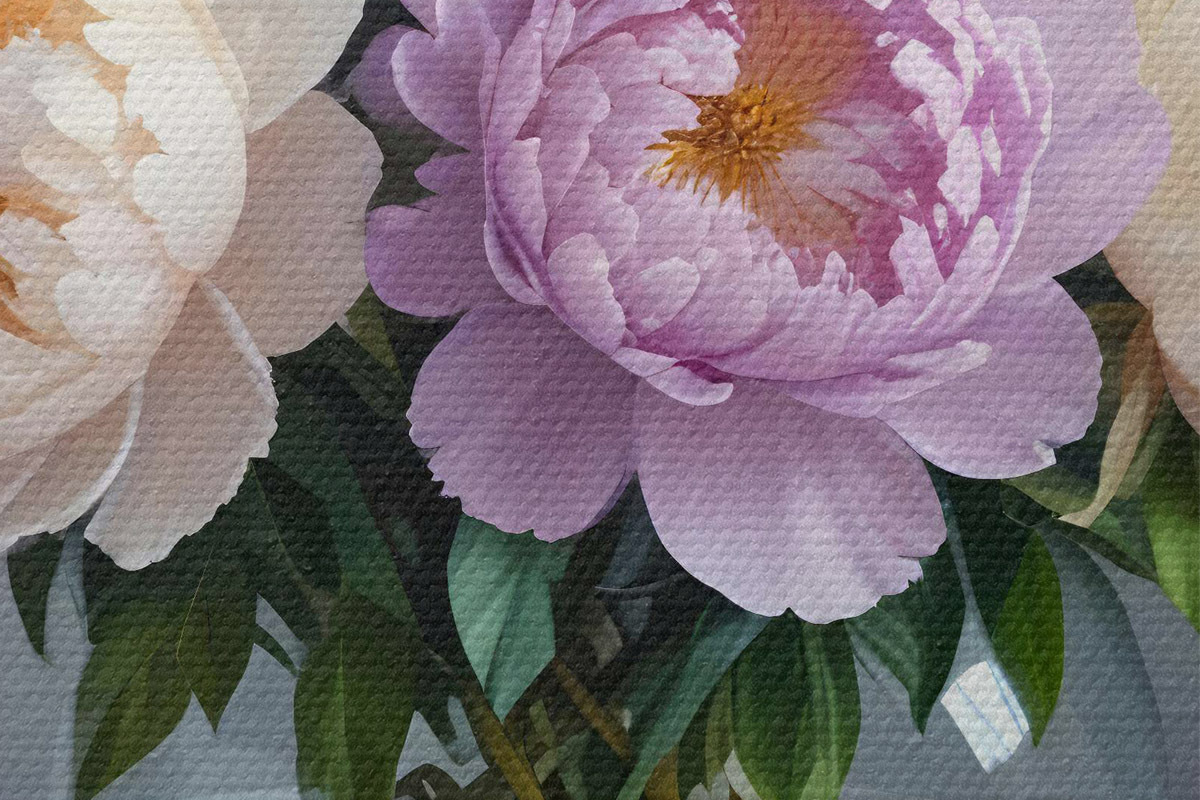 Pilt Suurtest, lopsakatest valgetest ja roosadest pioonidest koosnev kimp klaasvaasis hallil taustal Nr r40610