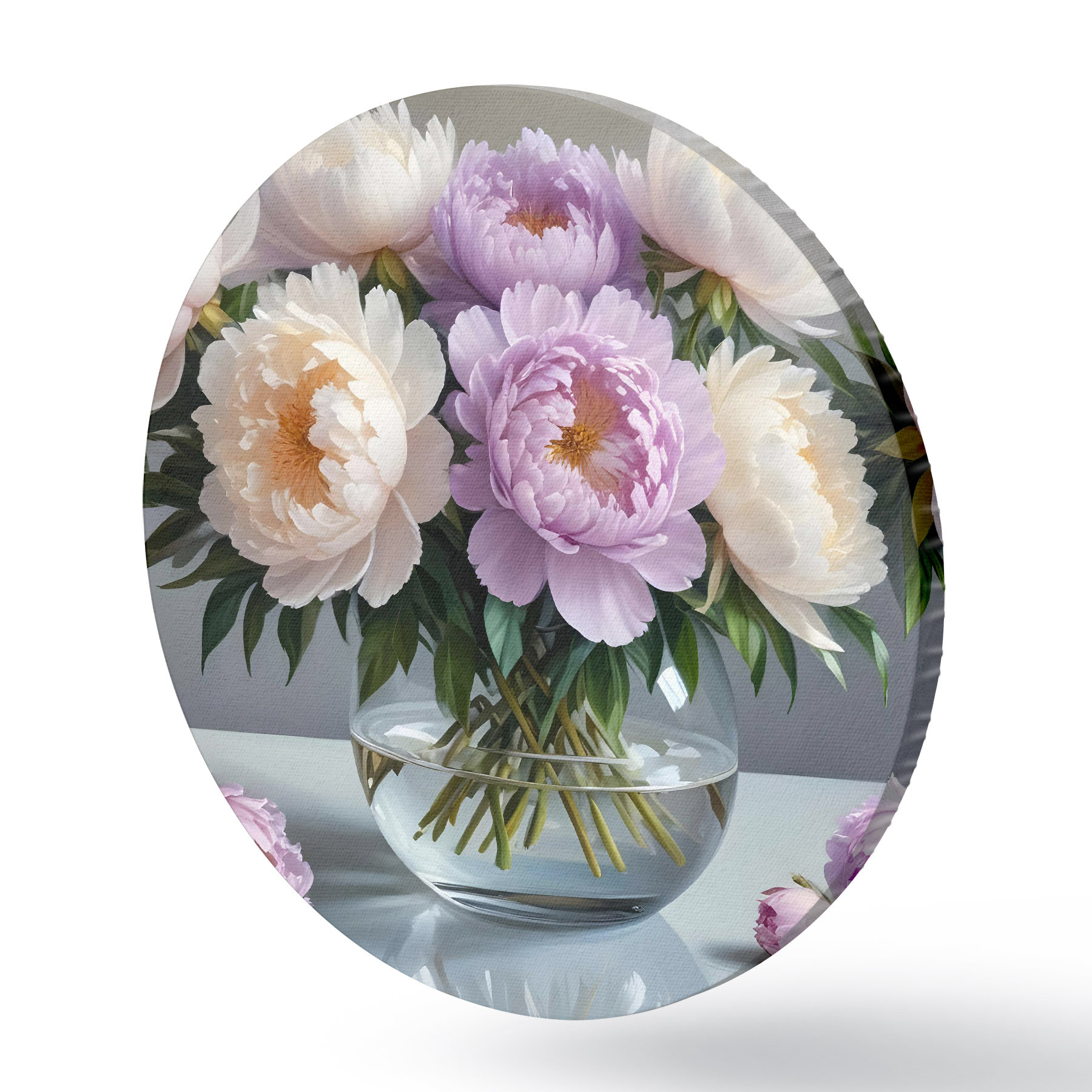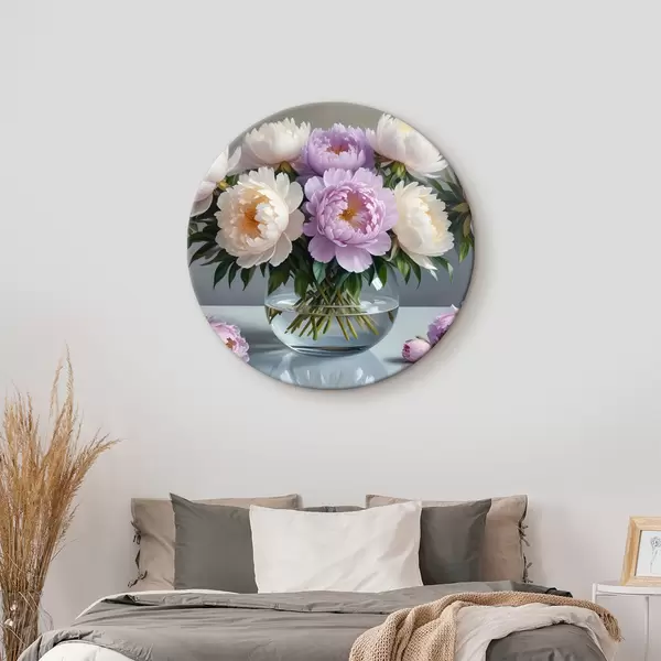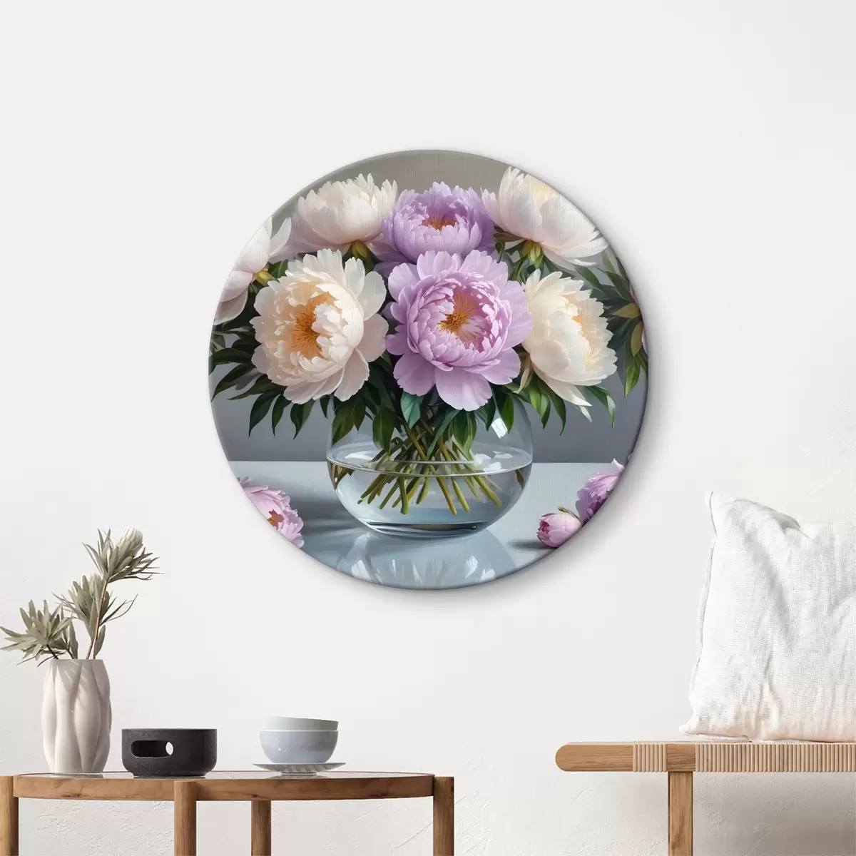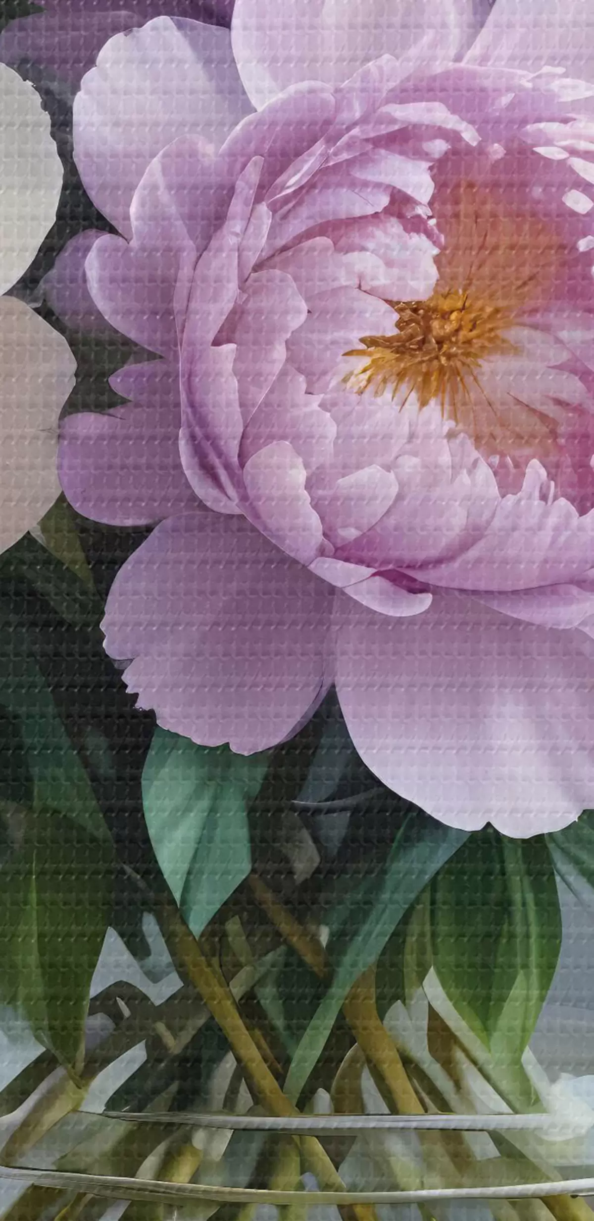 Pilt Suurtest, lopsakatest valgetest ja roosadest pioonidest koosnev kimp klaasvaasis hallil taustal Nr r40610