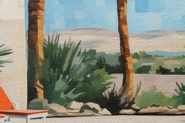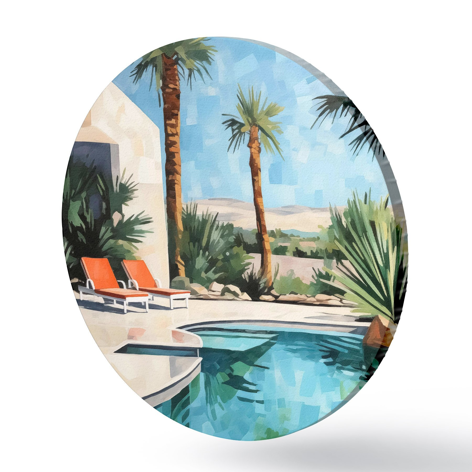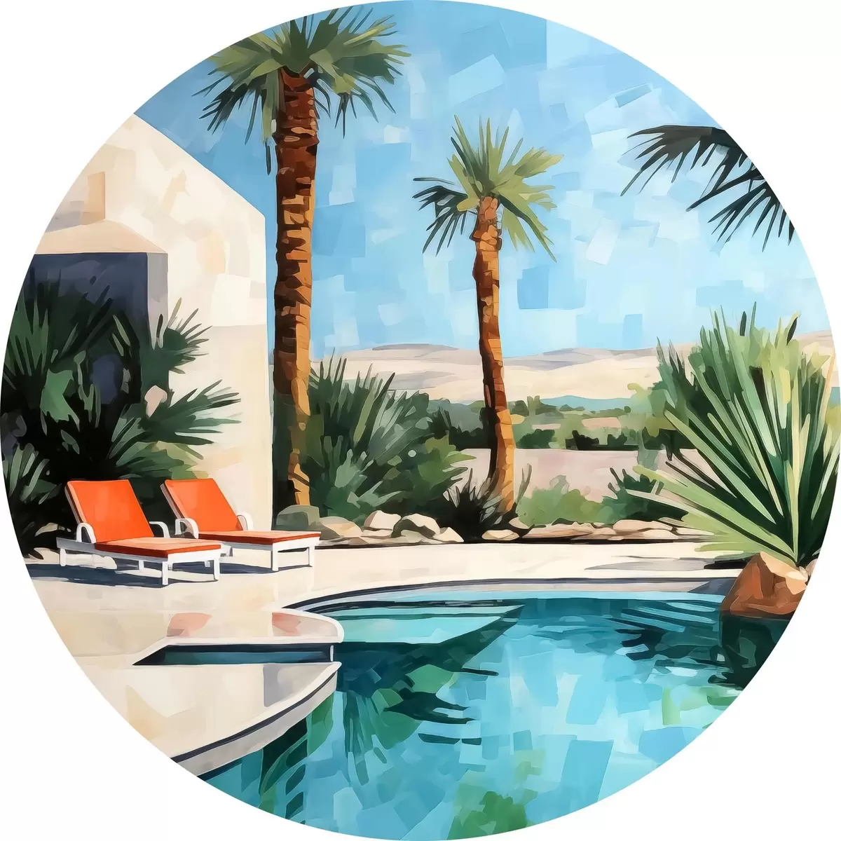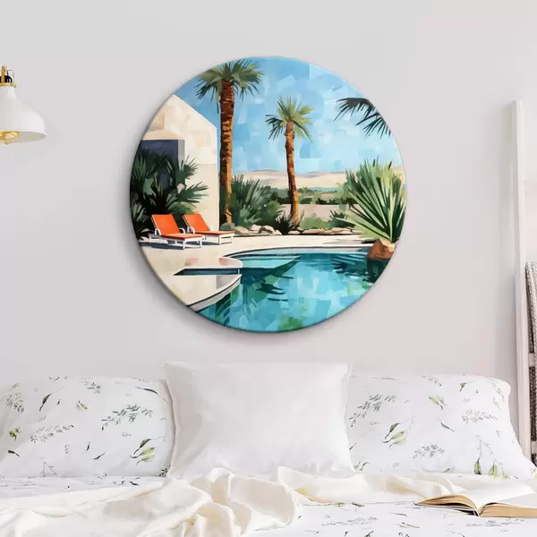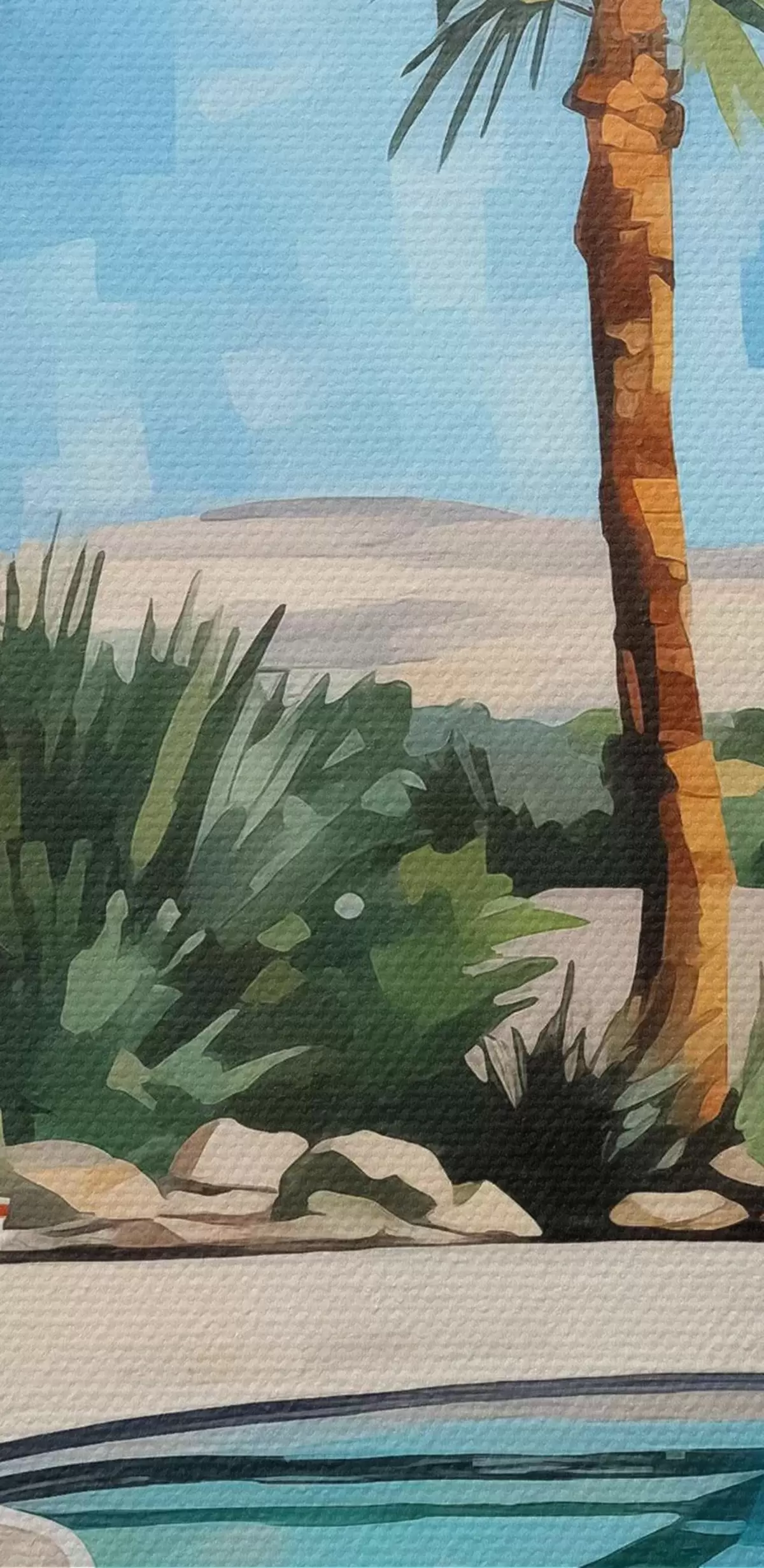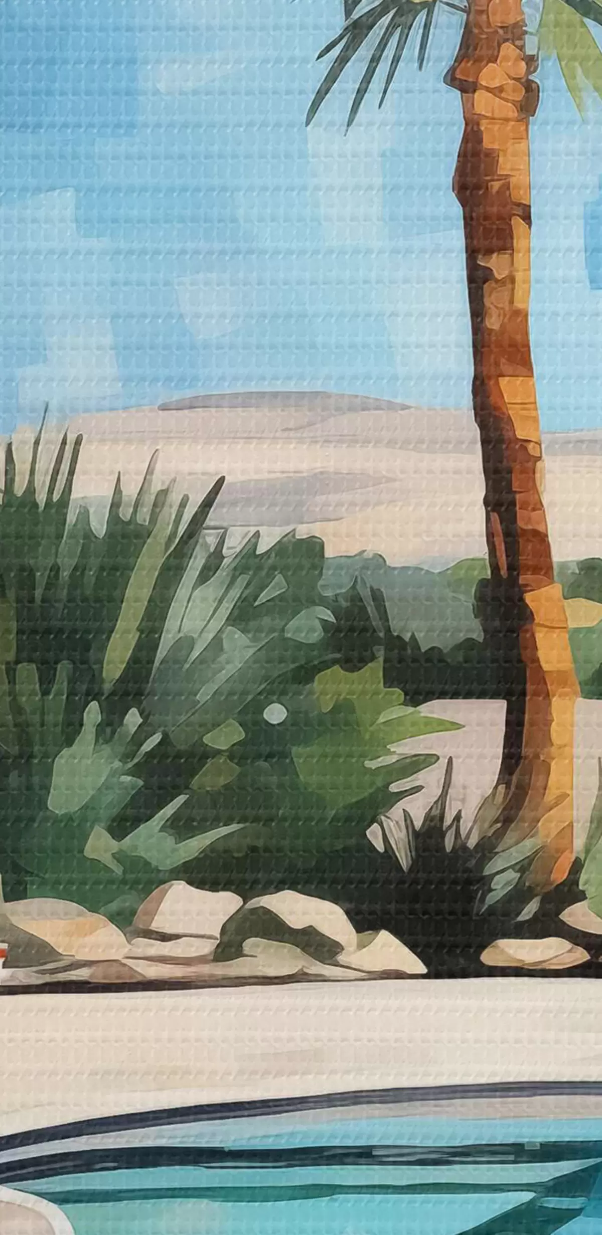 Pilt Palmipuud hotelli lähedal koos basseiniga kaljude lähedal, sinine, roheline, punane värvid Nr r40748