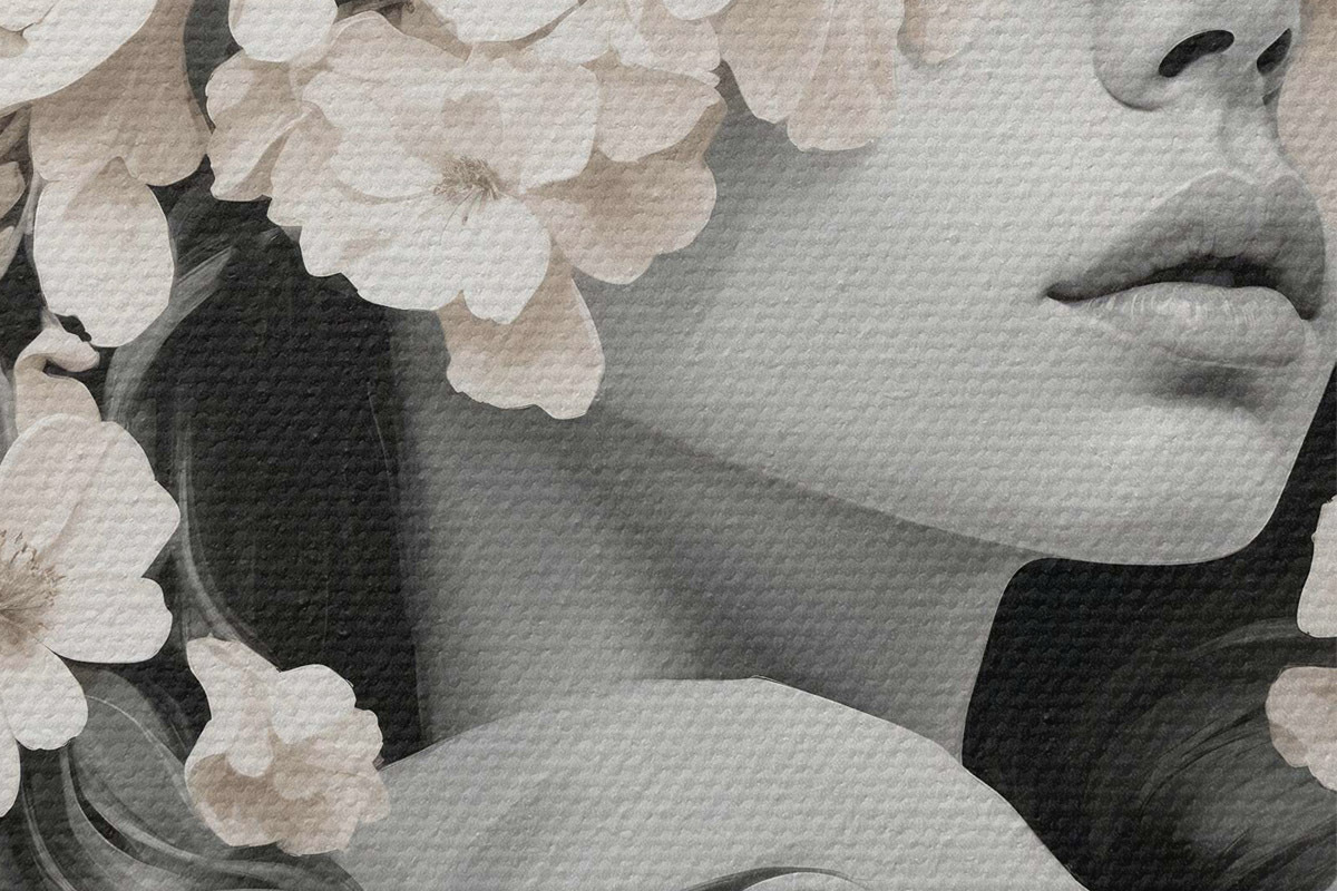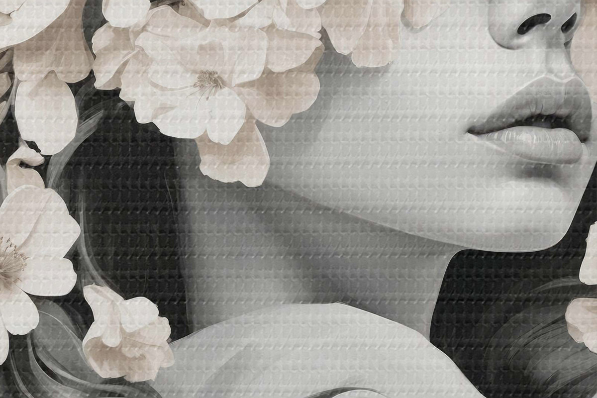 Pilt Tüdruk lilledega tema nägu musta ja valge värvi Nr r40849