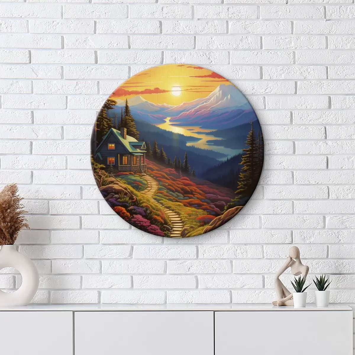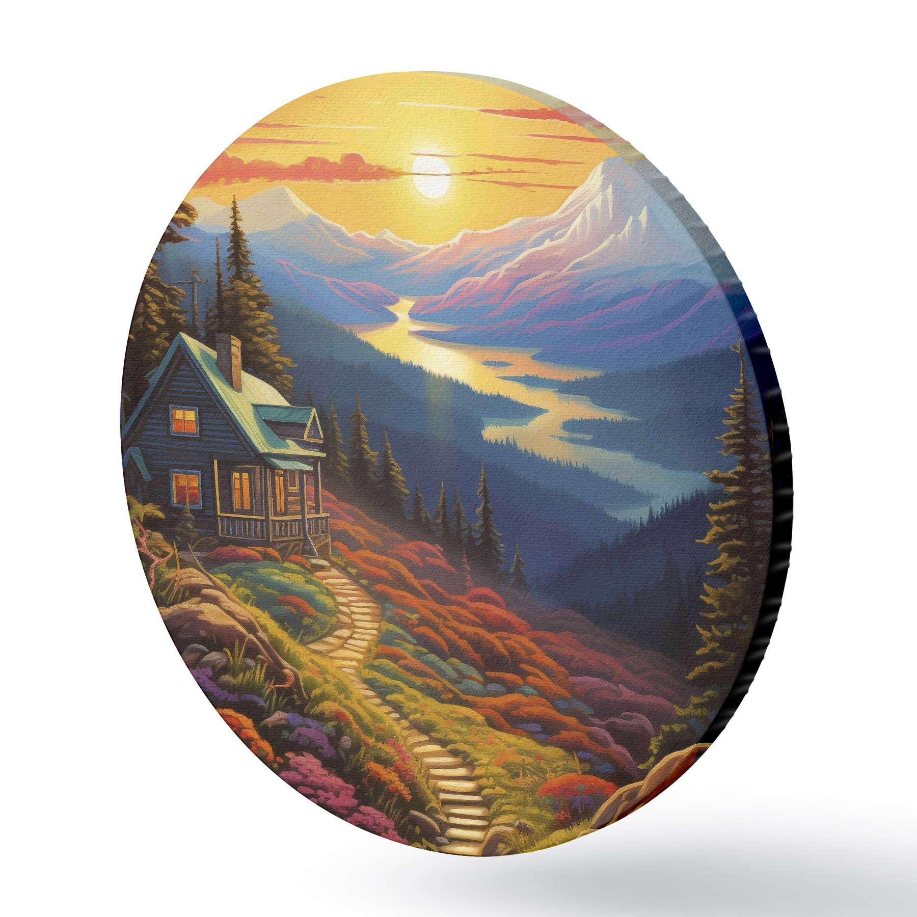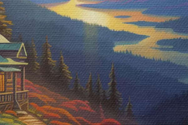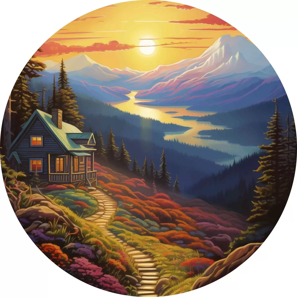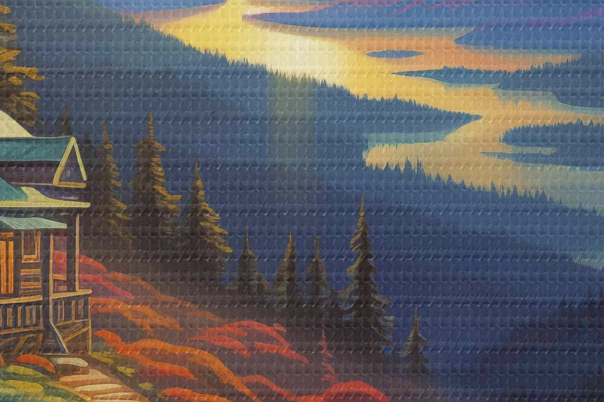 Pilt Värviline maastik koos mägede ja puumaja, päikeseloojangu värvid Nr r40941