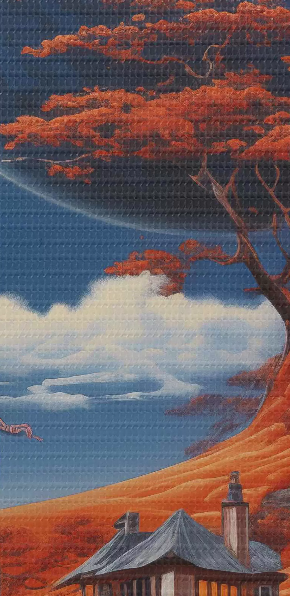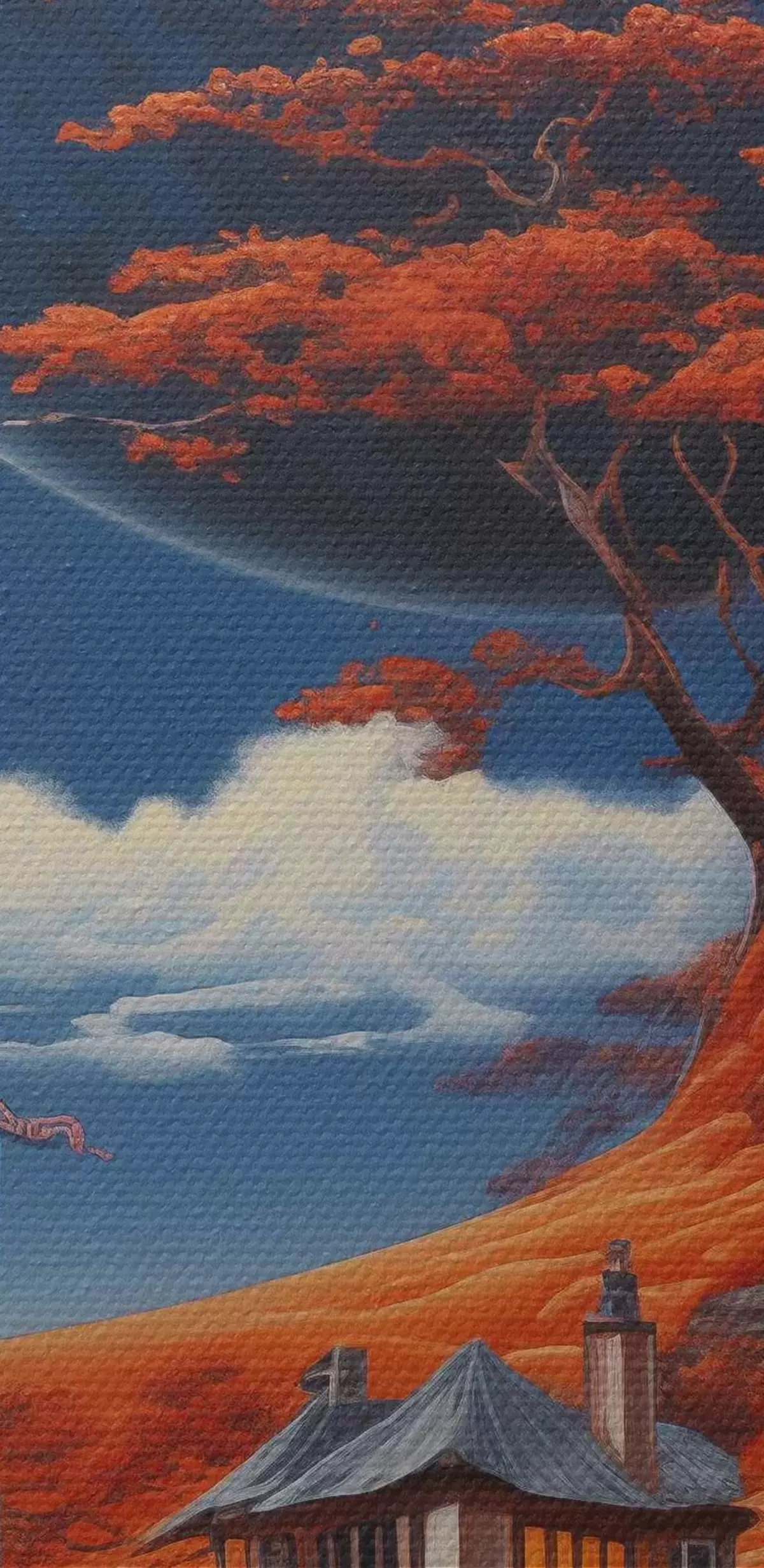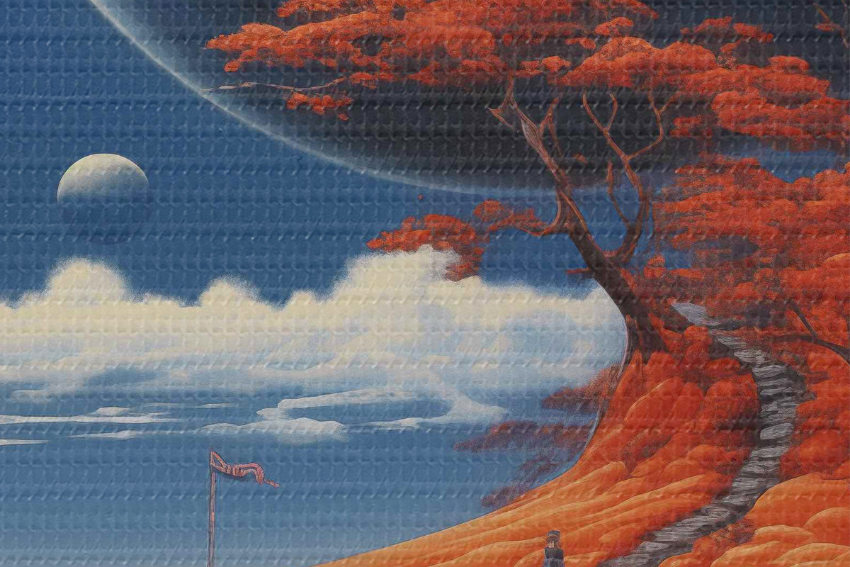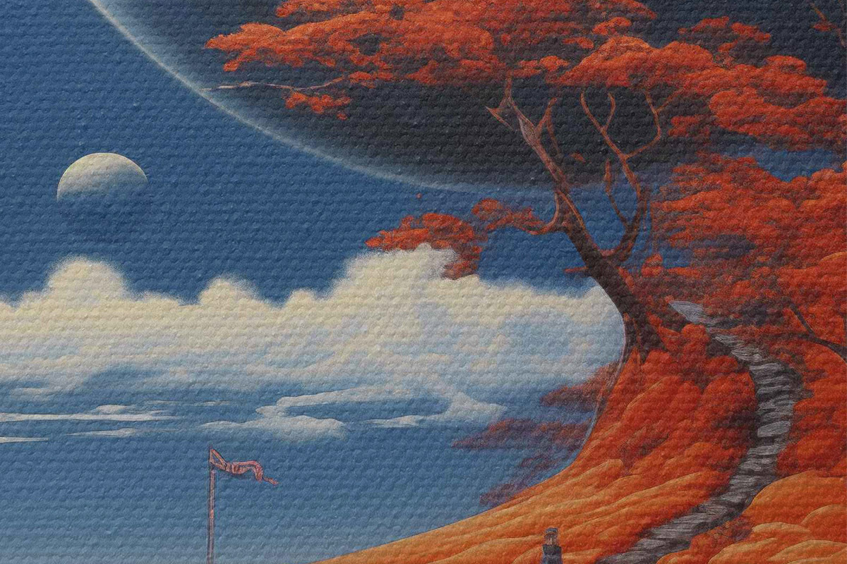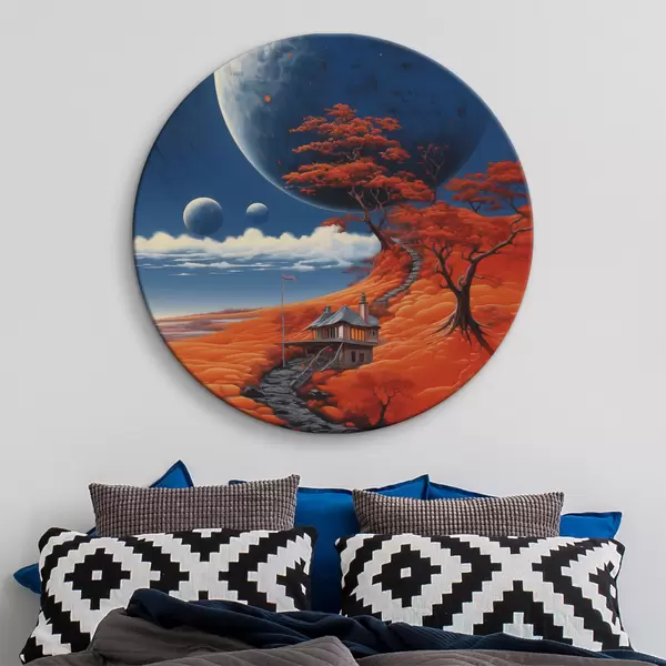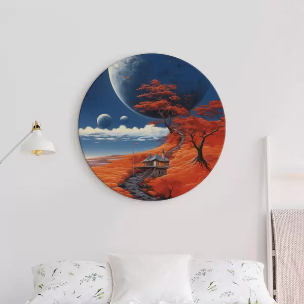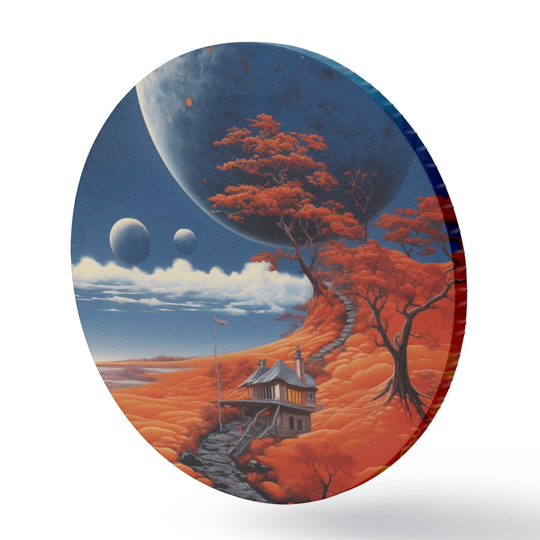 Pilt Kosmoseillustratsioon, planeedid, sinine taevas, maja mäel, puud Nr r40946