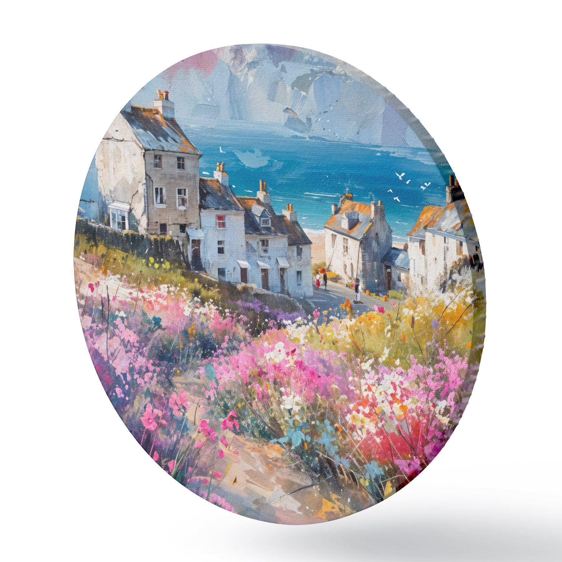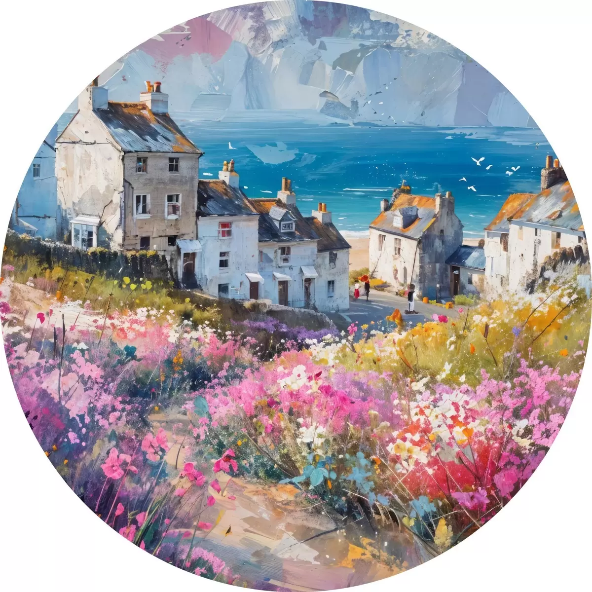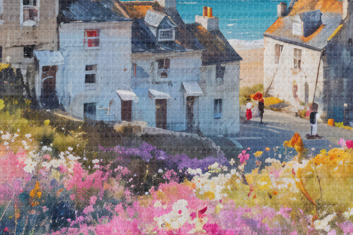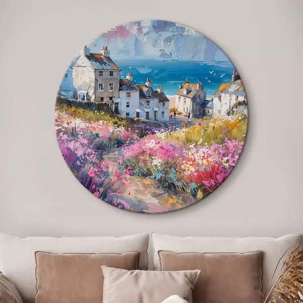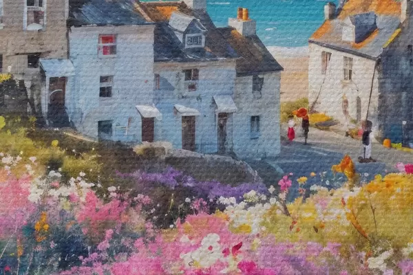 Pilt Värviline õlimaal, mis kujutab mereäärset linna valgete majade ja elava lilleaiaga esiplaanil Nr r41090