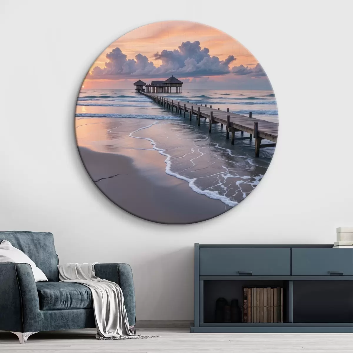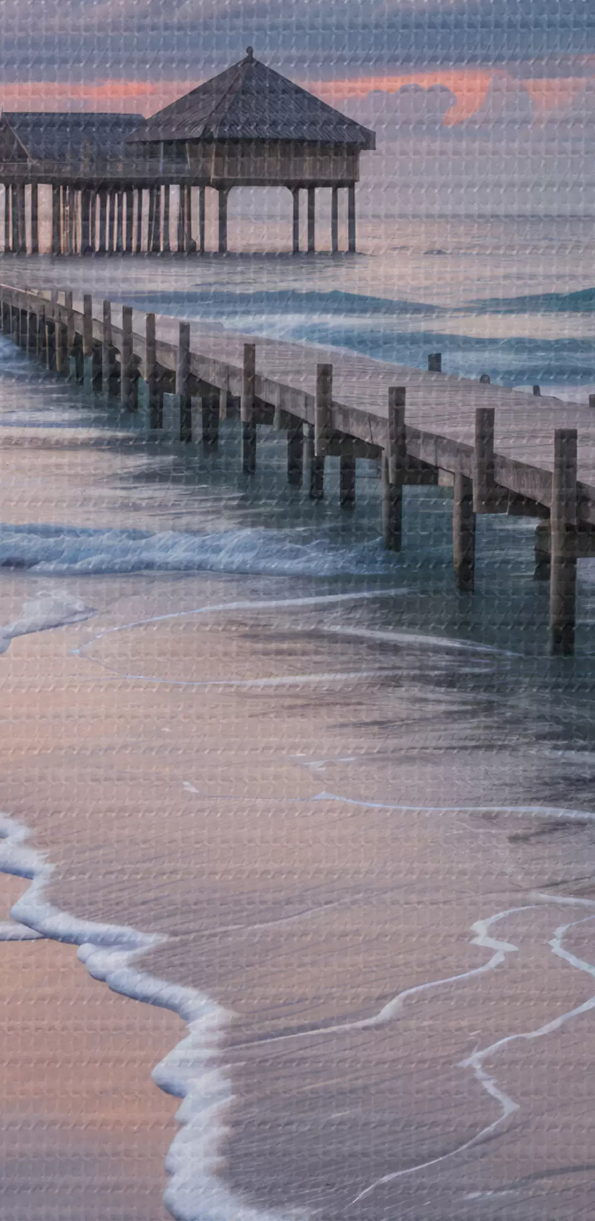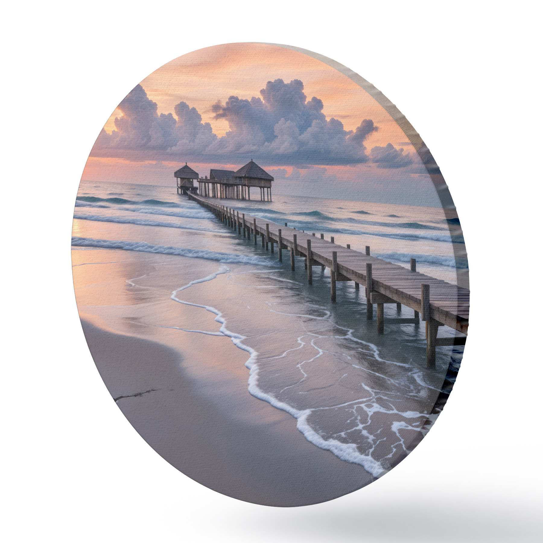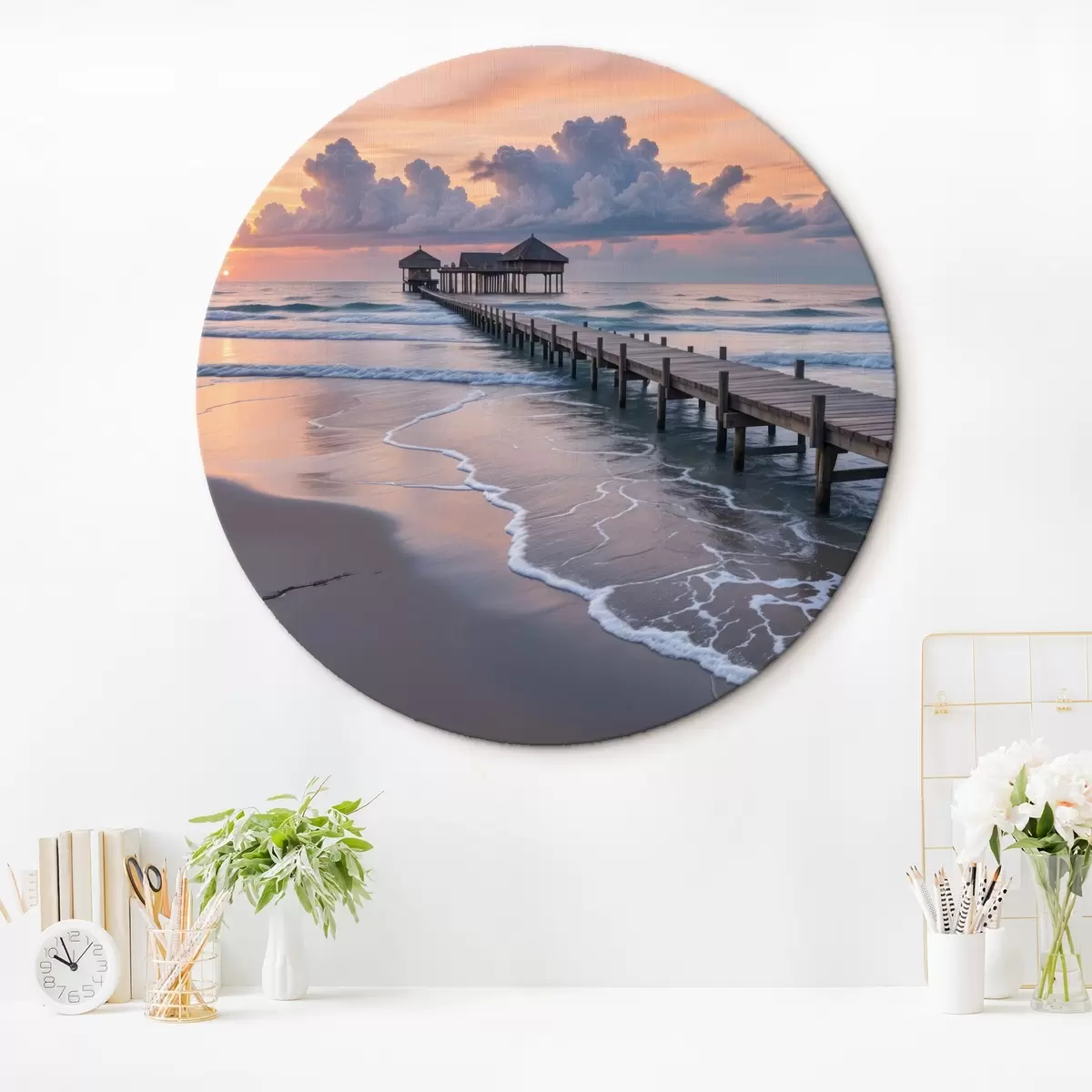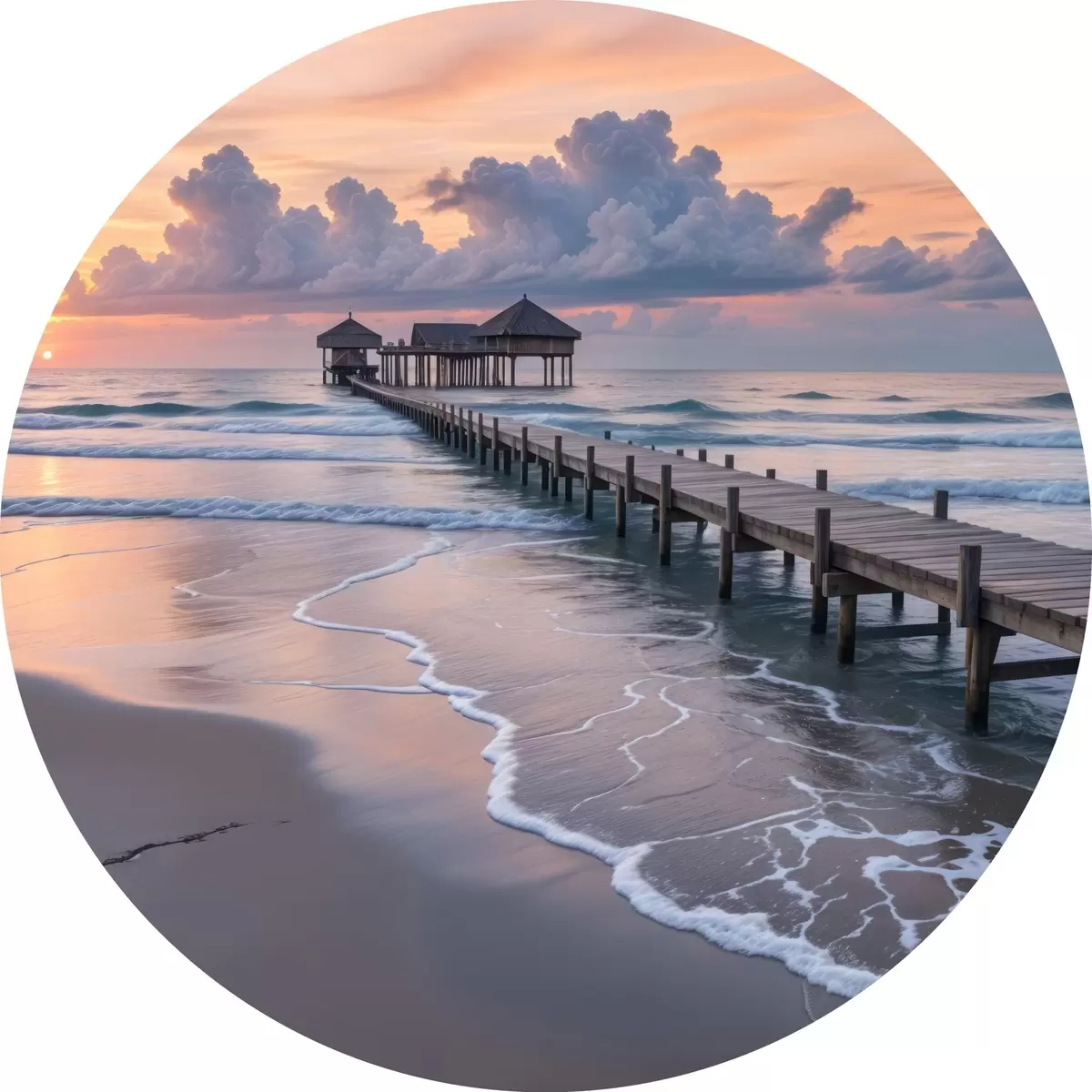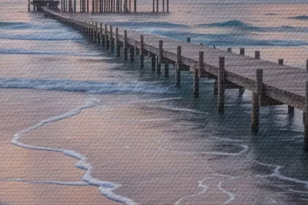 Pilt Puidust muulid vaatega rahulikule ookeanile päikeseloojangul koos värviliste pilvedega Nr r41091