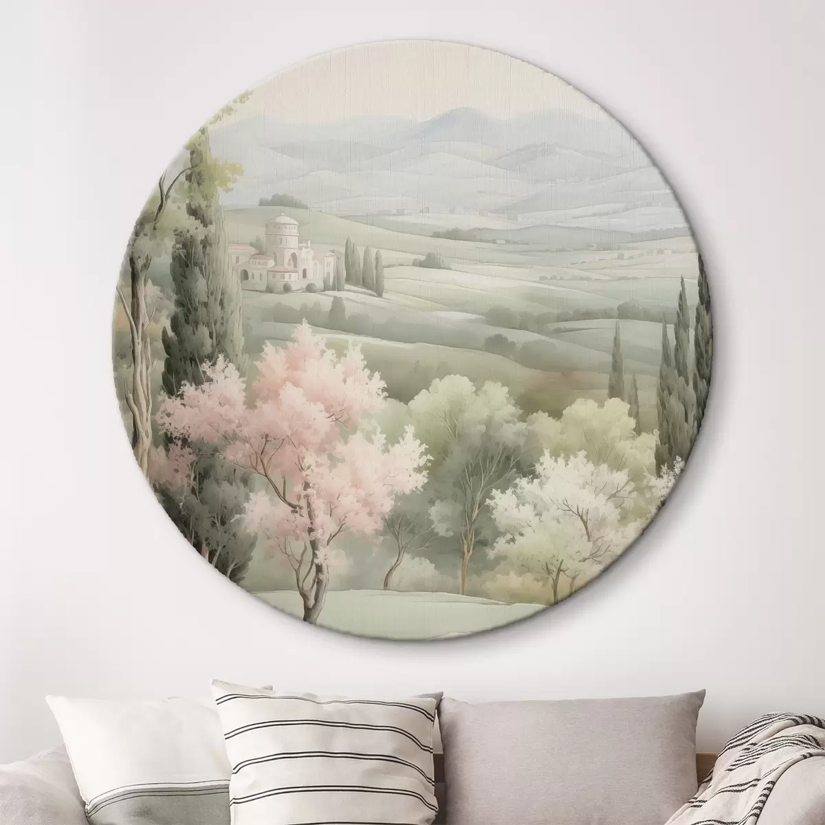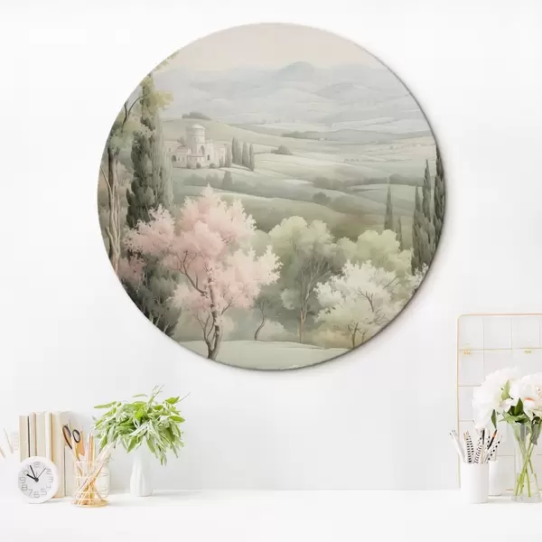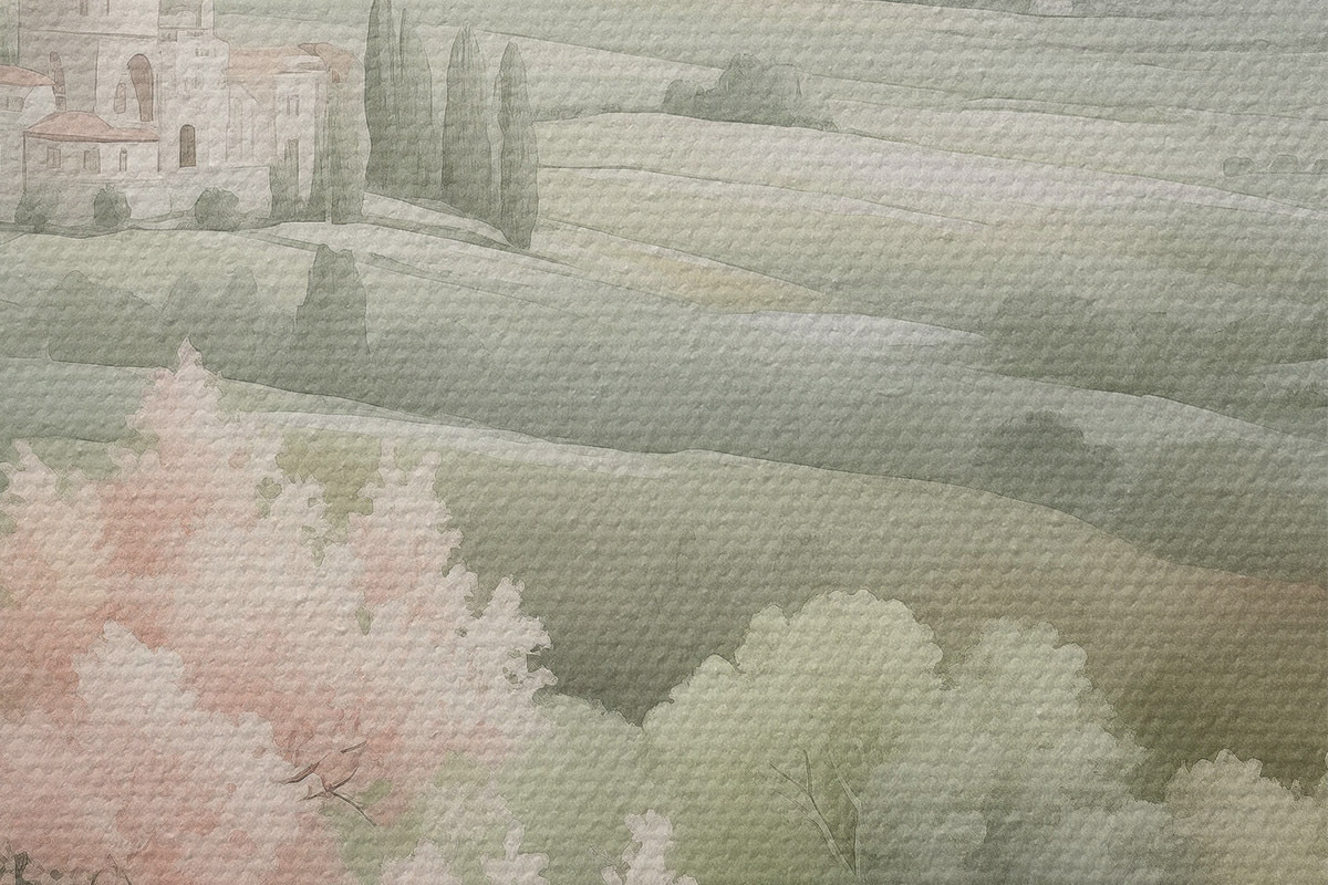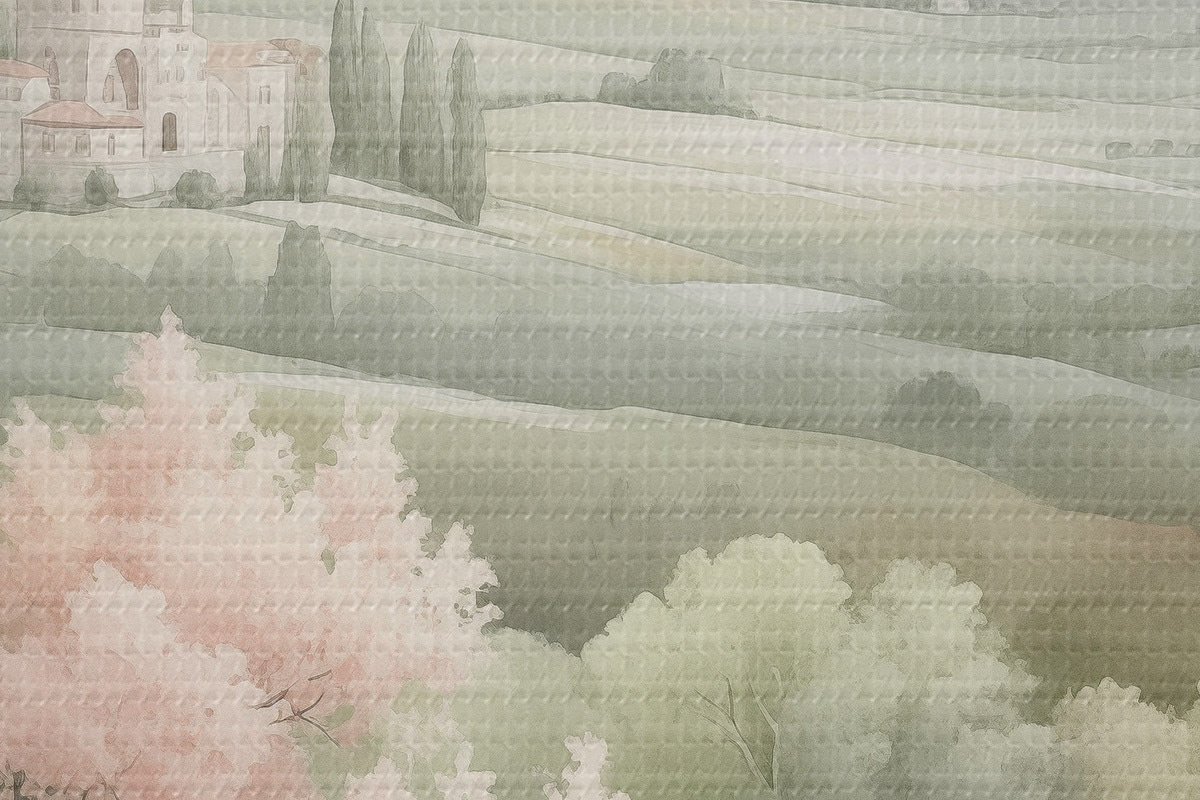 Pilt Akvarell loodus, õrnad värvid, roosid, puud, rohelised künkad Nr r41223