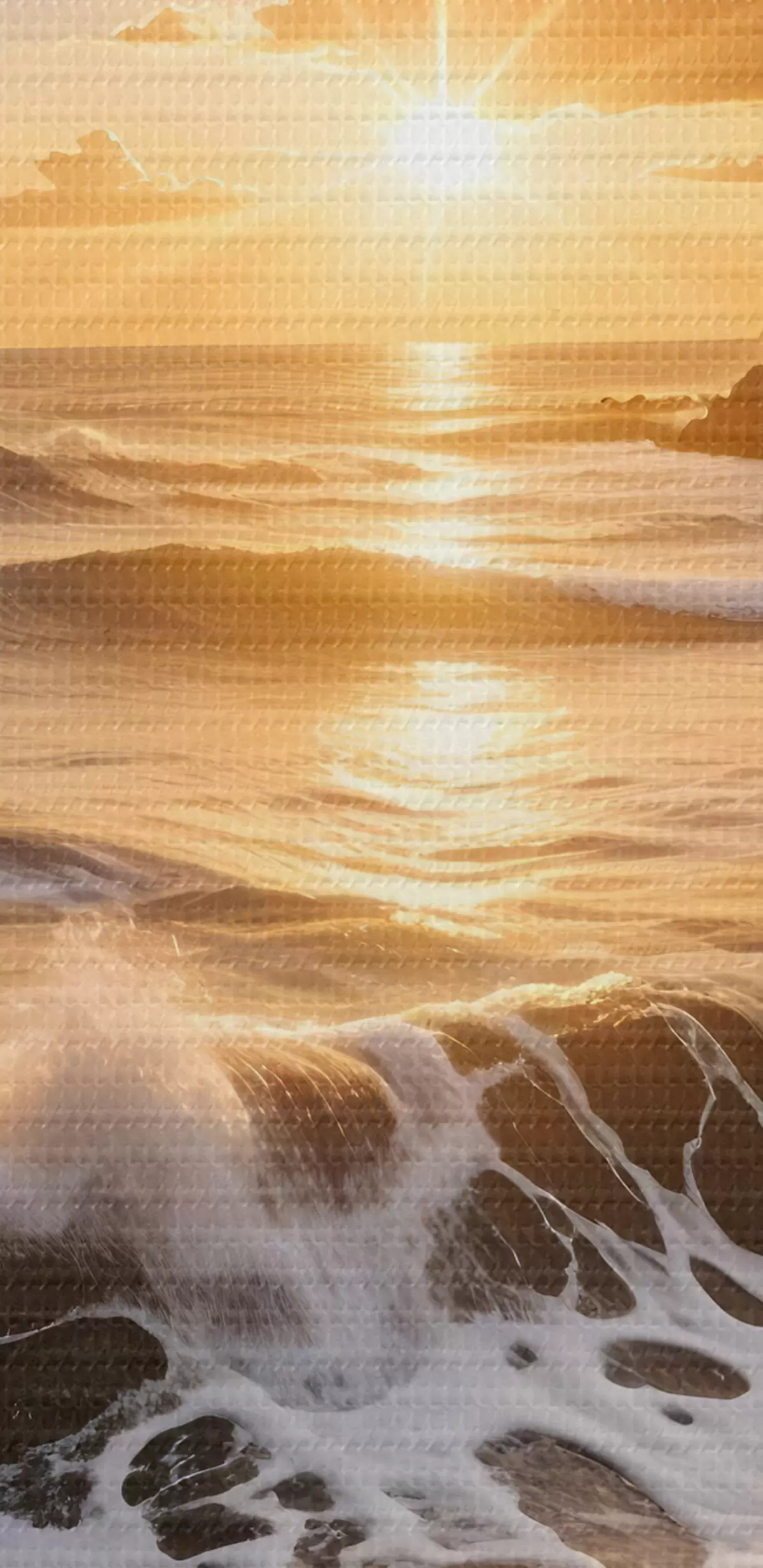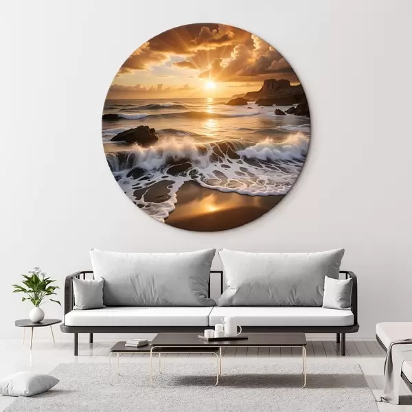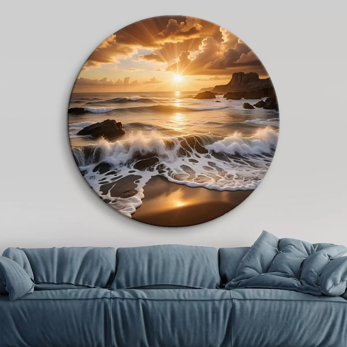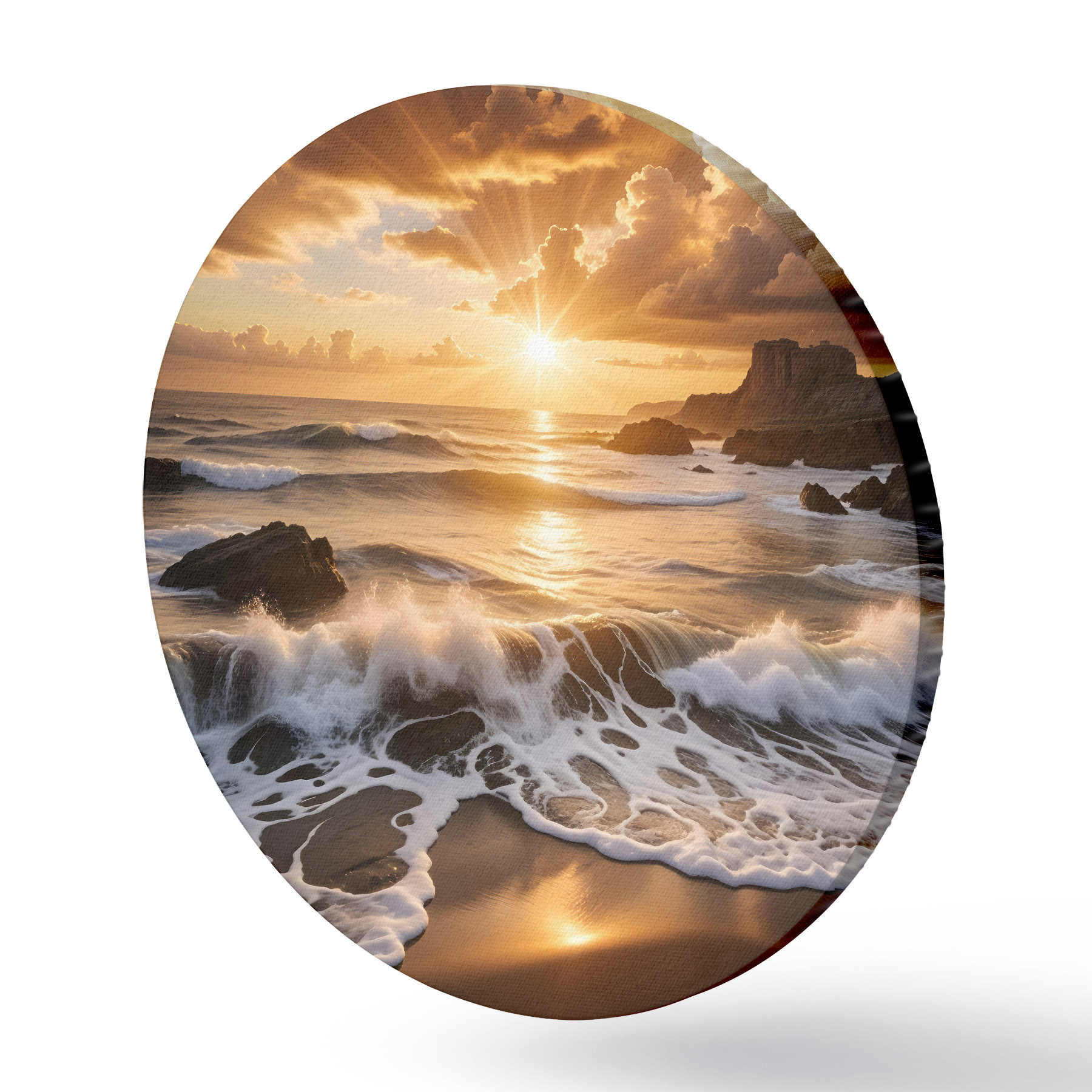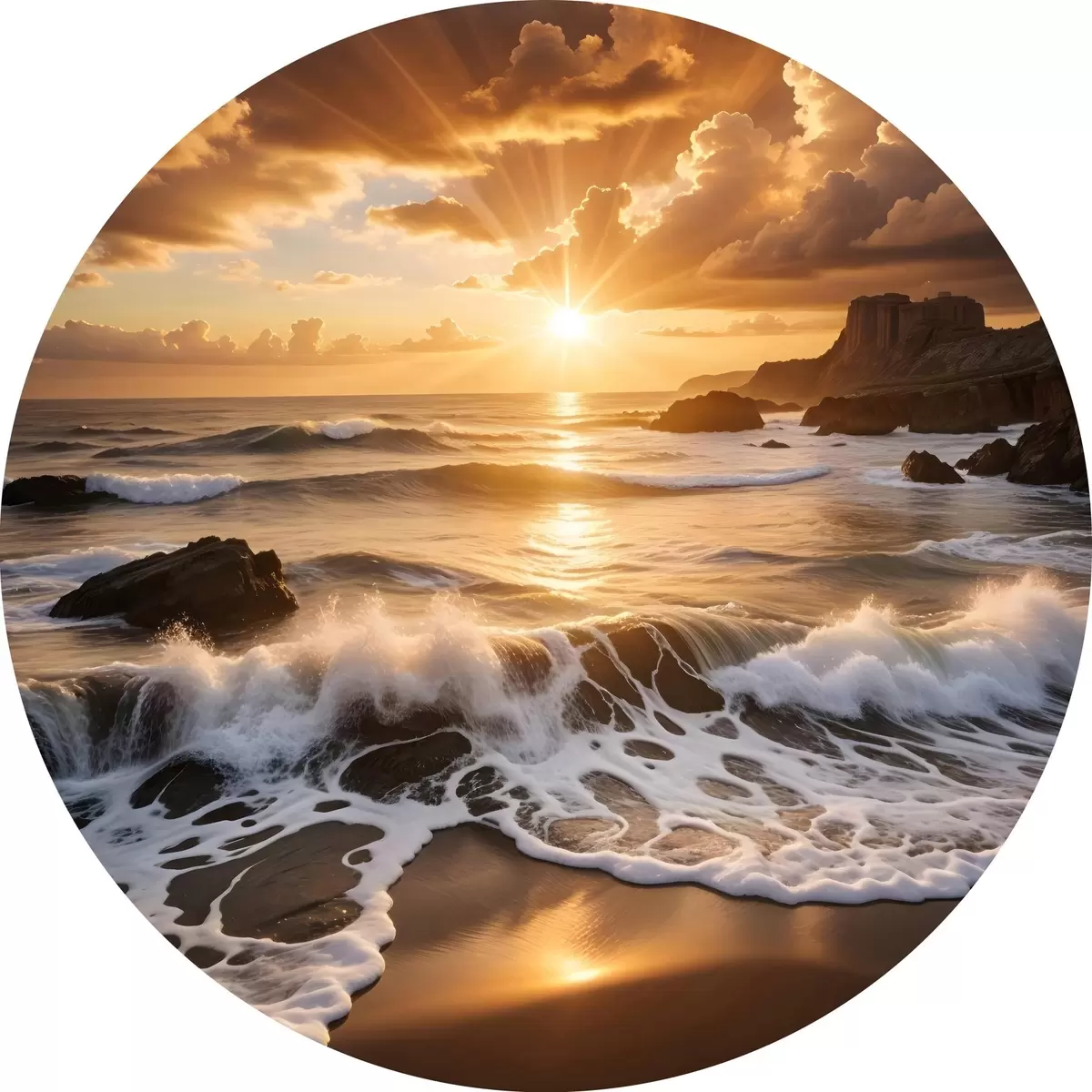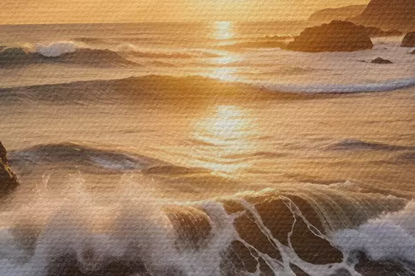 Pilt Dramaatiline päikeseloojang kaljuranniku kohal, lainete mürisemise ja dramaatiliste pilvedega taevas Nr r41245