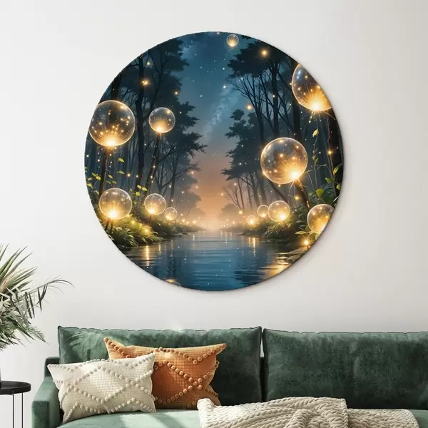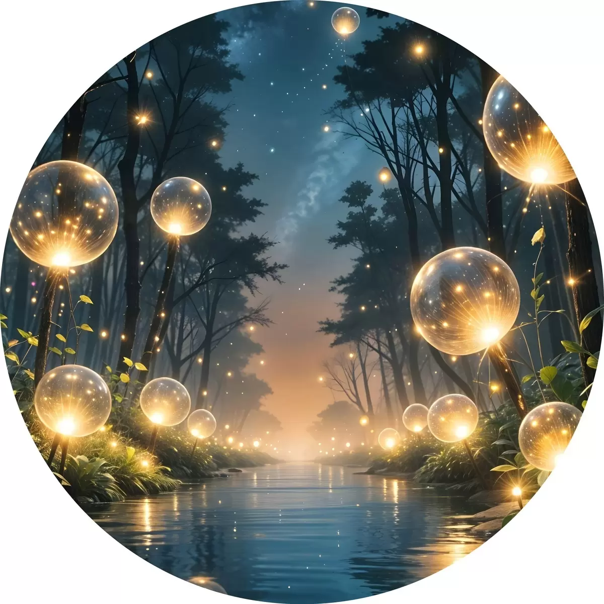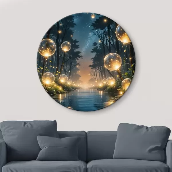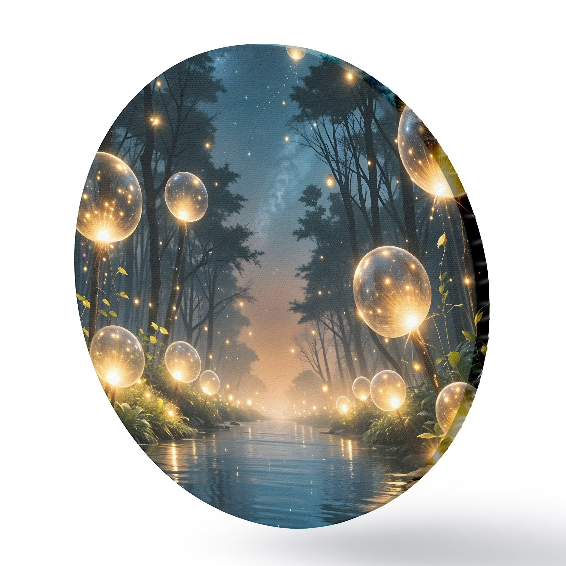 Ümmargused maalid Maagiline mets öösel, kus puude vahel hõljuvad kollased kuulid ja tulikesed, mis loovad lummava atmosfääri r41259