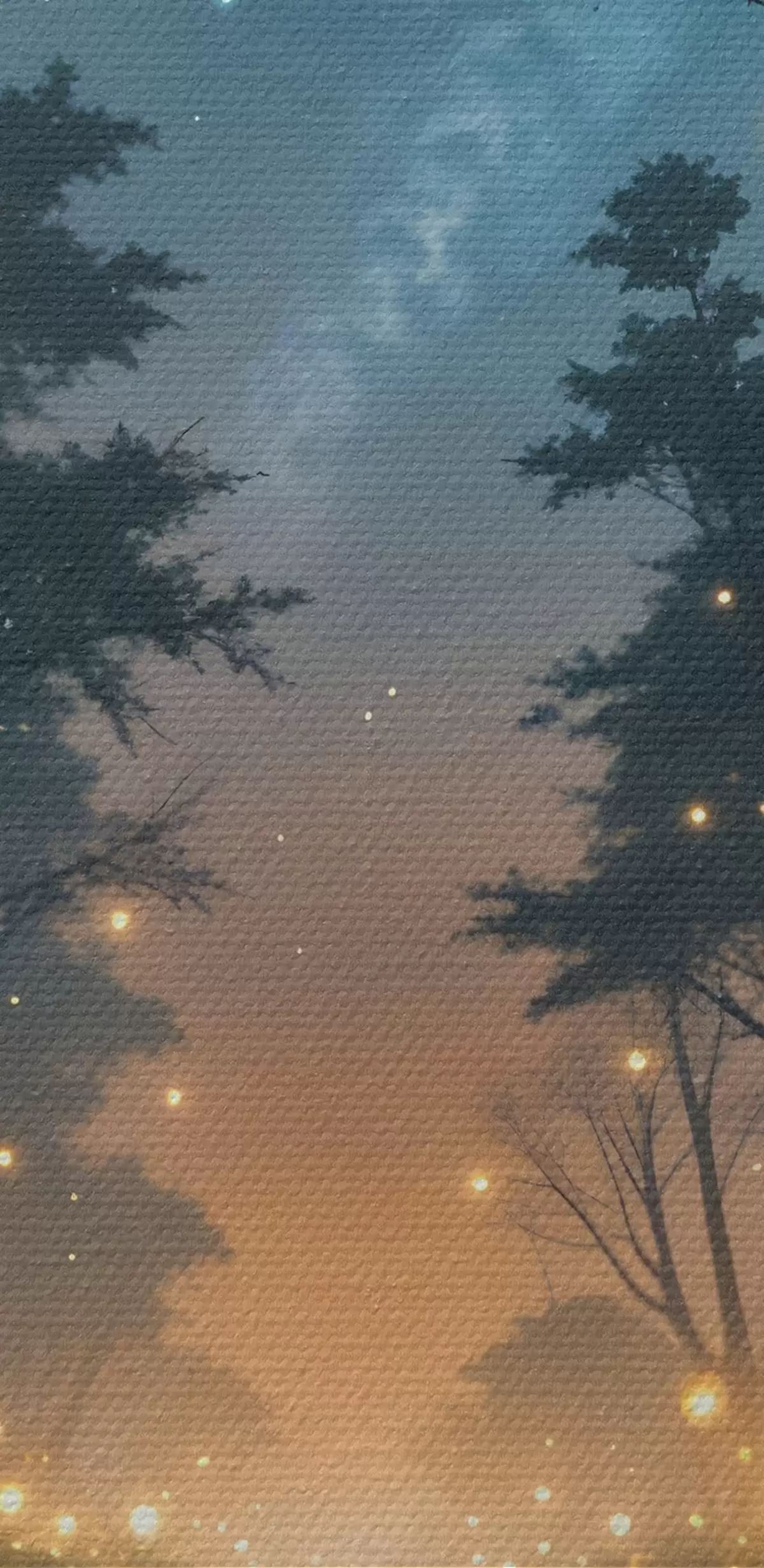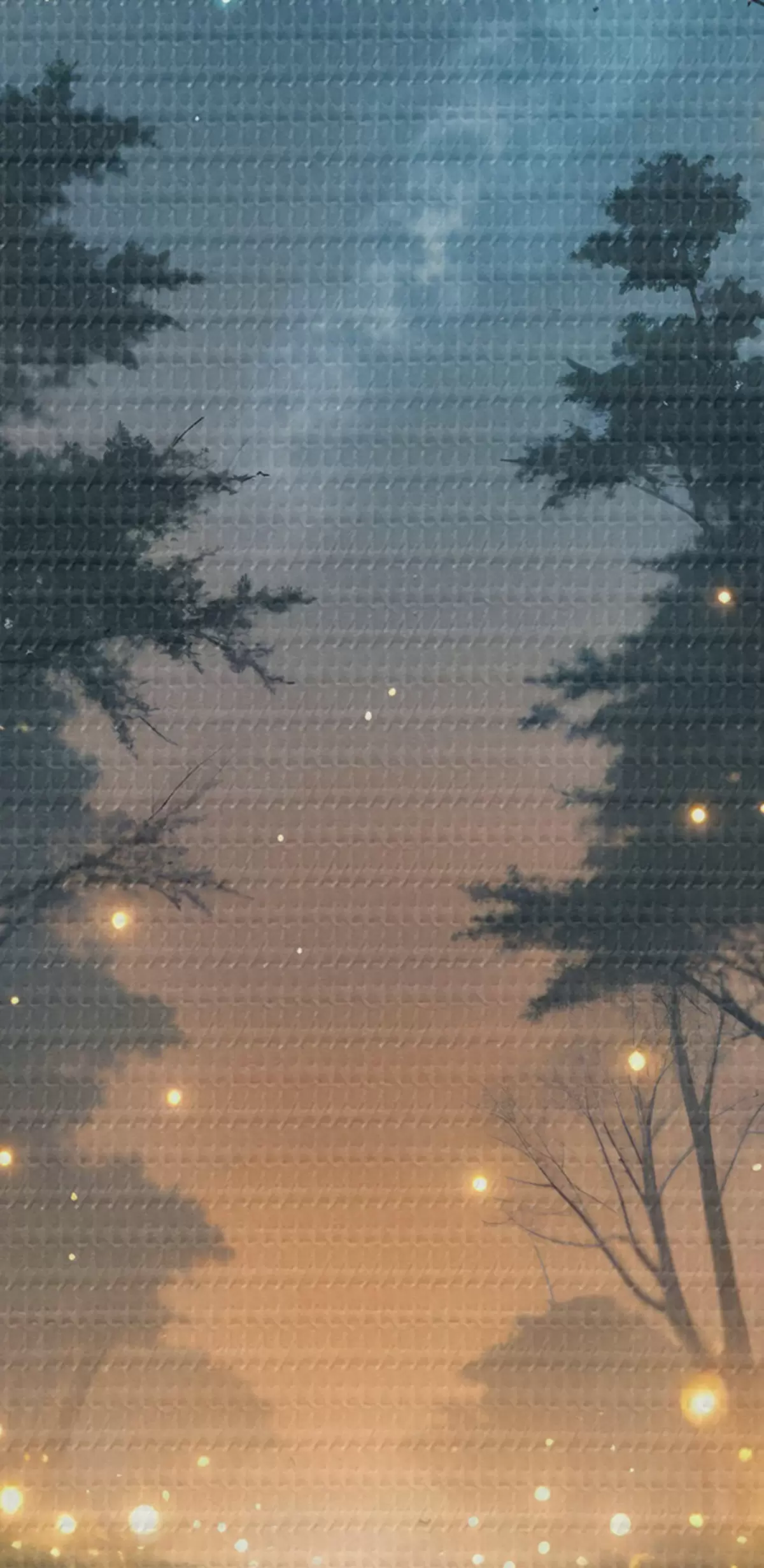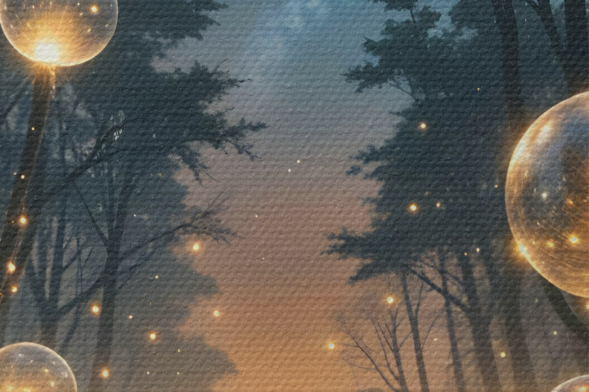 Pilt Maagiline mets öösel, kus puude vahel hõljuvad kollased kuulid ja tulikesed, mis loovad lummava atmosfääri Nr r41259