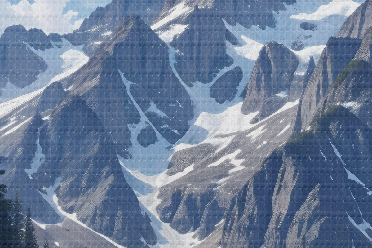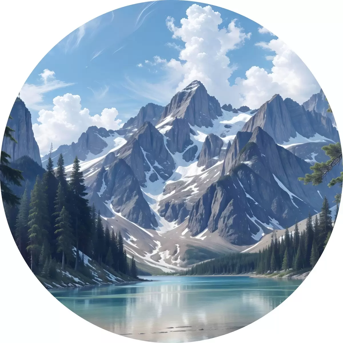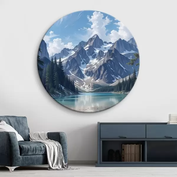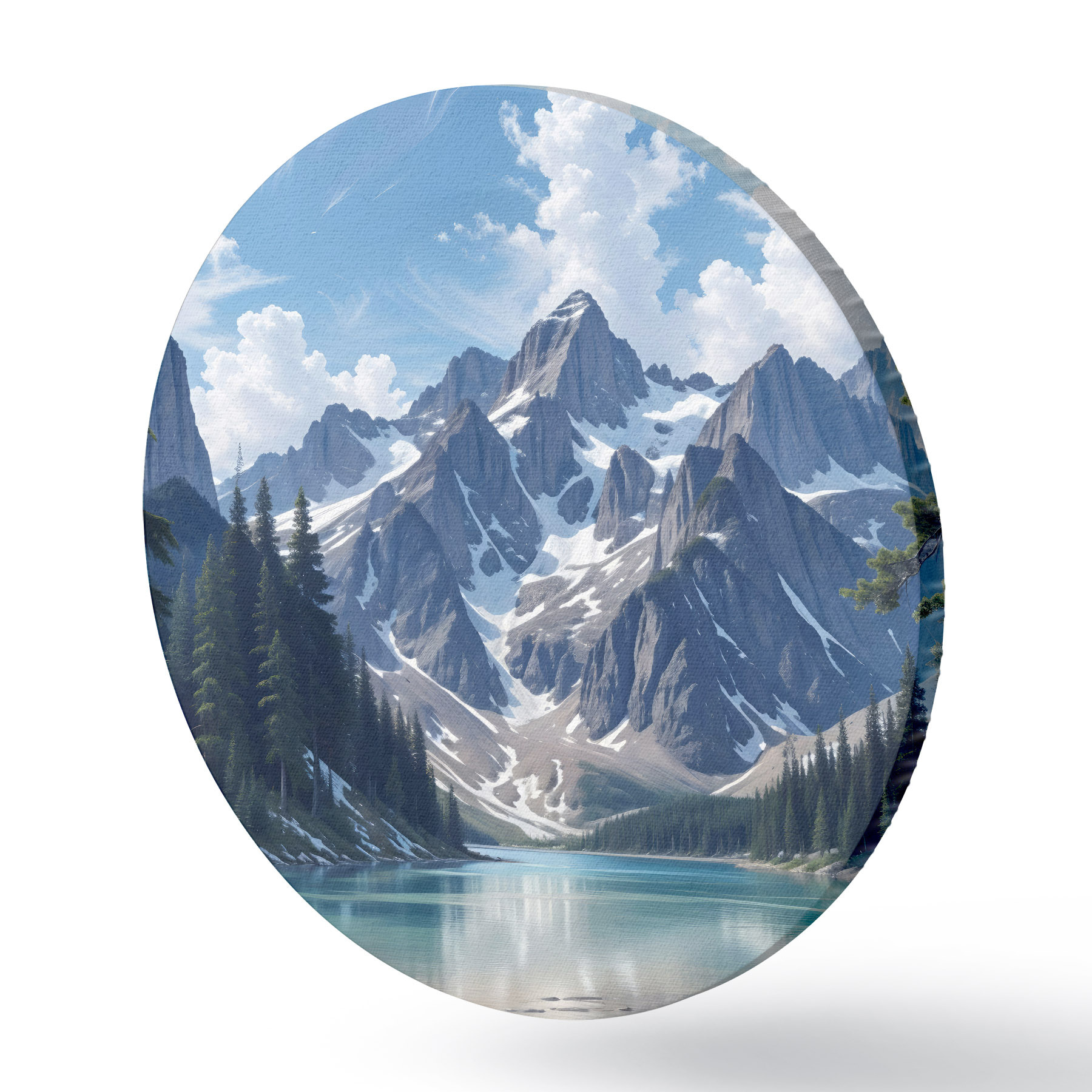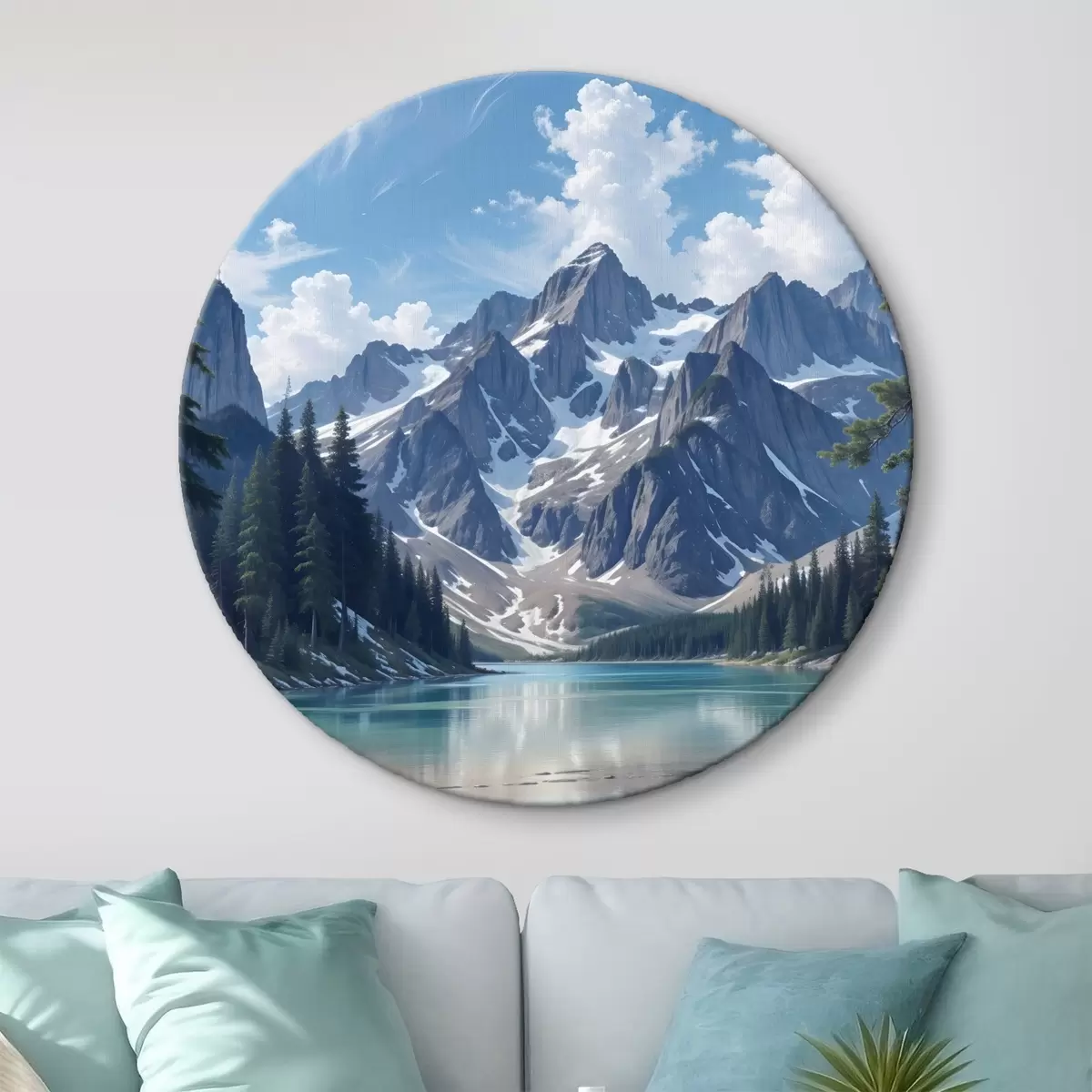 Pilt Rahulik alpi järv, mida ümbritsevad majesteetlikud lumekattega mäed, tihe mets ja pilvine taevas Nr r41264