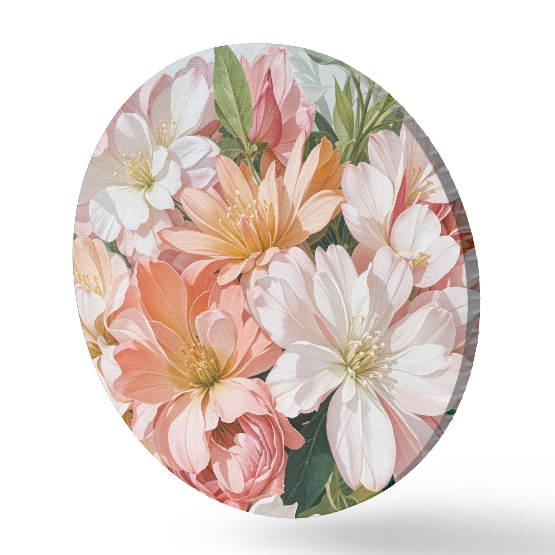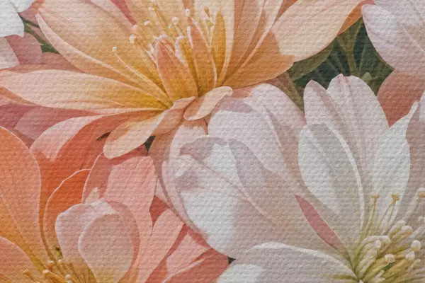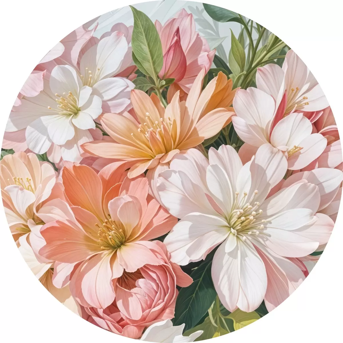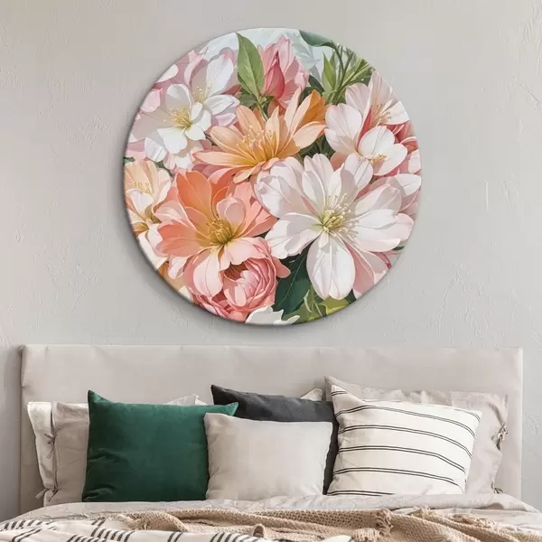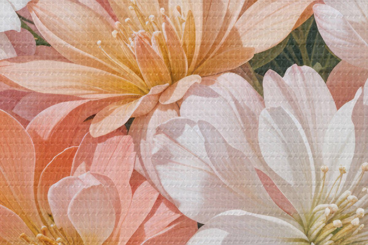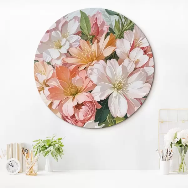 Pilt Elav kimp suurte roosade, valgete ja oranžide daaliaõitega roheliste lehtedega õrnal roosal taustal Nr r41267