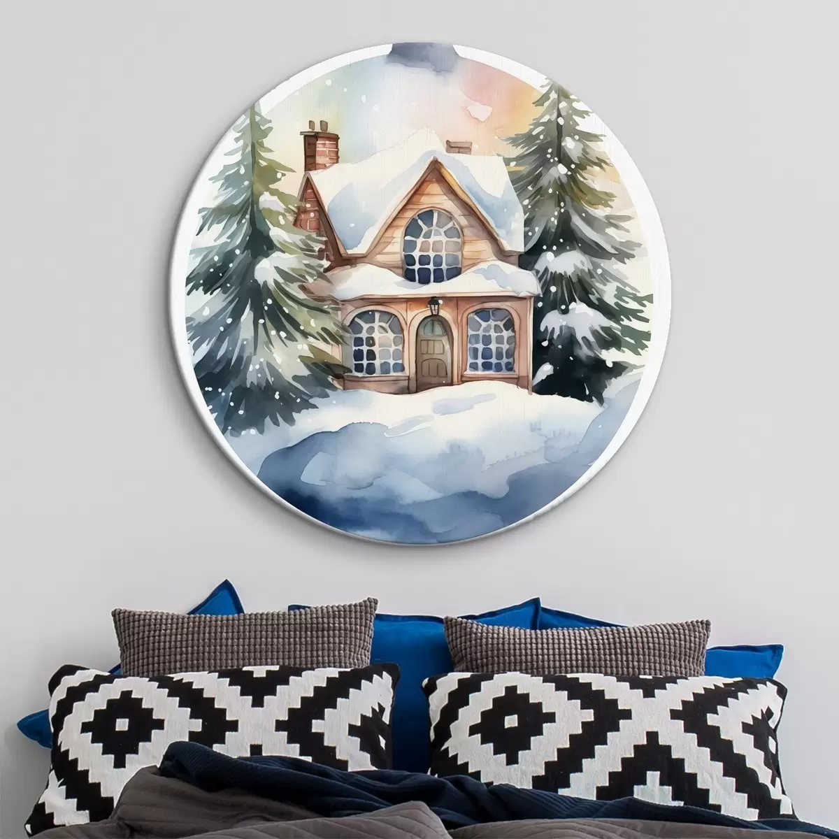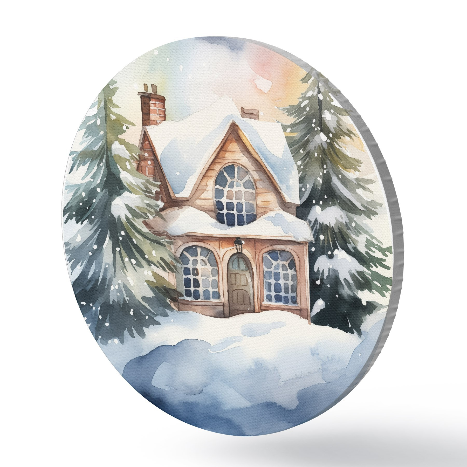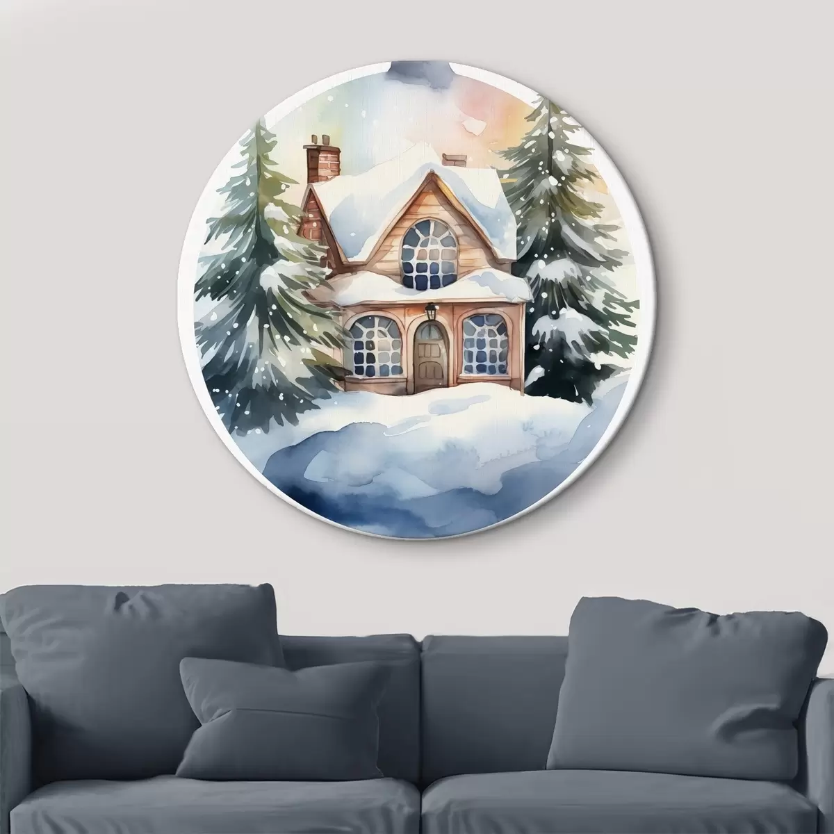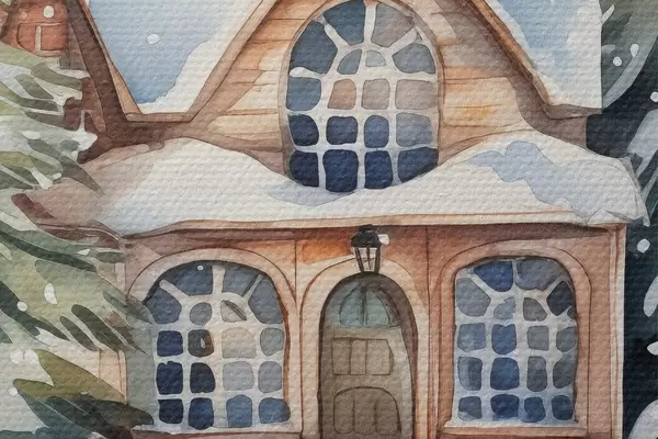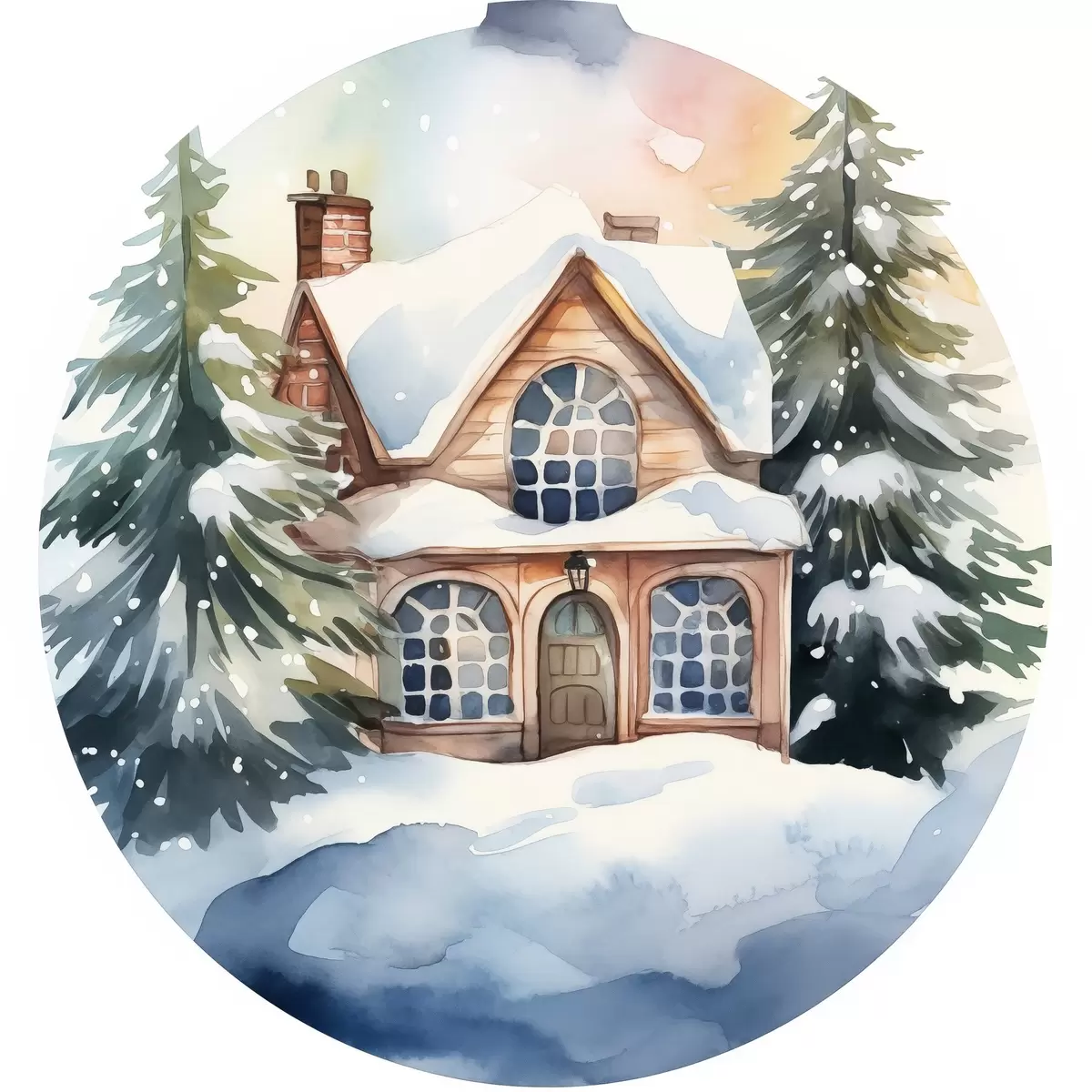 Pilt Jõulukaunistuskuuliga akvarell lume maja ja männipuudega Nr r41363