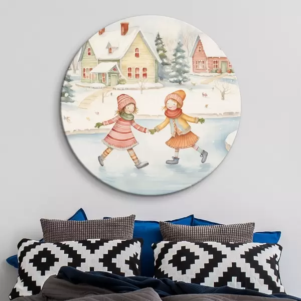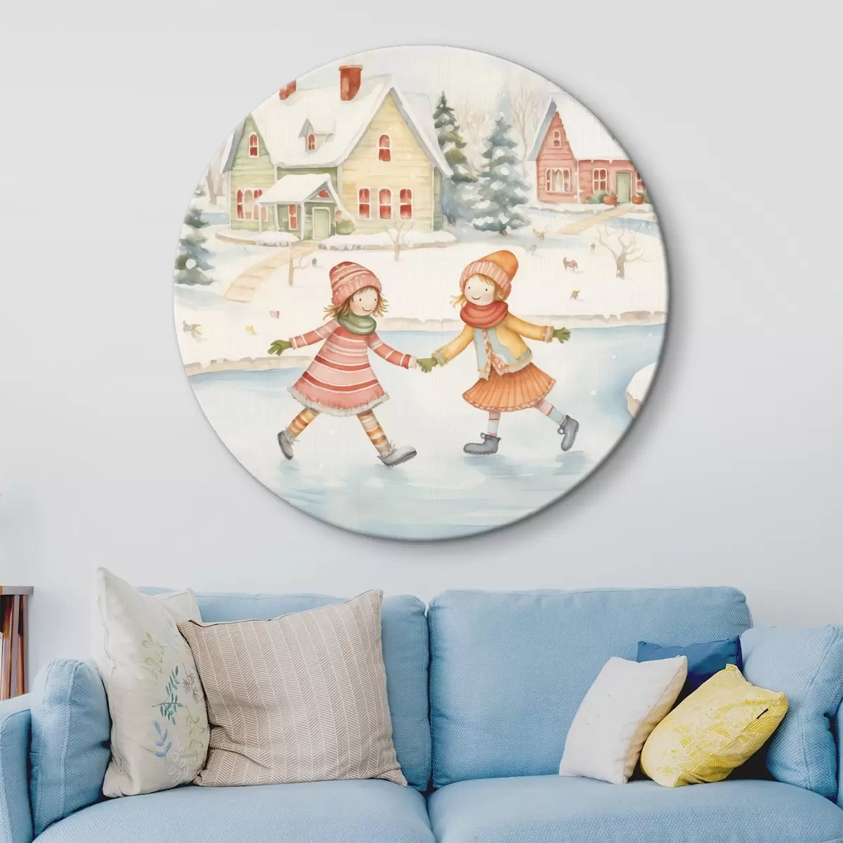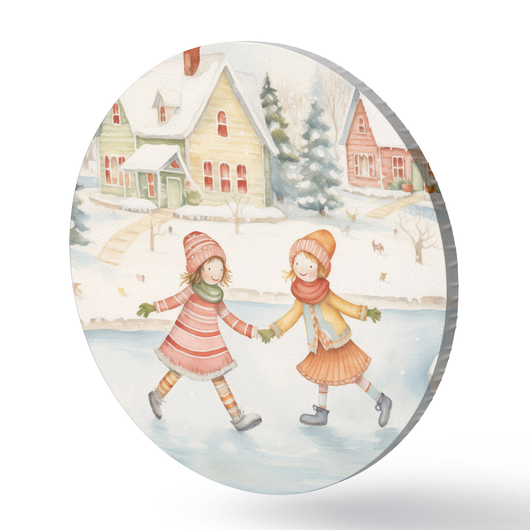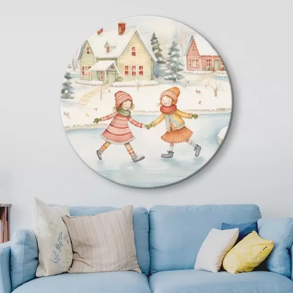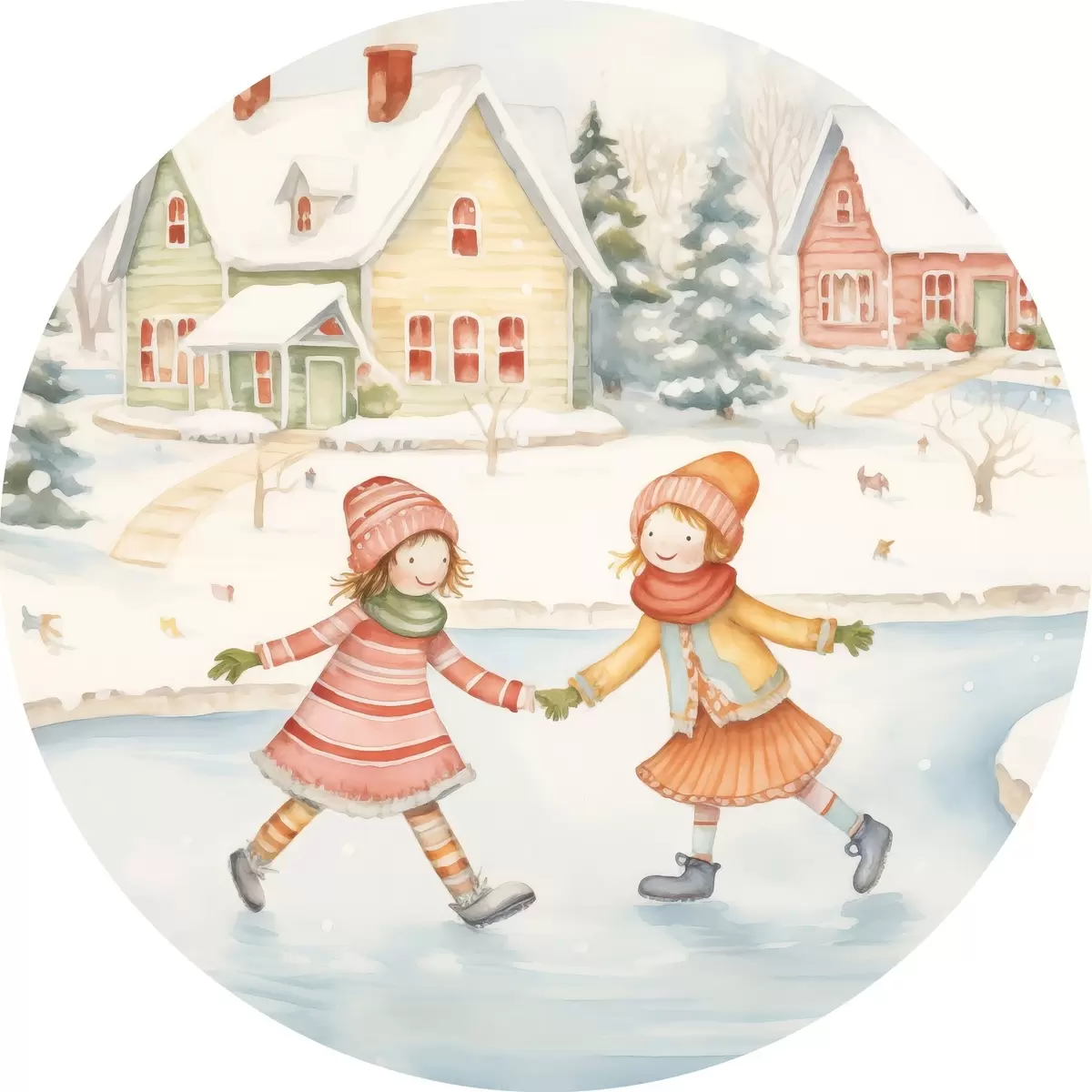 Pilt Talvine stseen kahe tüdruku uisutamisega, talvine linn, majad, mets Nr r41377