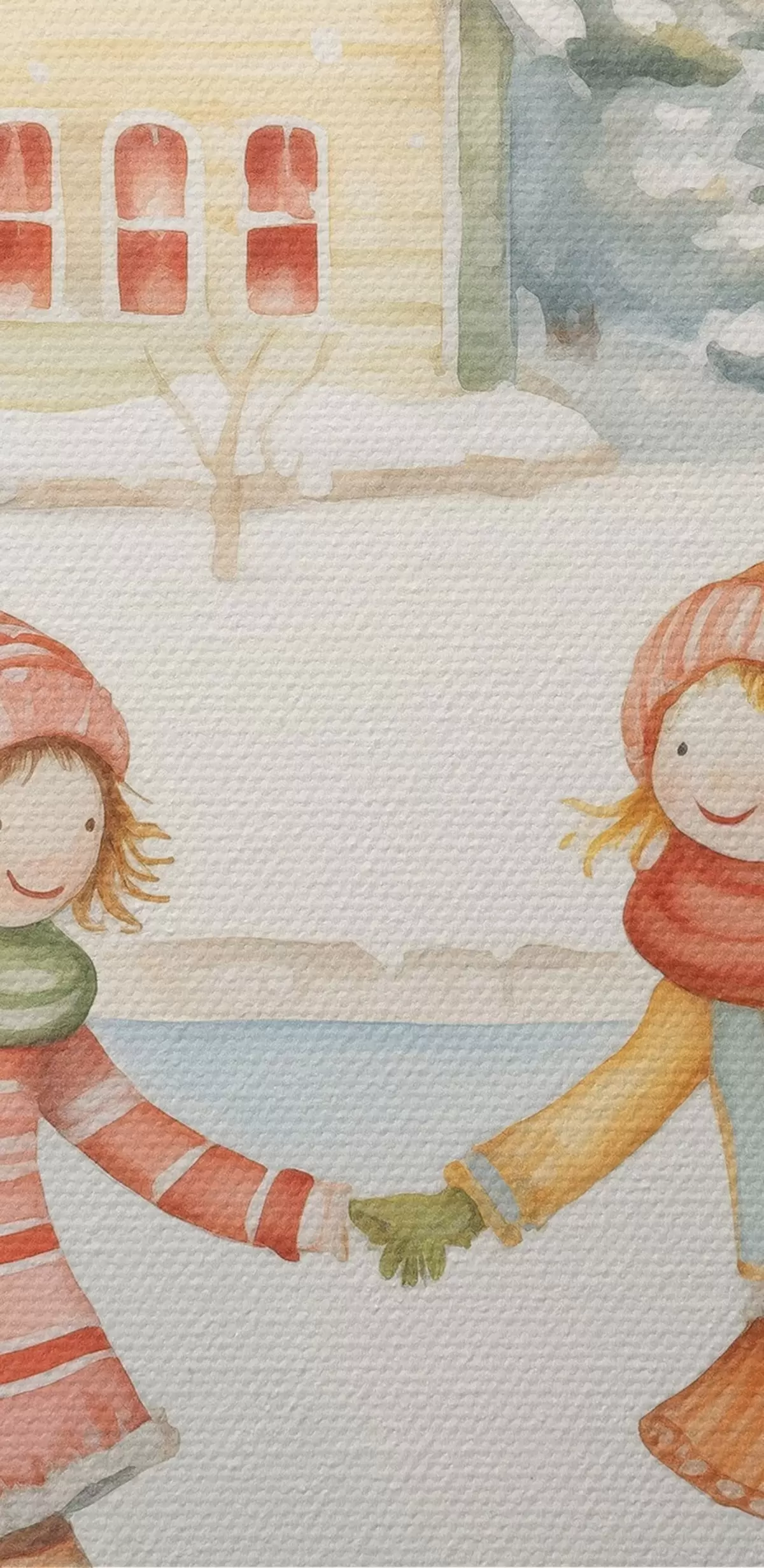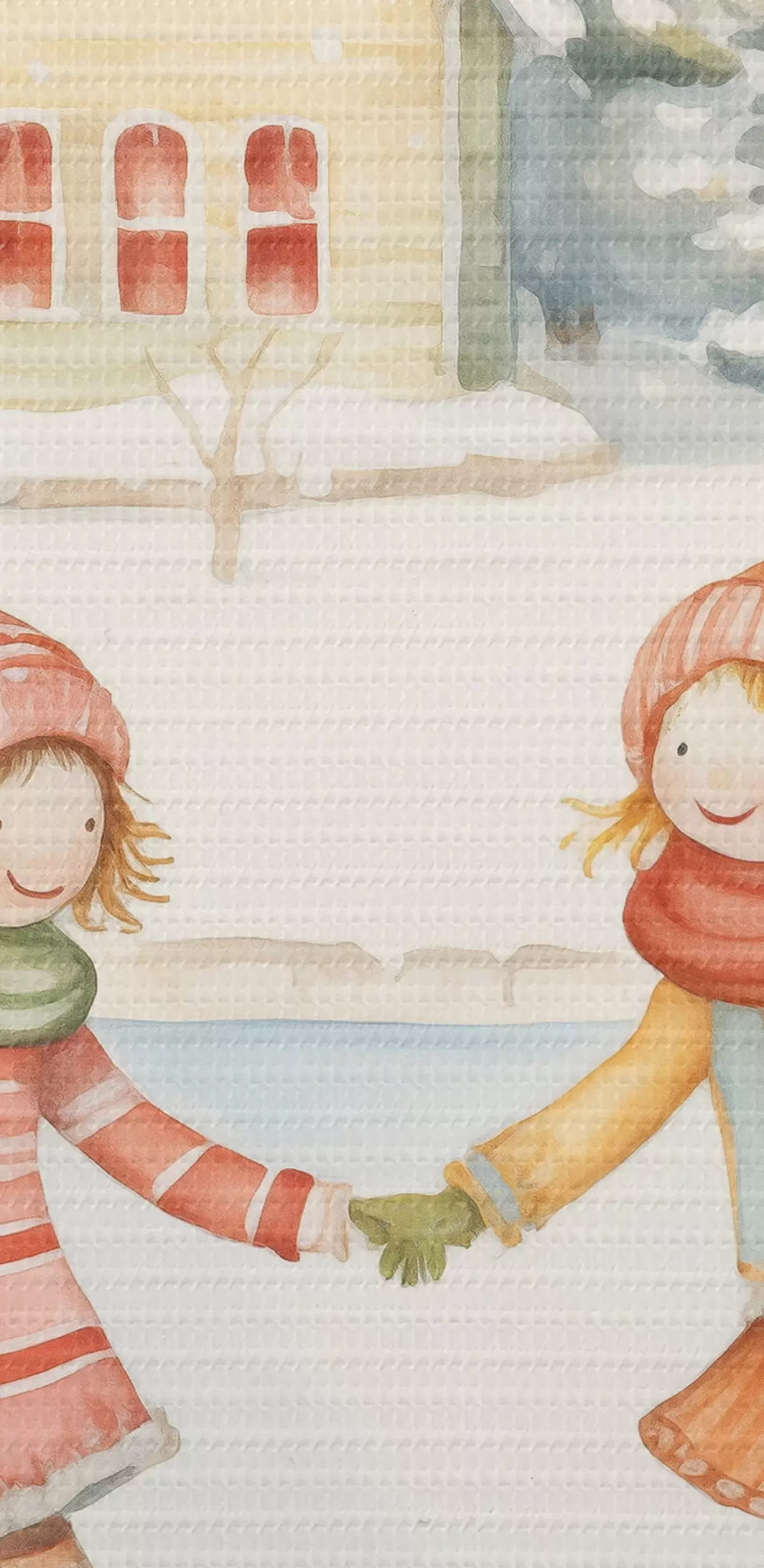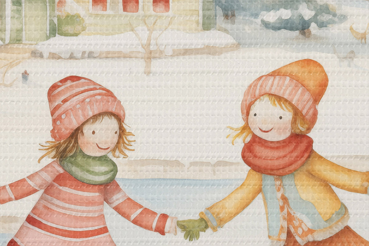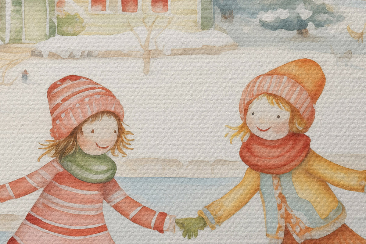 Pilt Talvine stseen kahe tüdruku uisutamisega, talvine linn, majad, mets Nr r41377