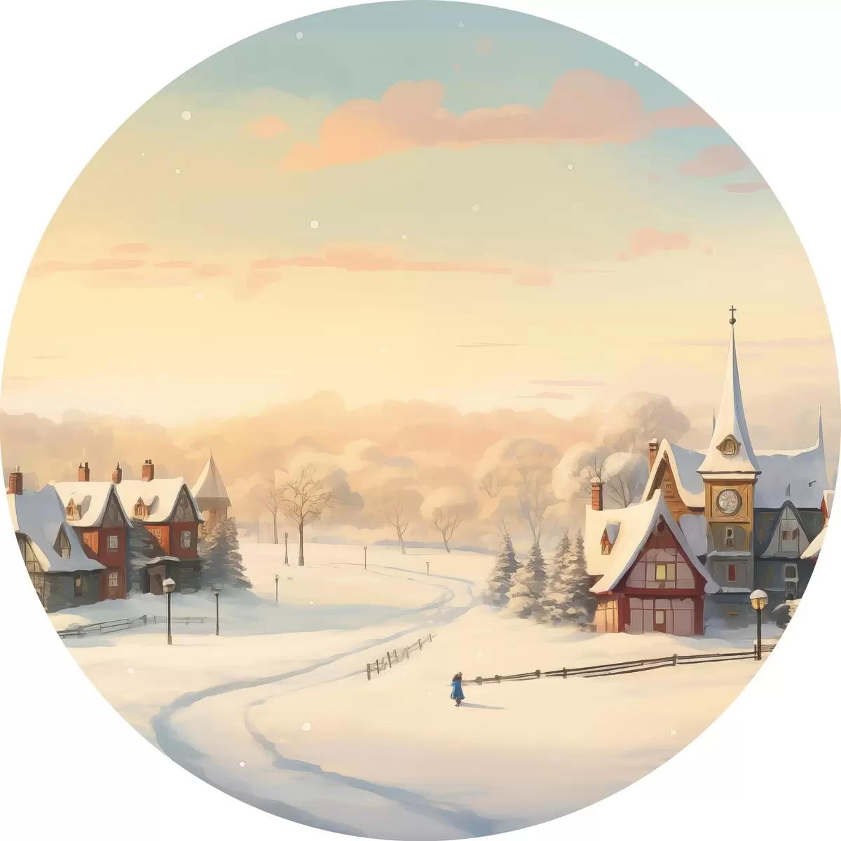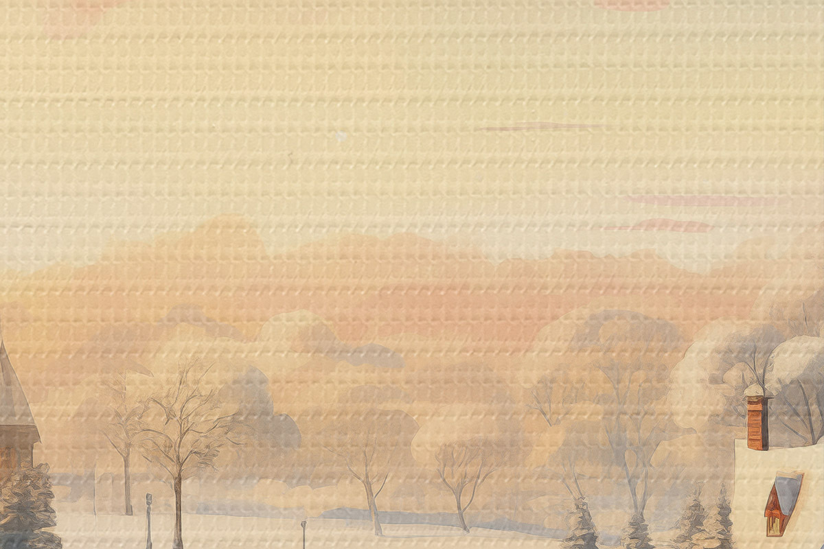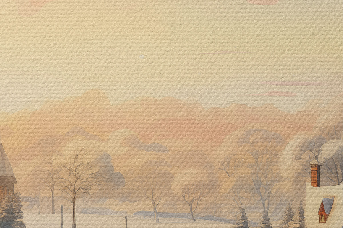 Pilt Talvine imedemaa, majad, päikeseloojangutaevas, puud, akvarellmaal Nr r41383