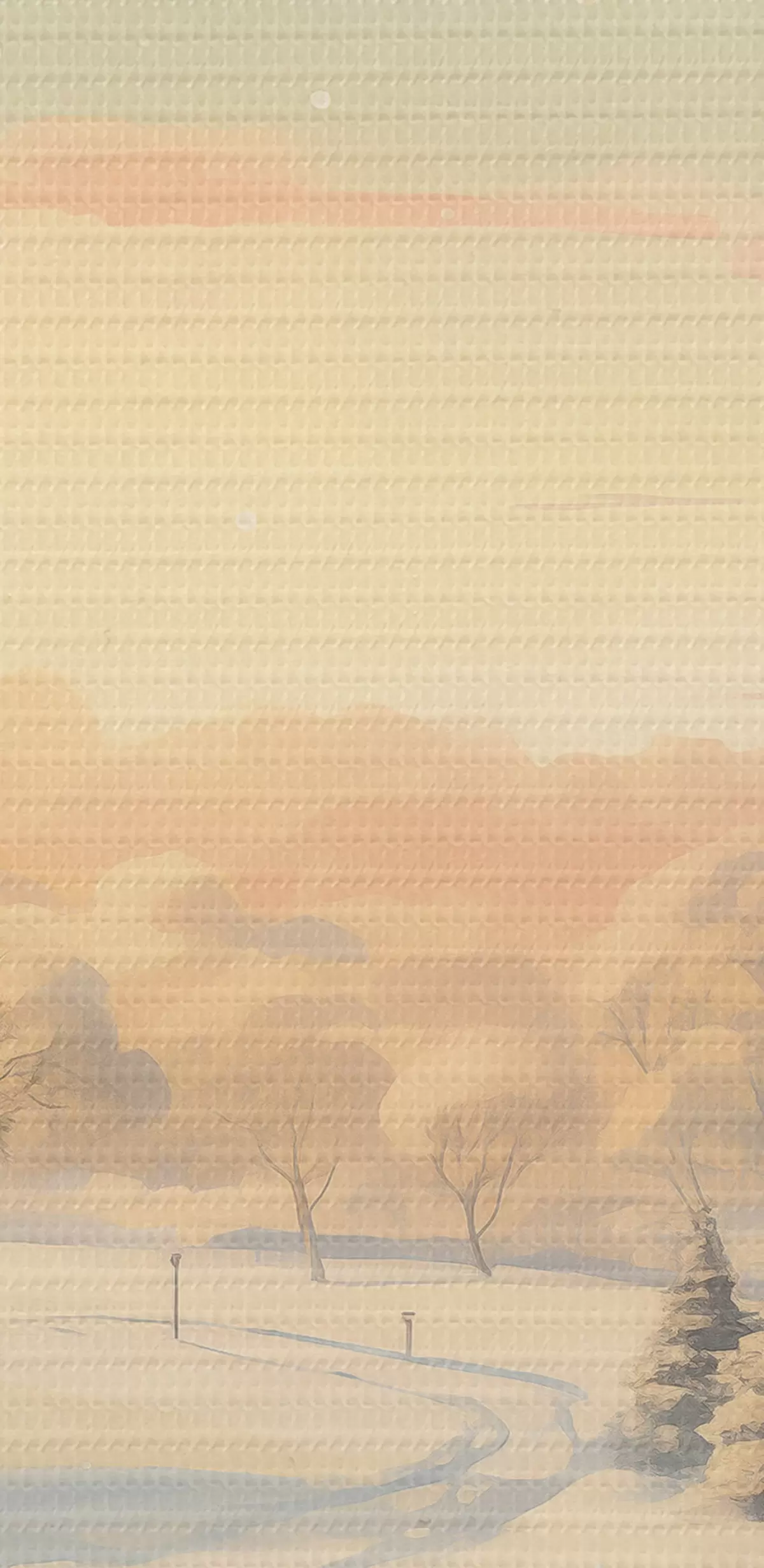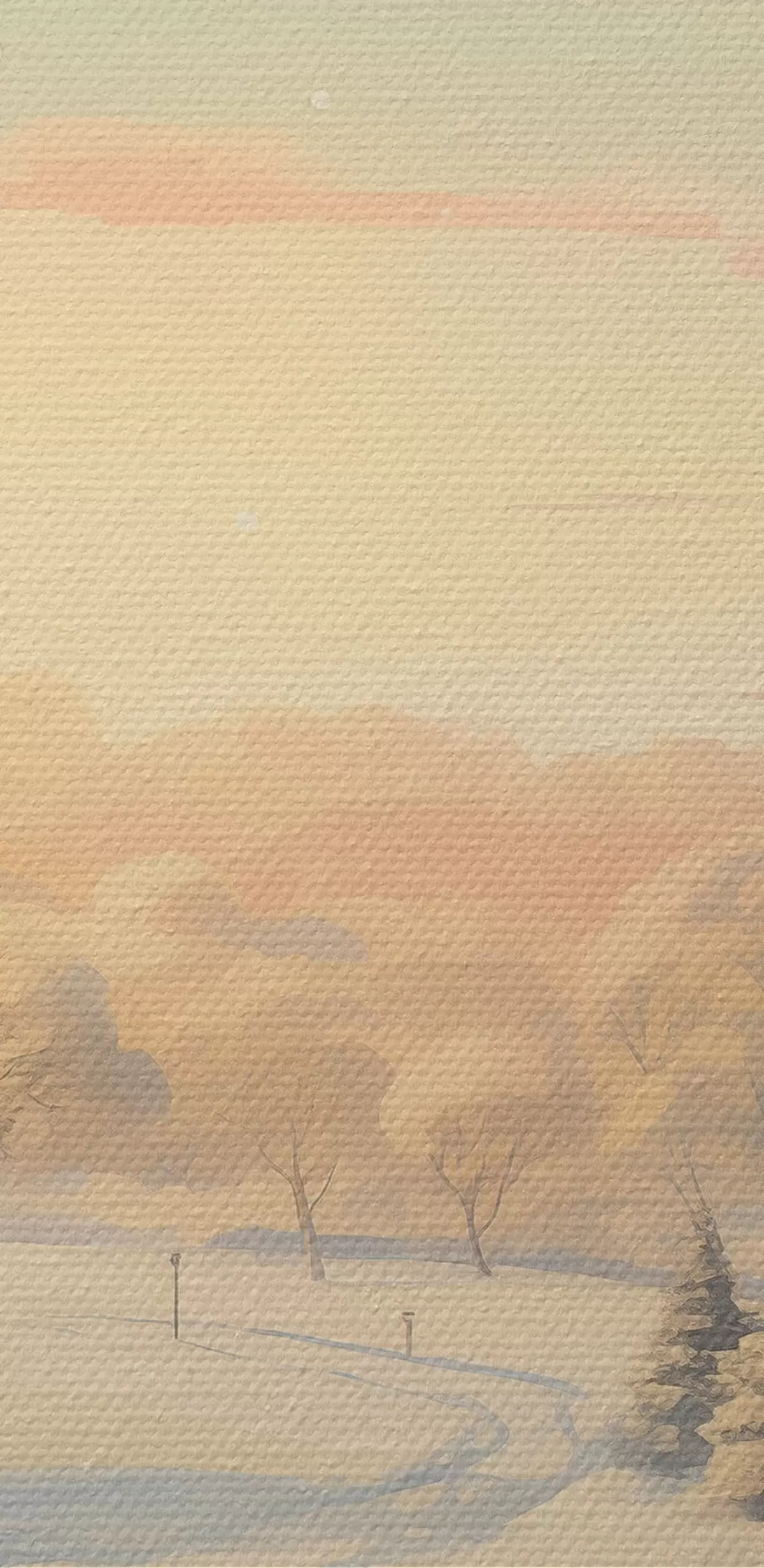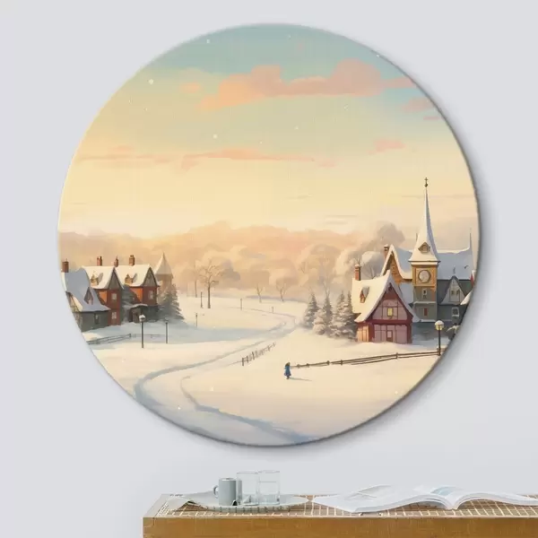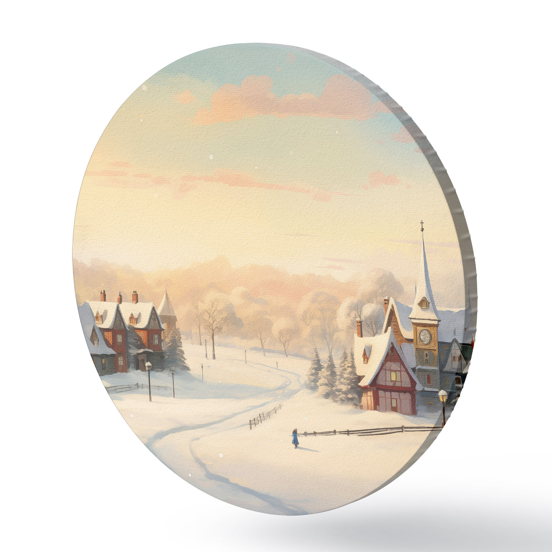 Pilt Talvine imedemaa, majad, päikeseloojangutaevas, puud, akvarellmaal Nr r41383