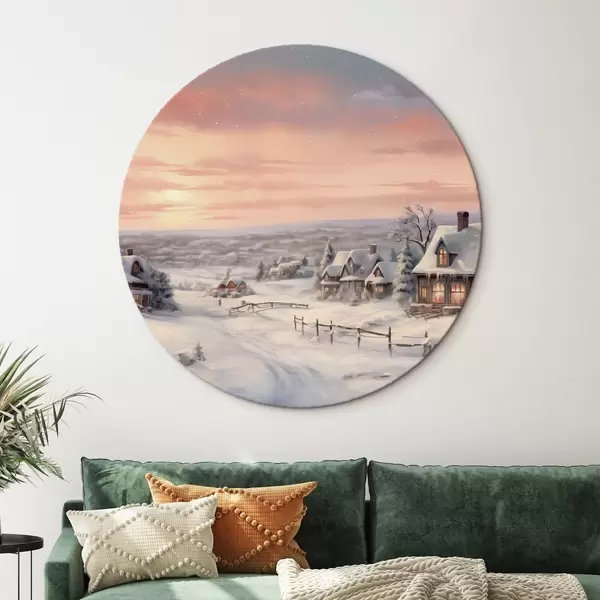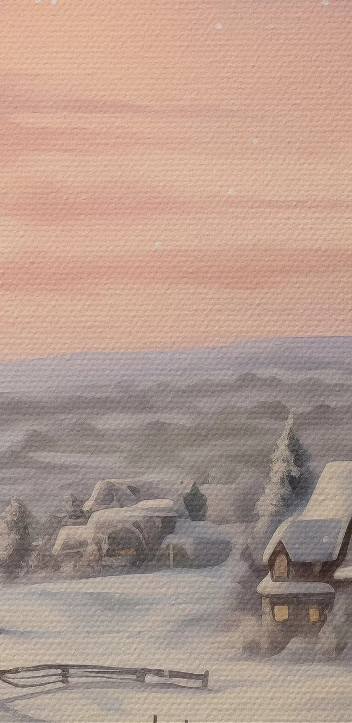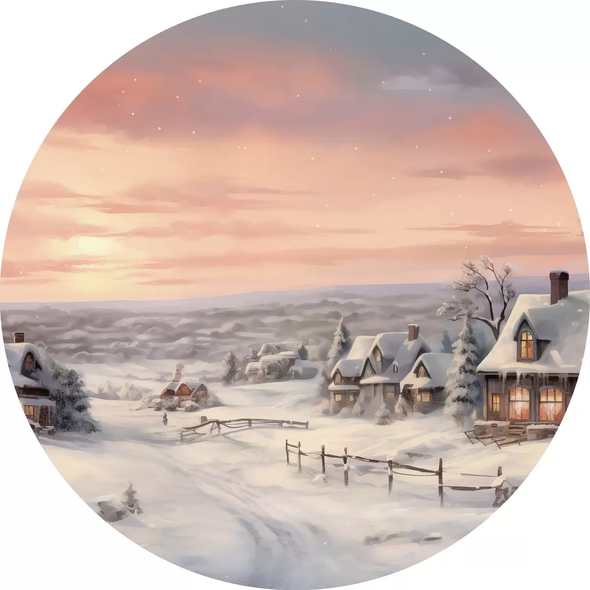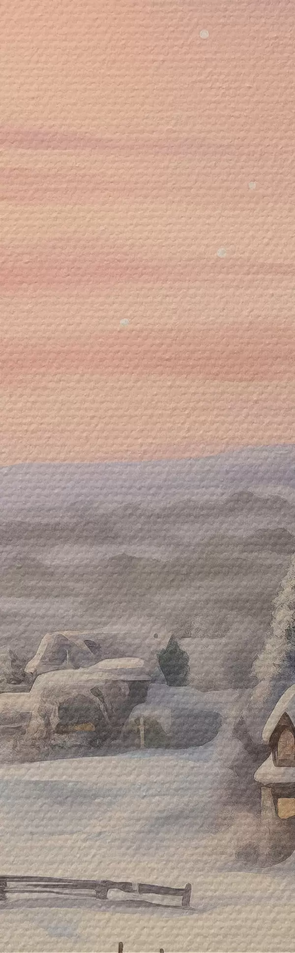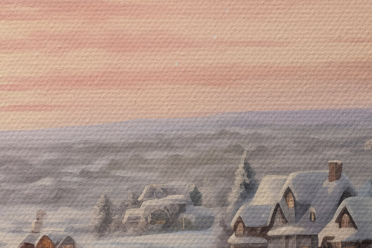 Pilt Päikeseloojang talvekülas, maaliline, akvarell, lumehelbed Nr r41386