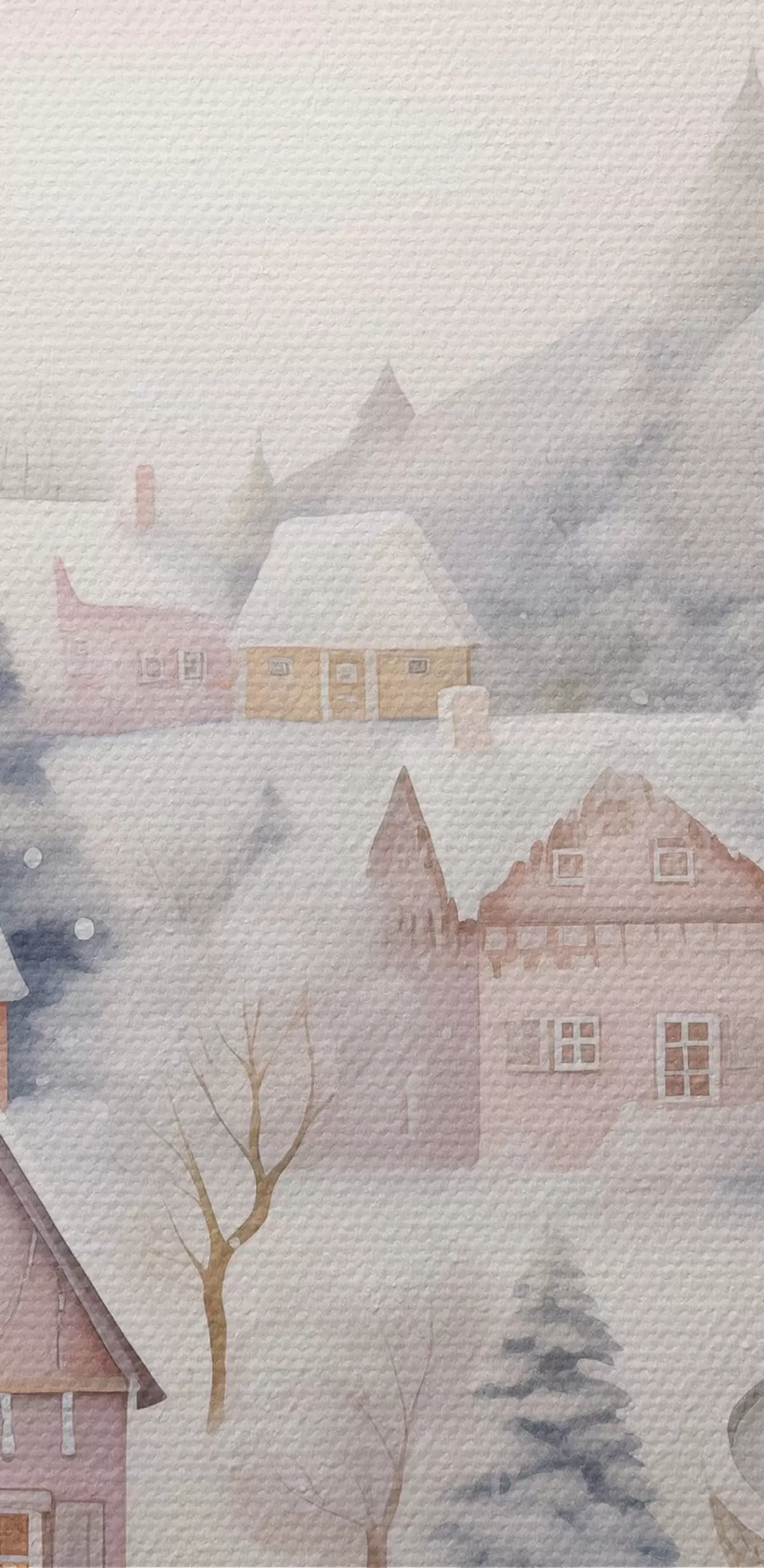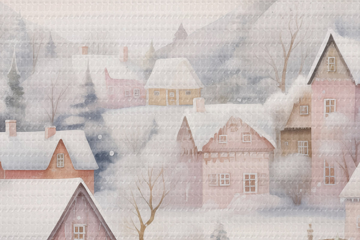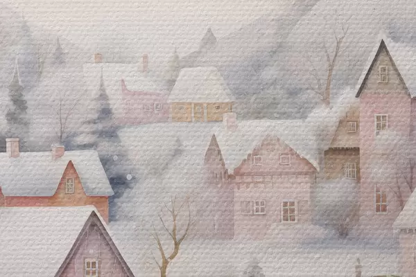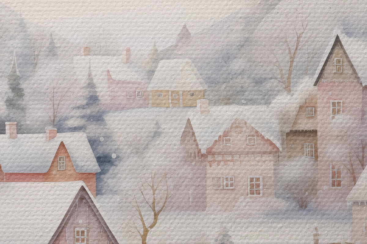 Pilt Akvarell talveküla, männimets, majad, mäed, pehmed pastellvärvid Nr r41388
