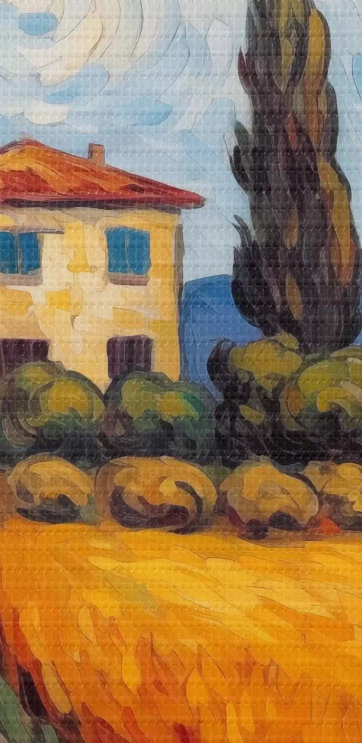Selle lõuendi peenike niidipunus meenutab professionaalse kunstniku lõuendi pinda.