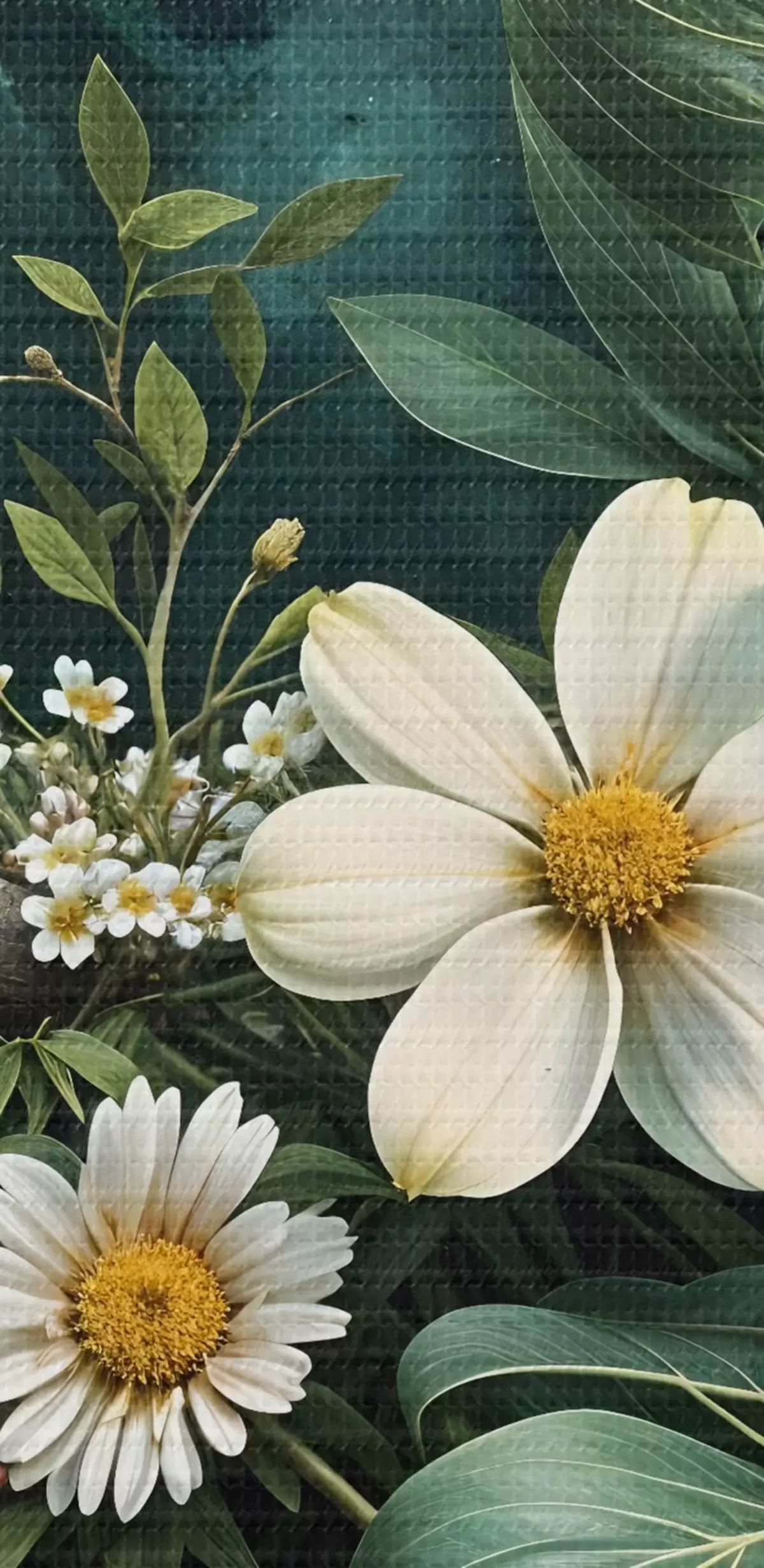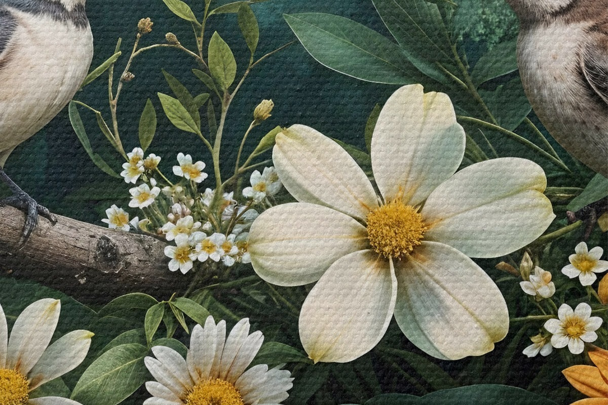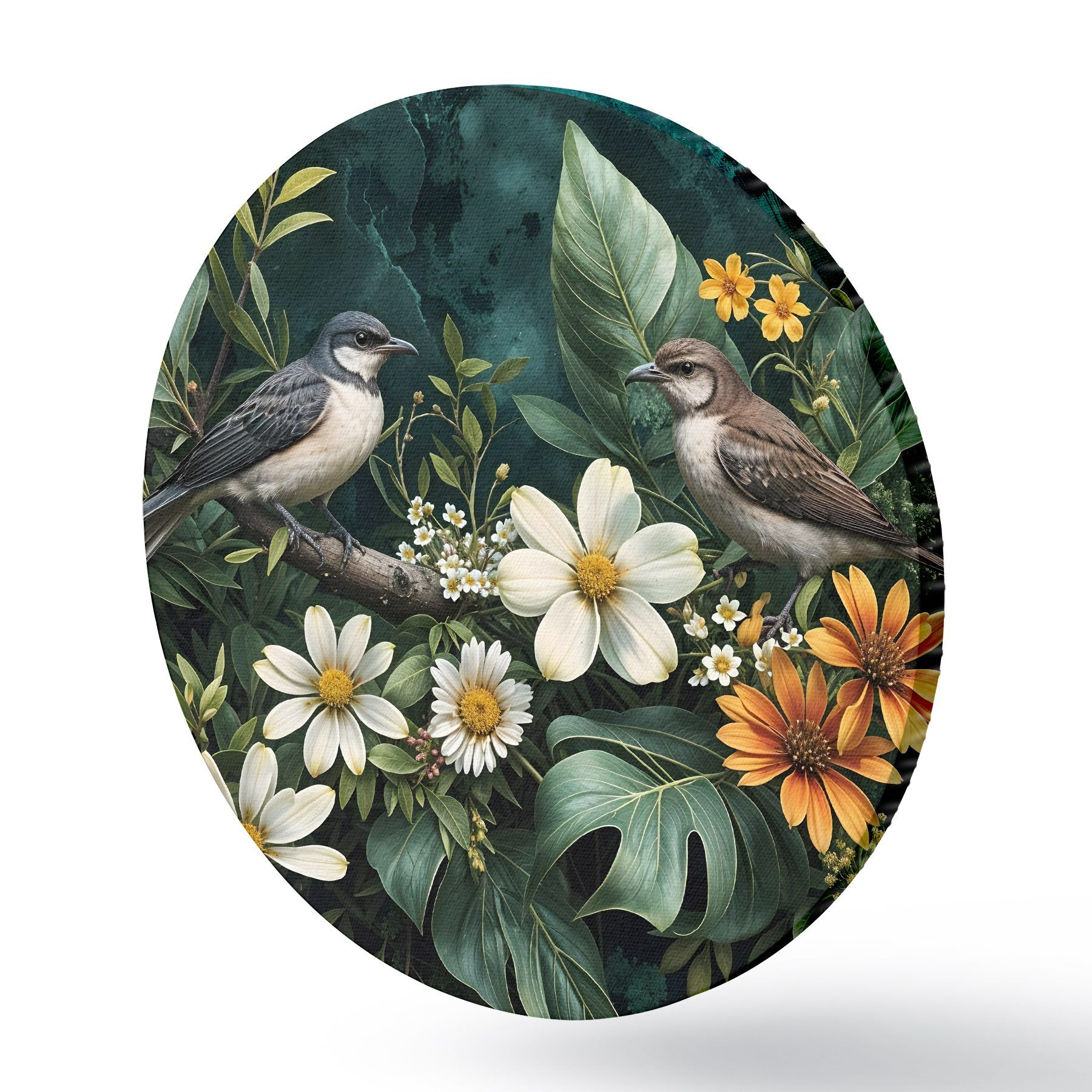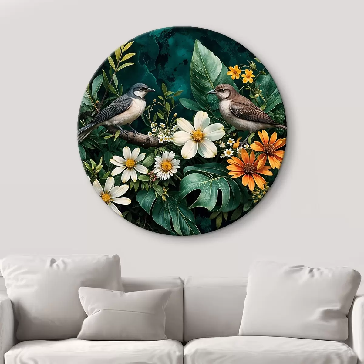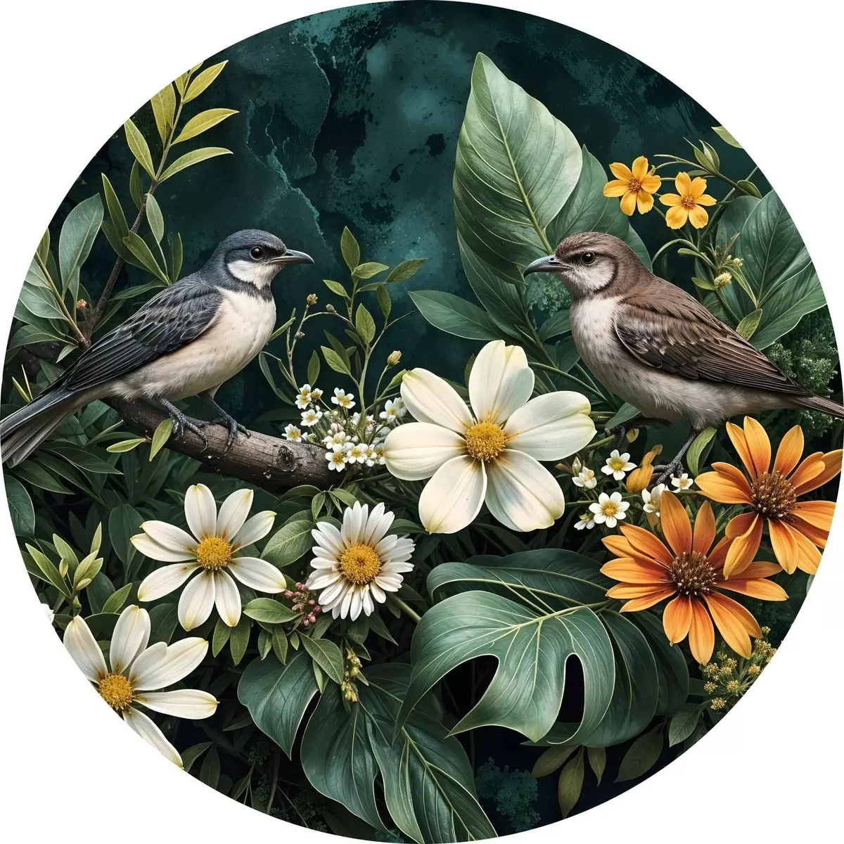 Pilt Väikesed linnud istuvad okstel, mida ümbritsevad lopsakad troopilised lehed, sealhulgas suured rohelised lehed ja värvilised lilled Nr r42220