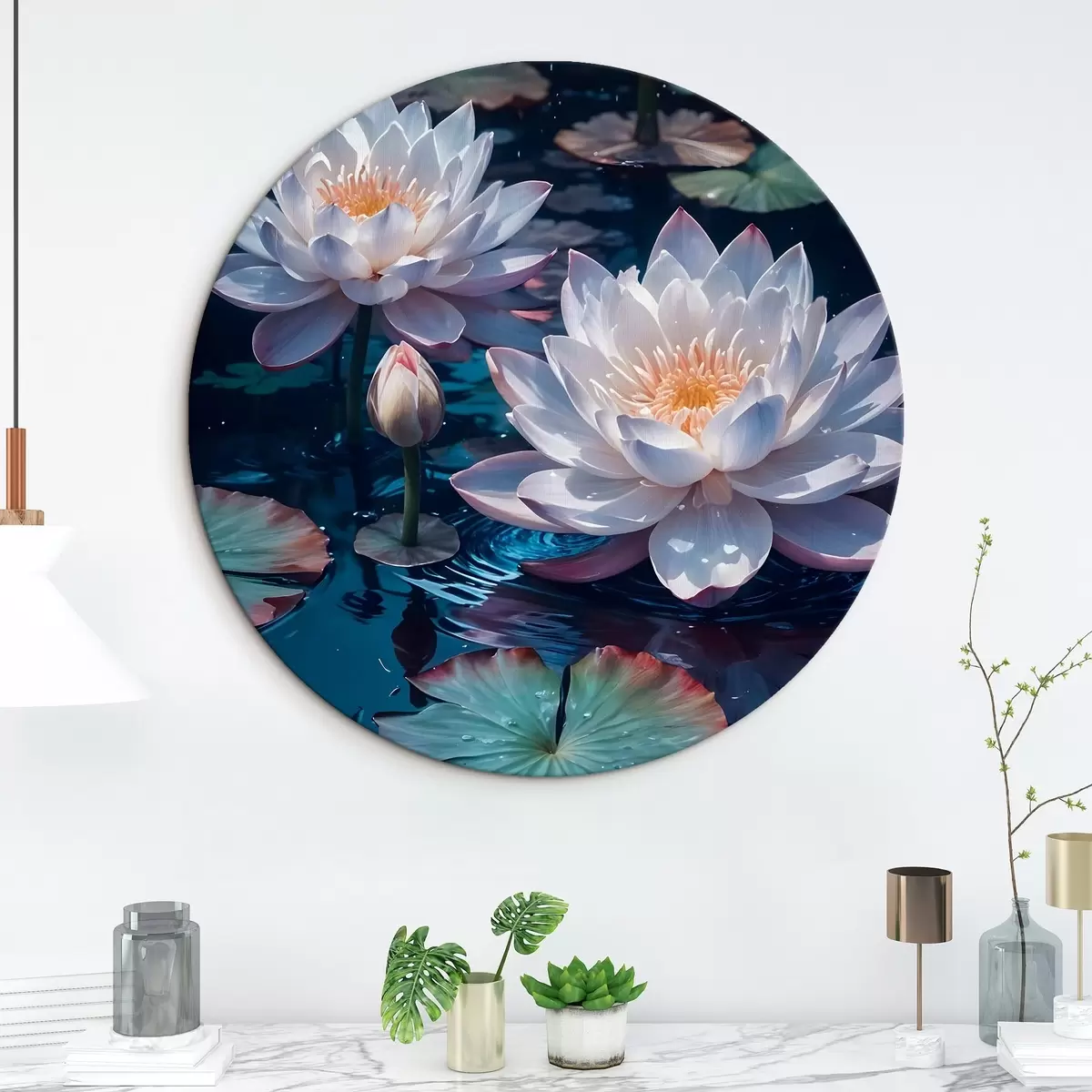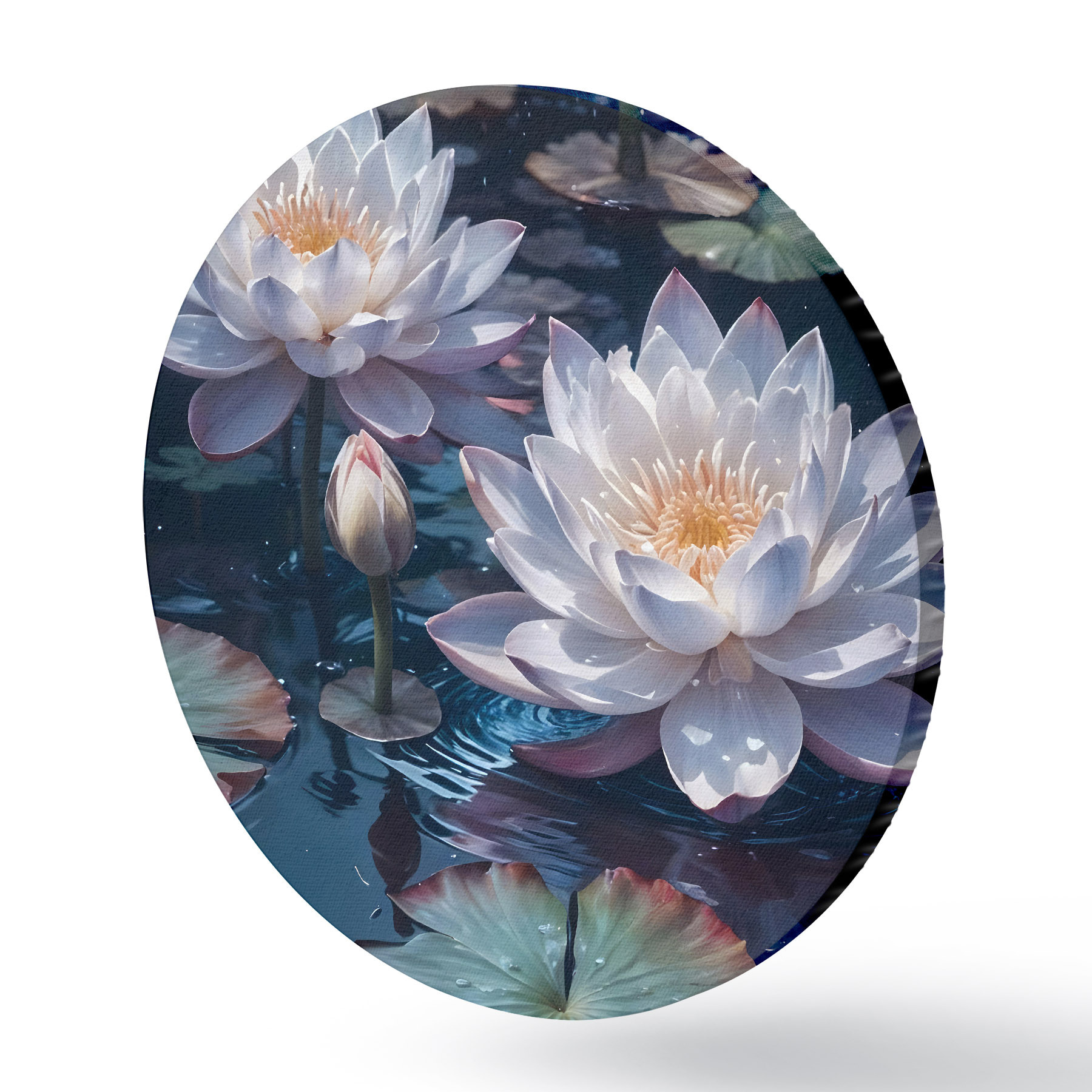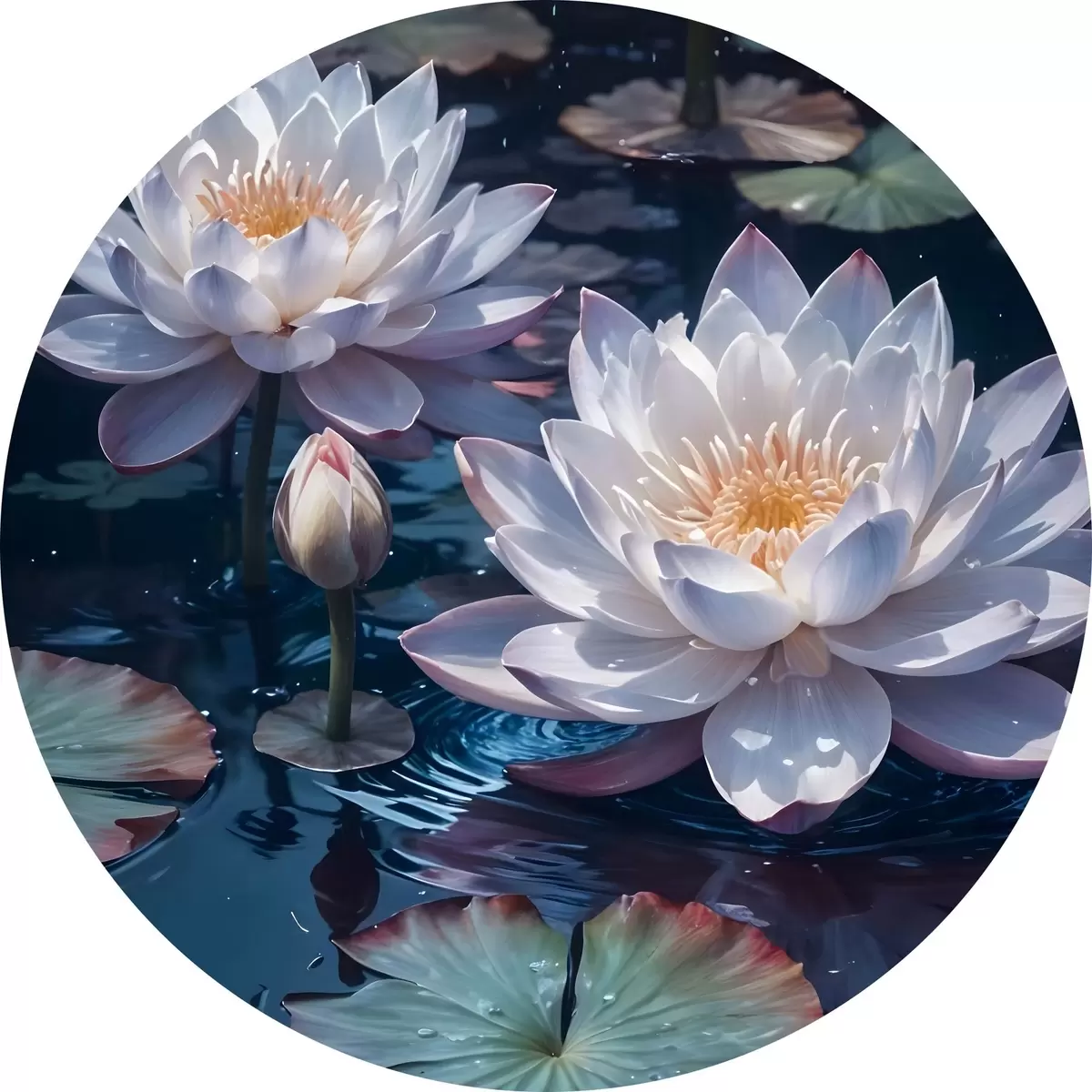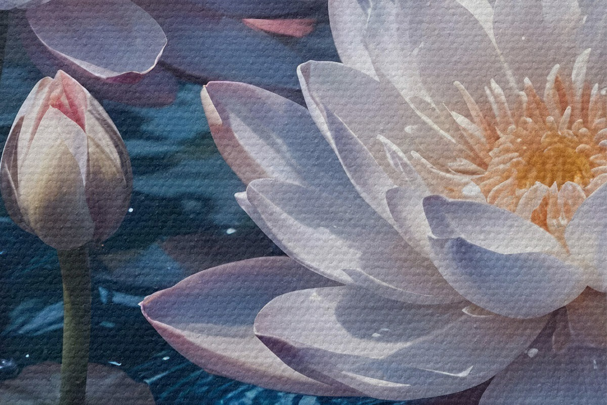Pilt Valged lootoslilled hõljuvad rahulikul tiigil koos lillelilledega Nr r42225