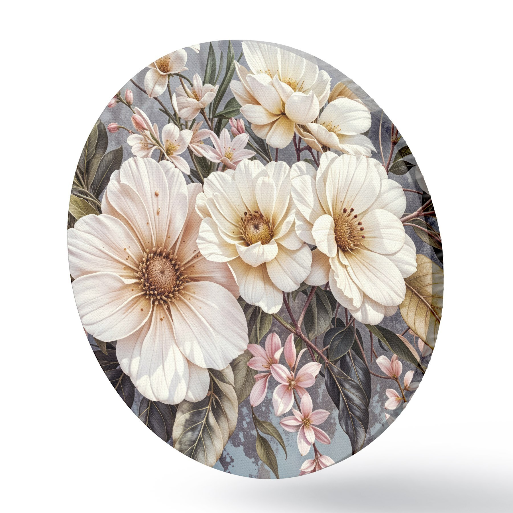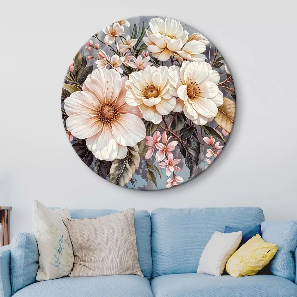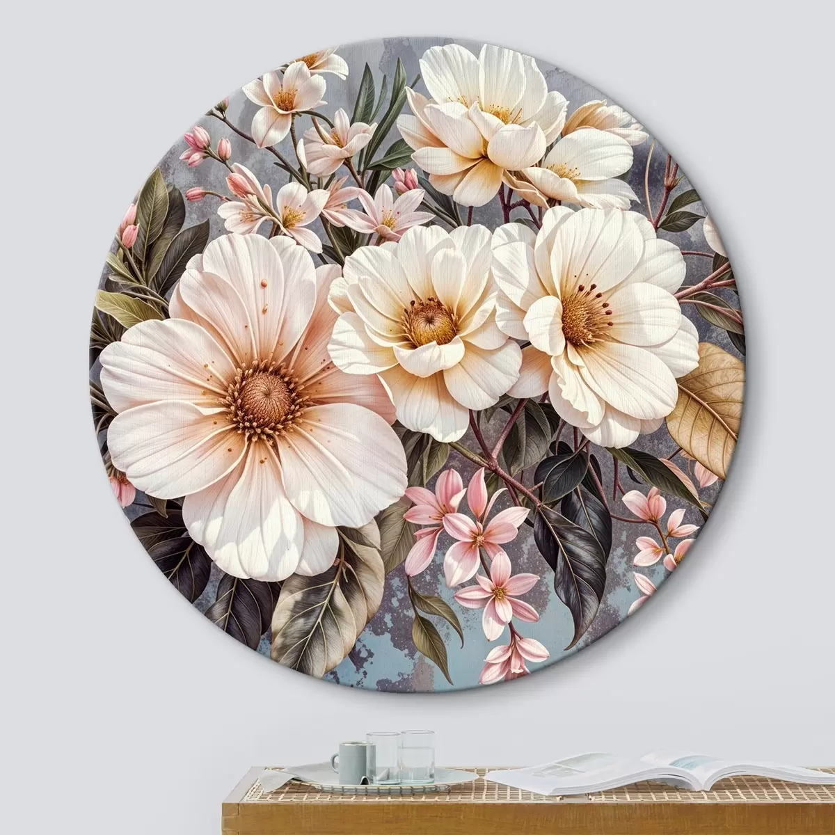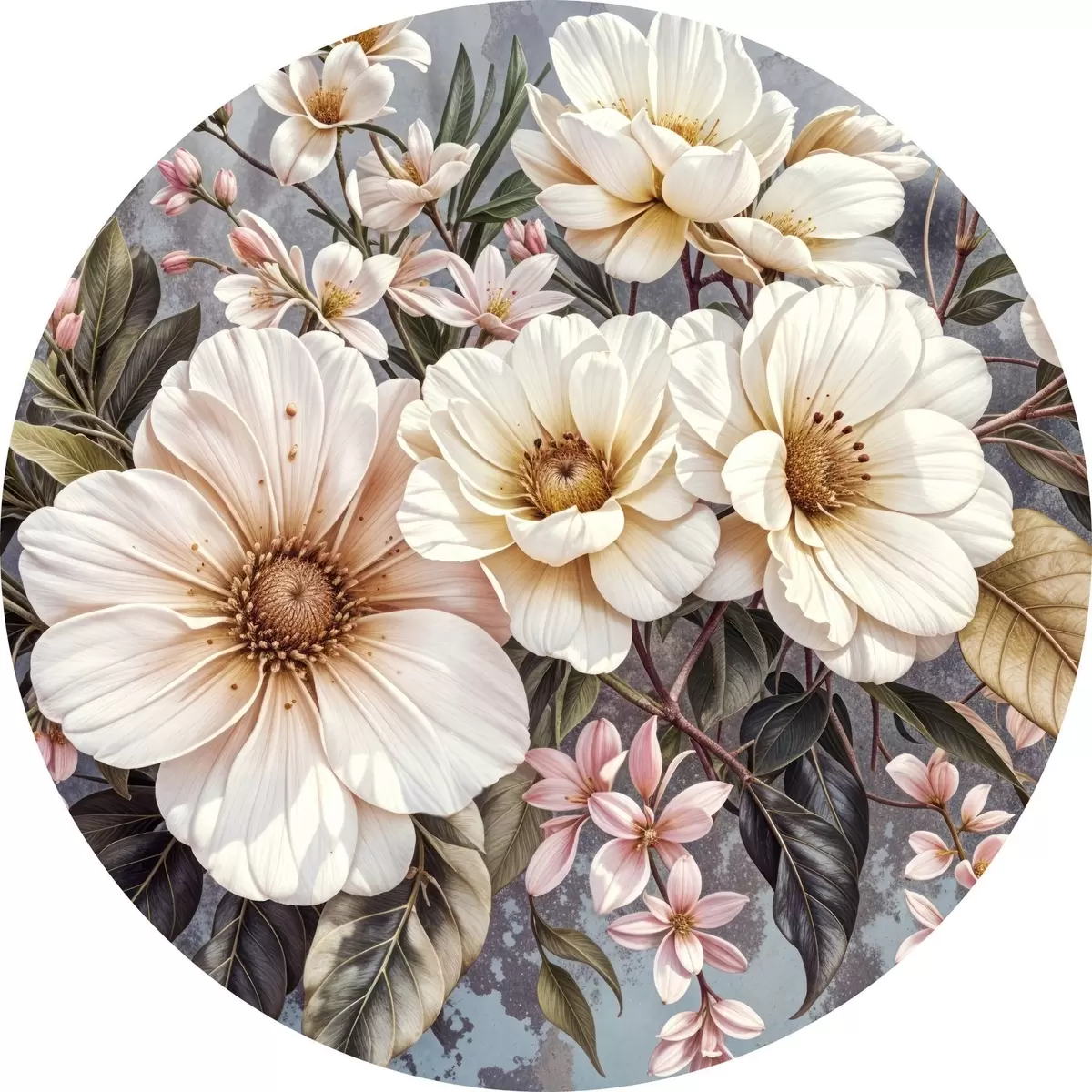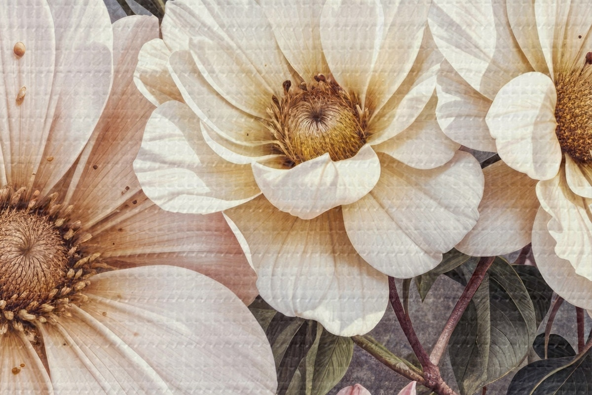 Pilt Elavat värvi kimp suurte üksikasjalike valgete ja roosade daaliaõitega roheliste lehtedega tumedal taustal Nr r42227
