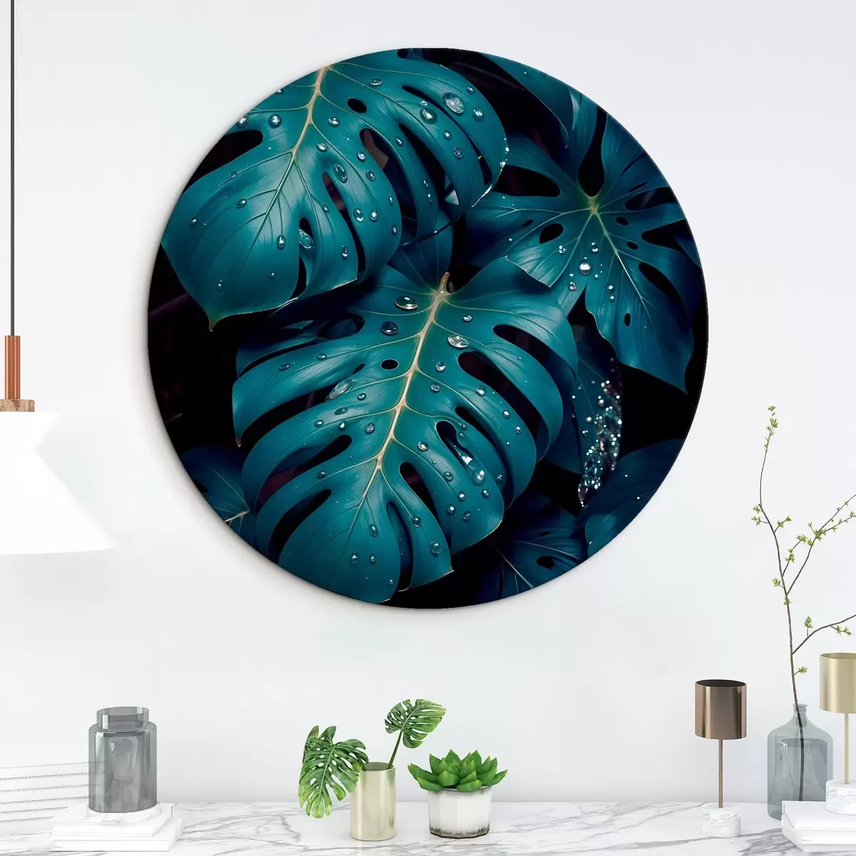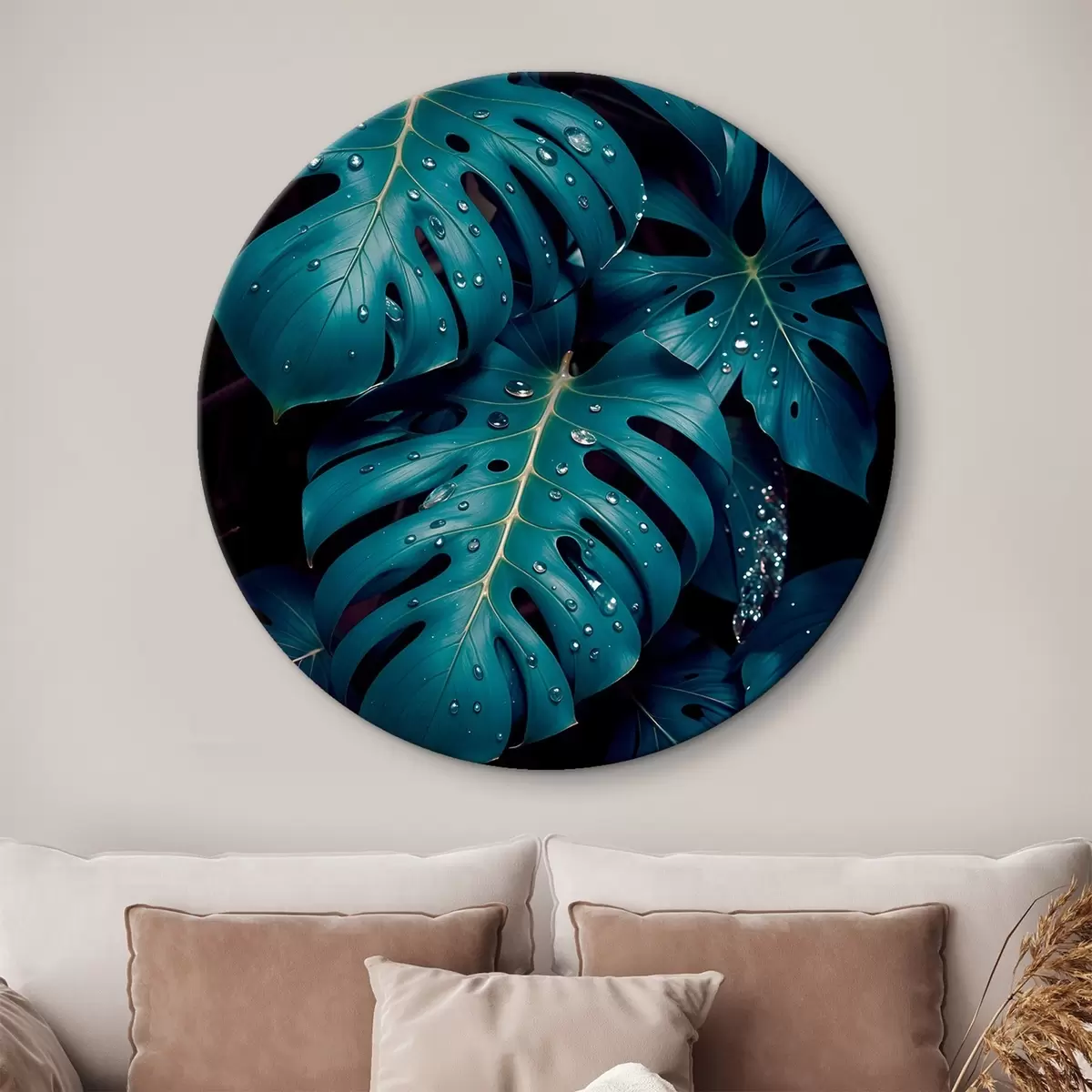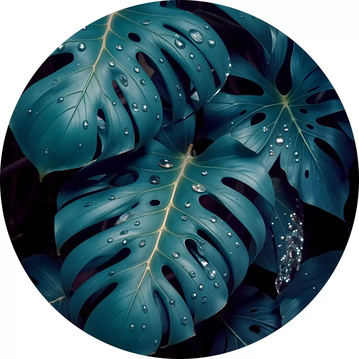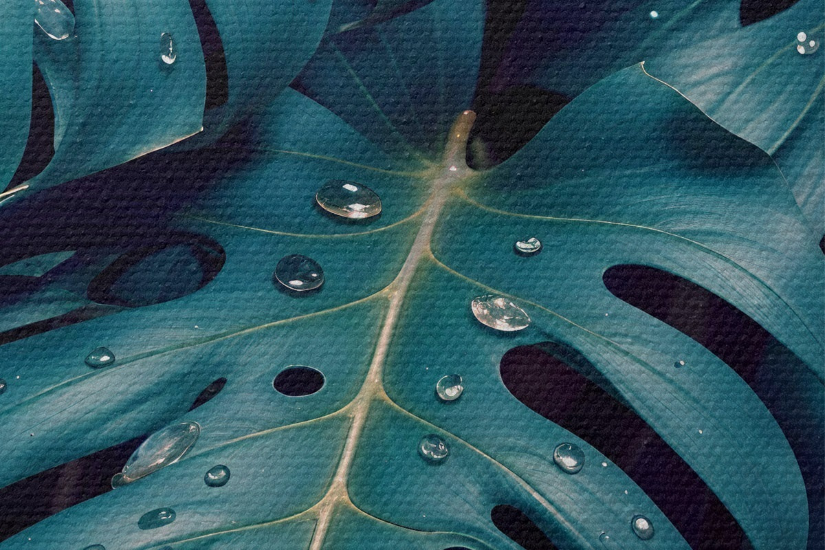 Pilt Lopsakad troopilised monstera lehed koos veepiiskadega tumedal taustal , mis loob meeleoluka ja atmosfäärilise trükise Nr r42233