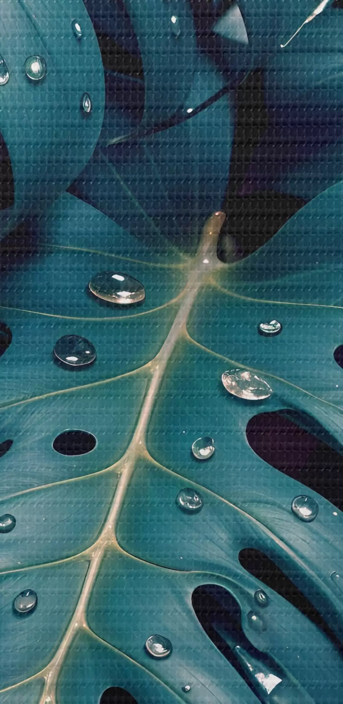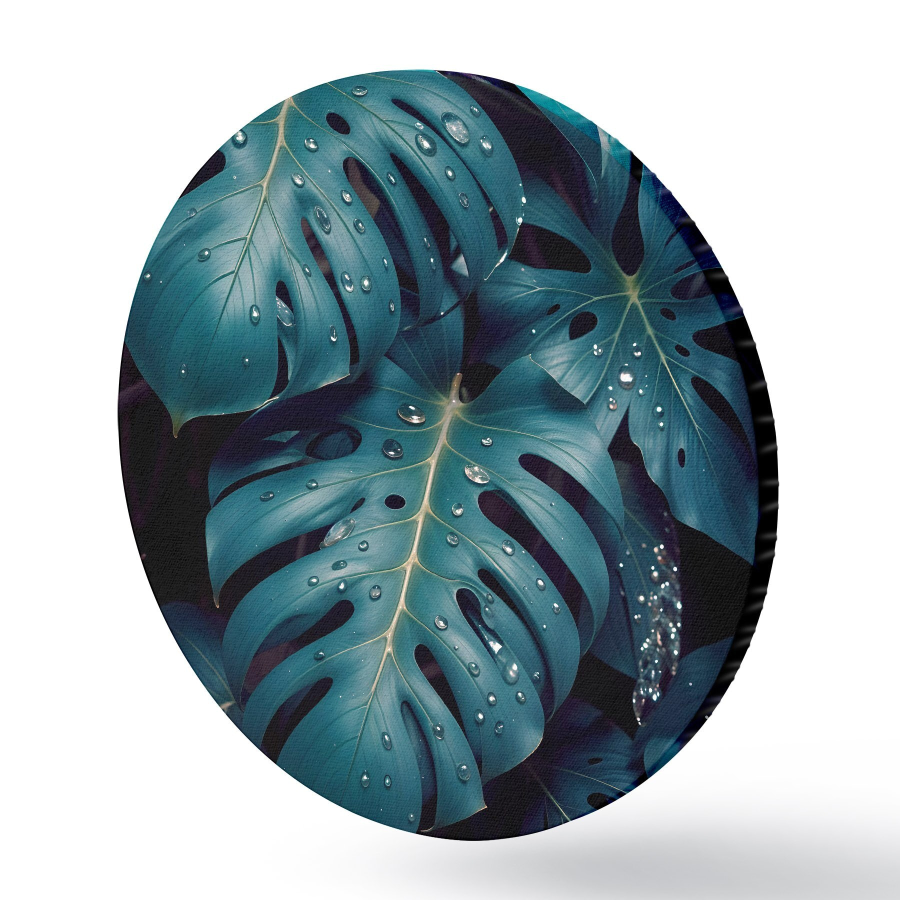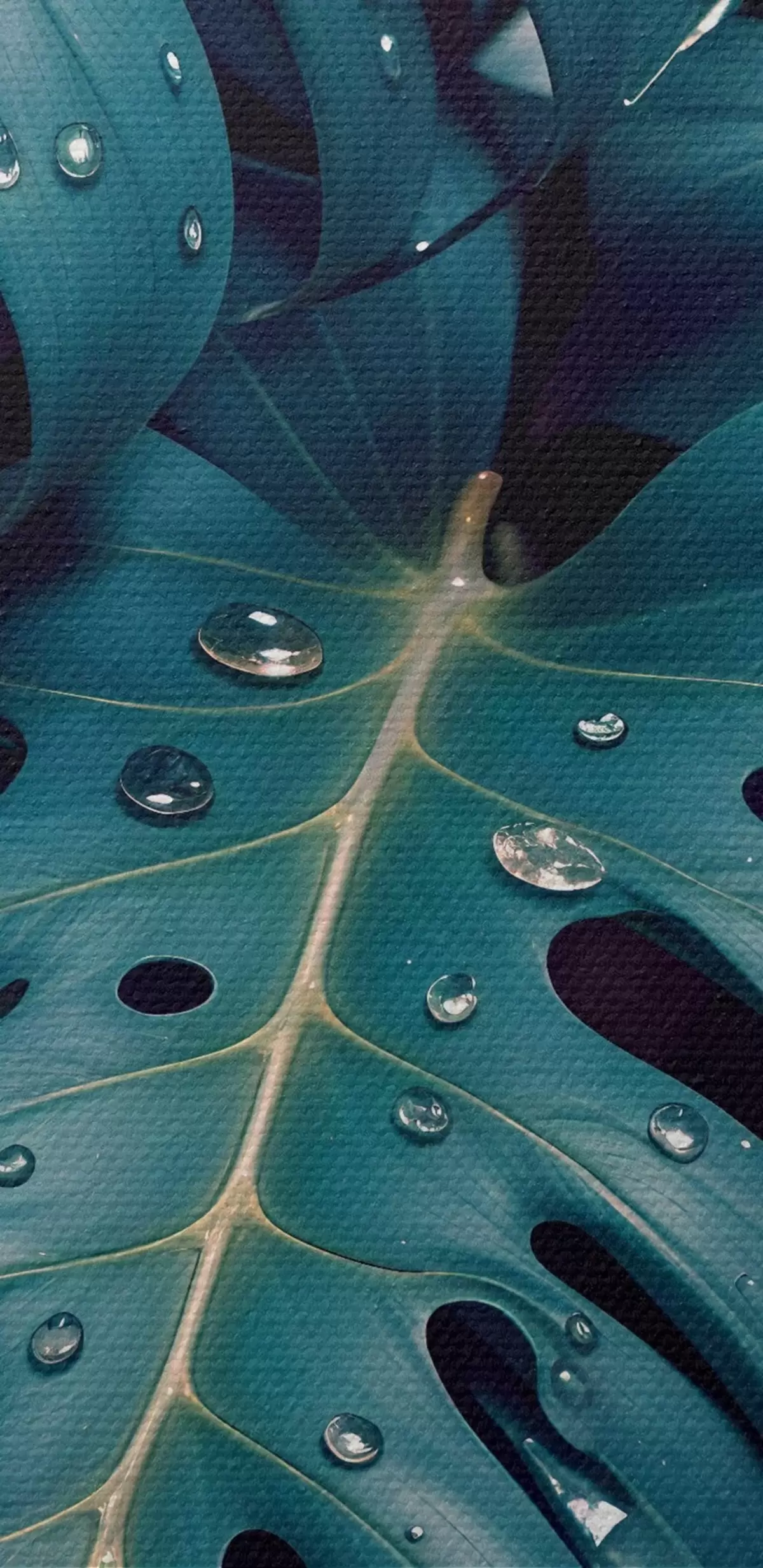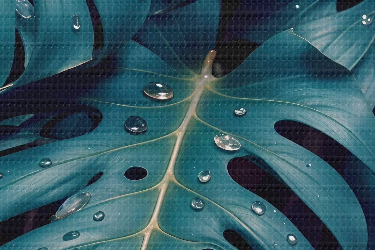 Pilt Lopsakad troopilised monstera lehed koos veepiiskadega tumedal taustal , mis loob meeleoluka ja atmosfäärilise trükise Nr r42233