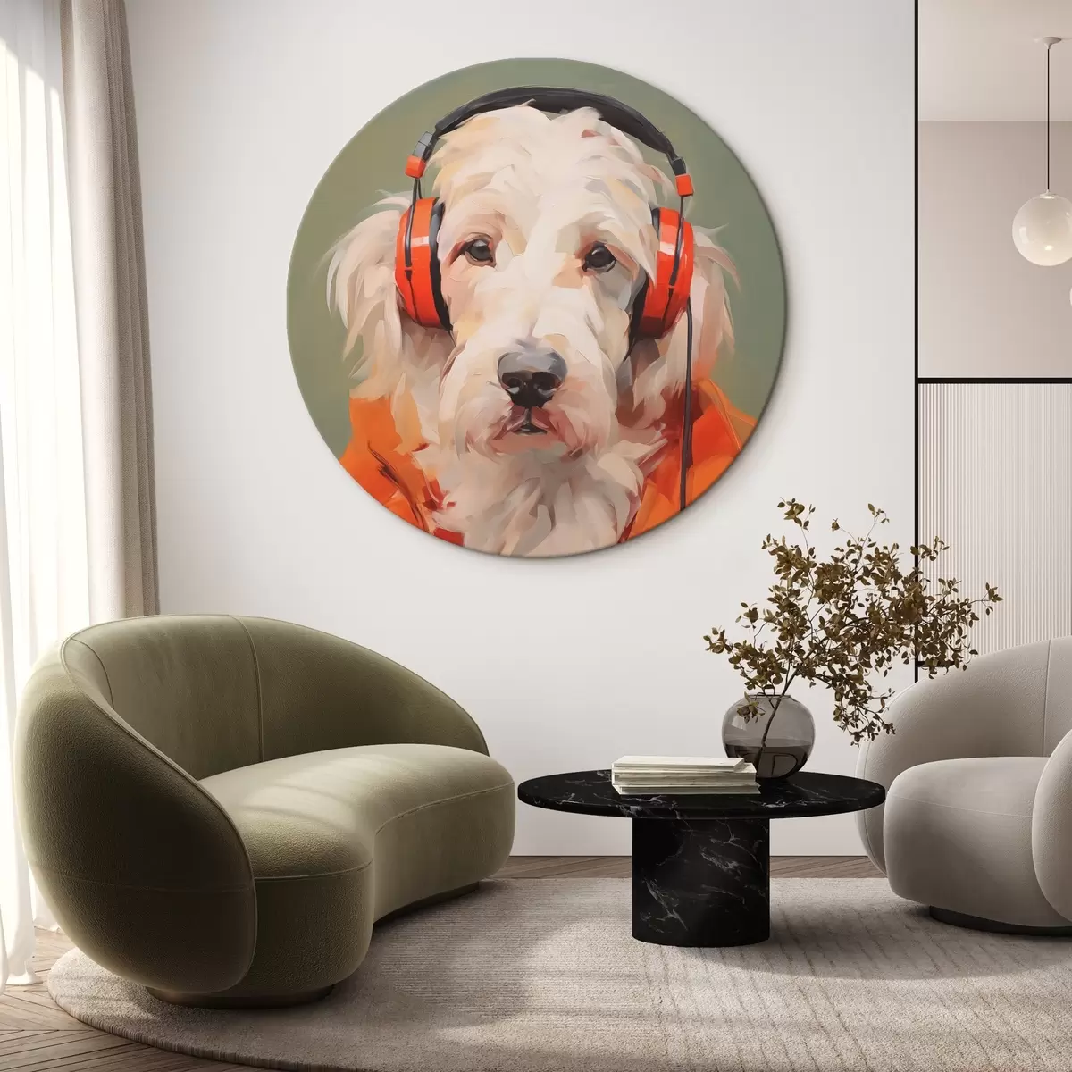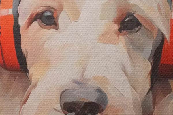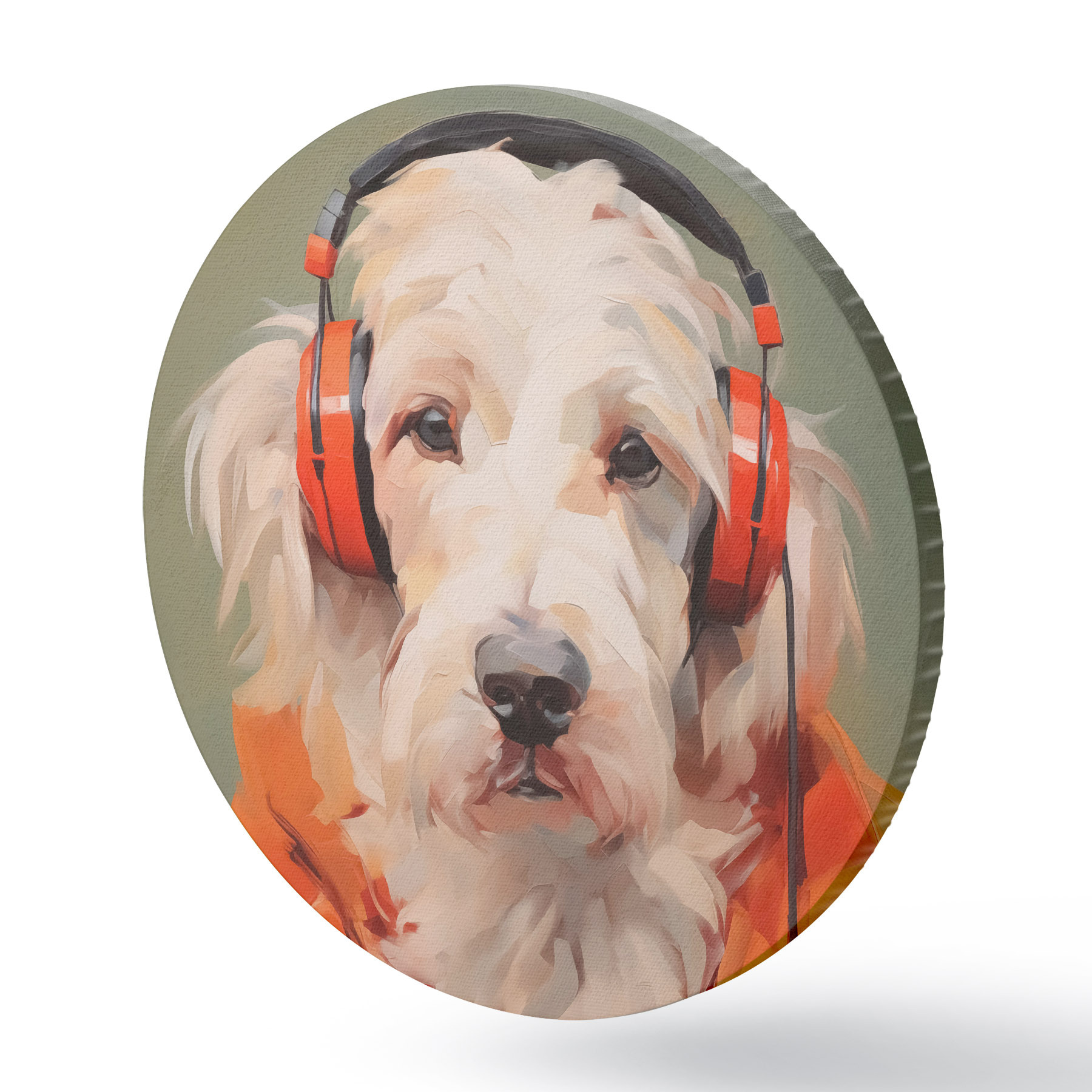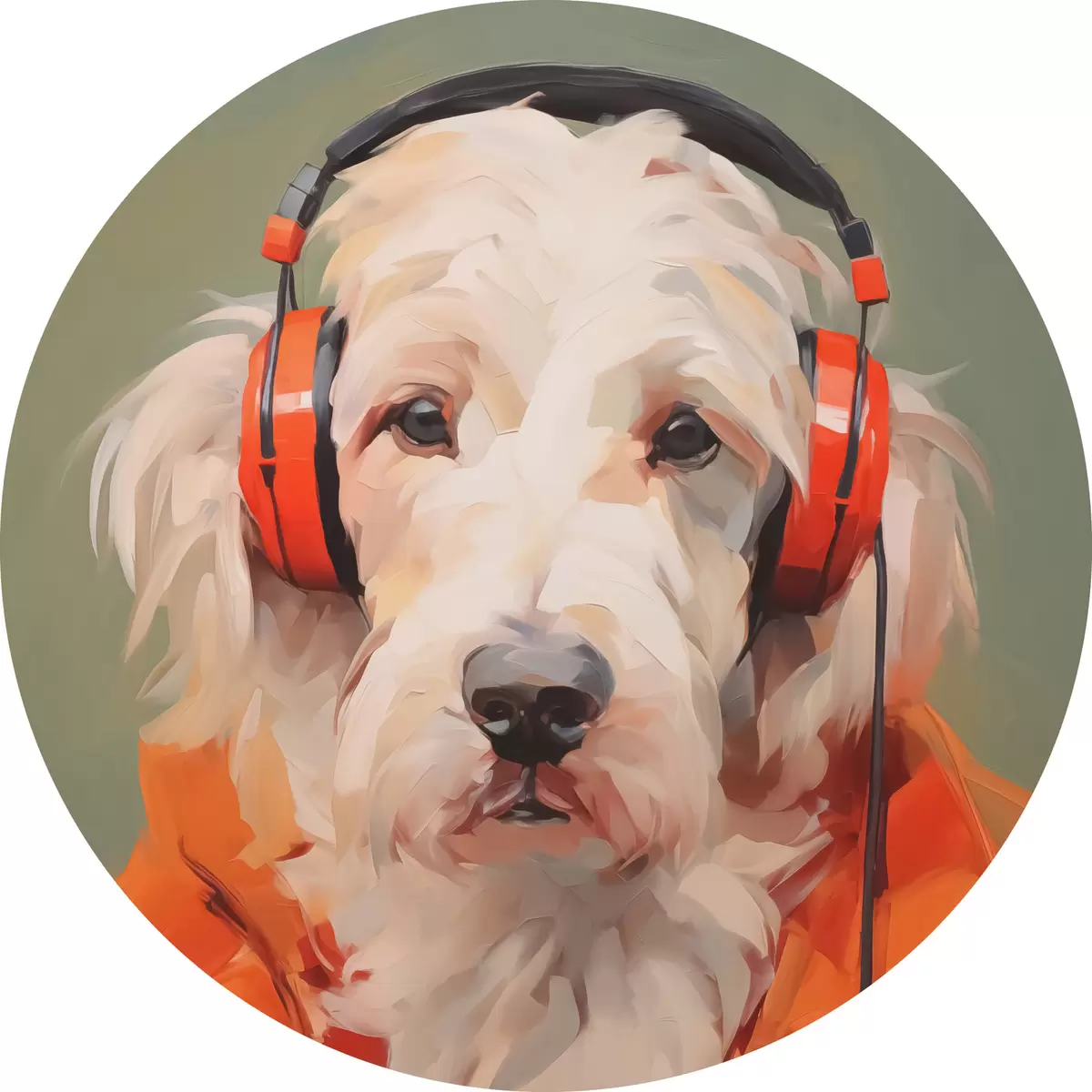 Pilt Valge koer oranži jope ja kõrvaklappide imitatsioonimaaliaga Nr r42364
