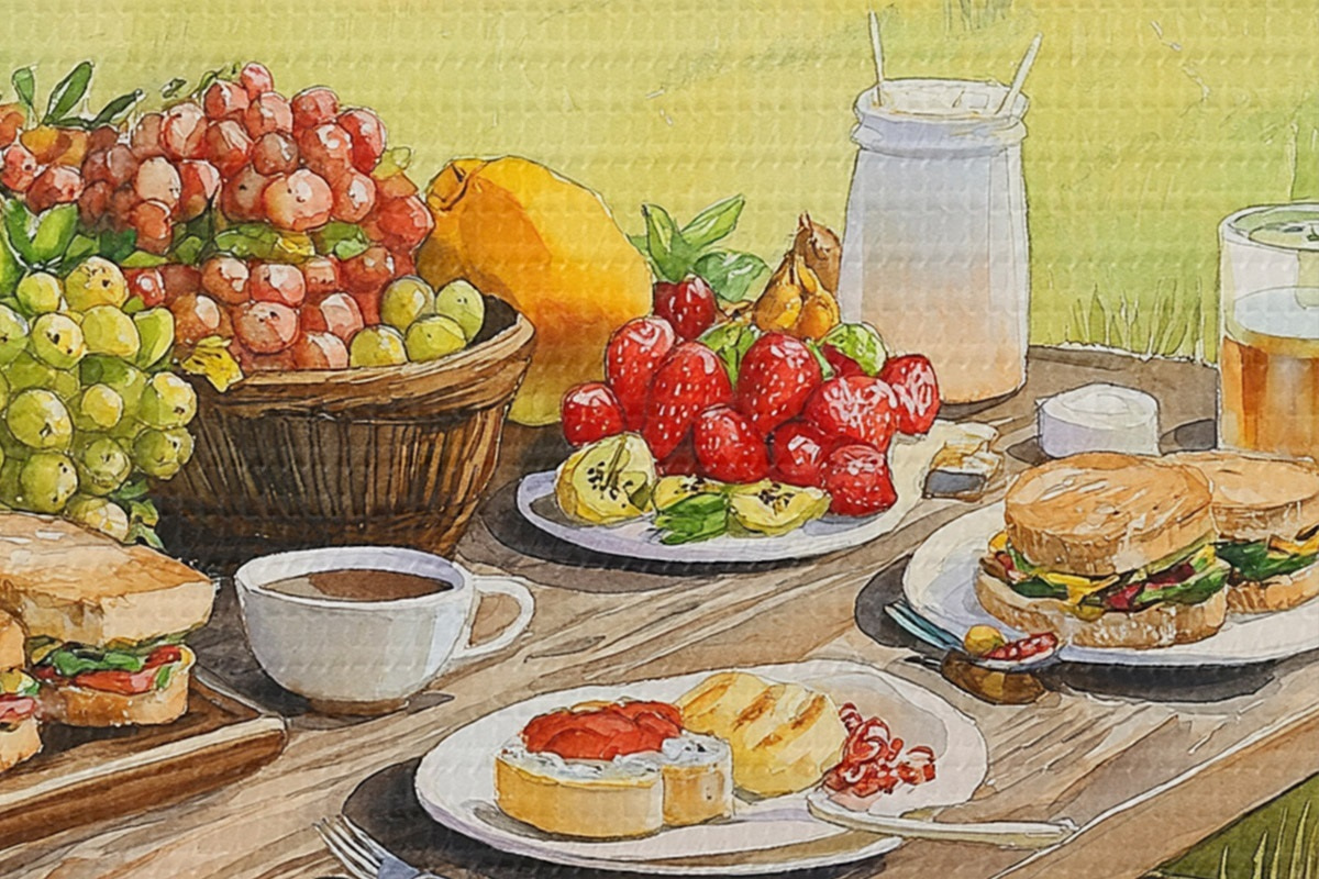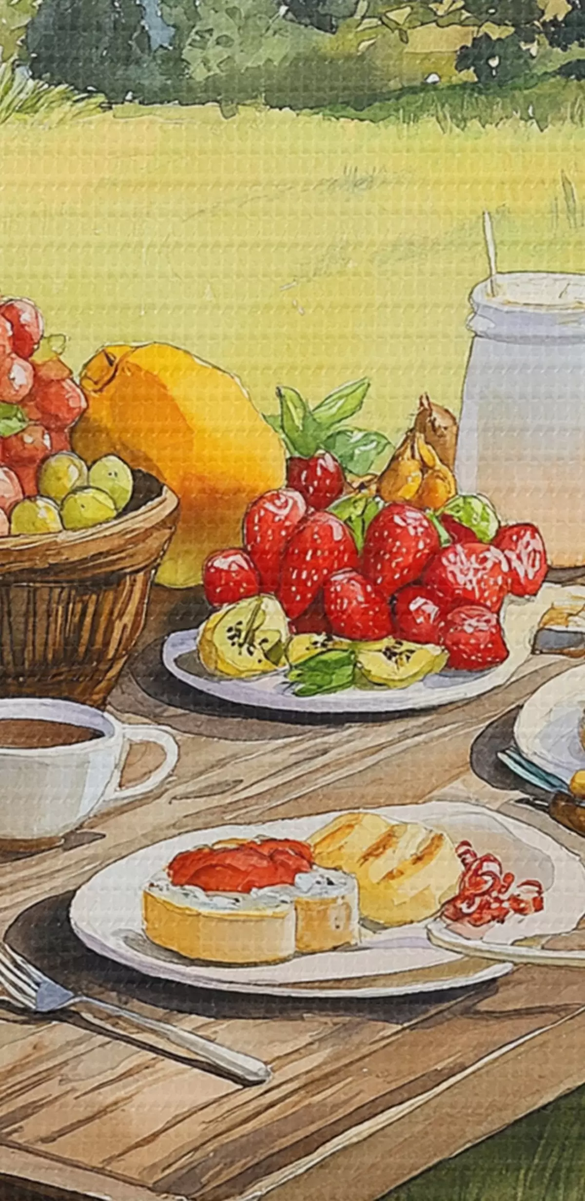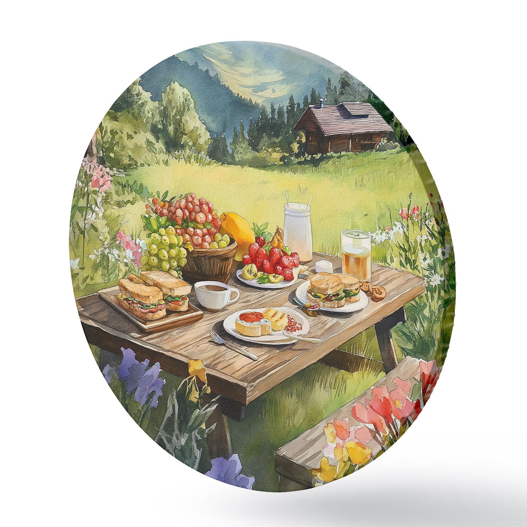 Pilt Mägimaastikud, suvine heinamaa, metsamajad, hommikusöök Nr r42425