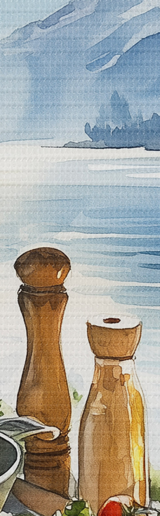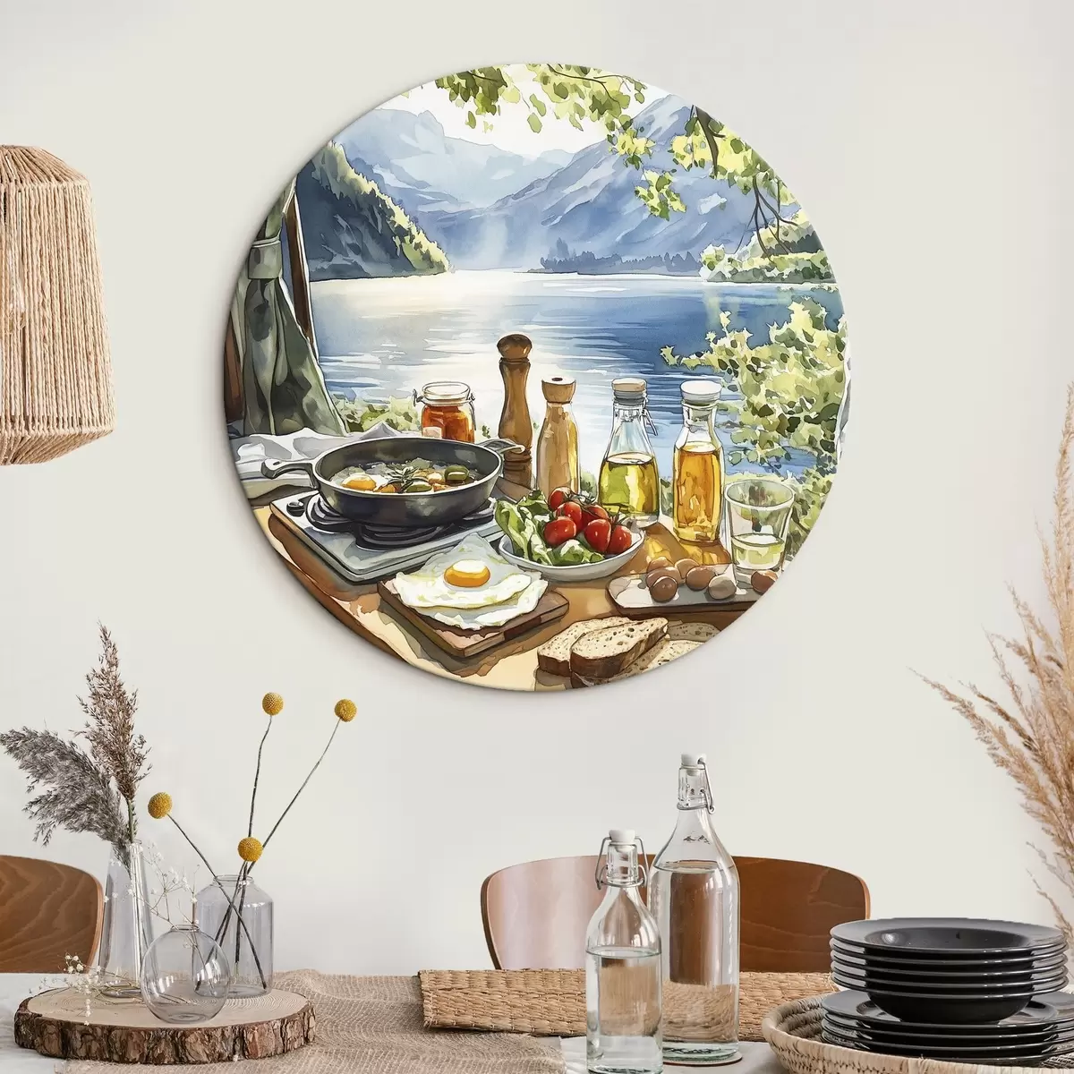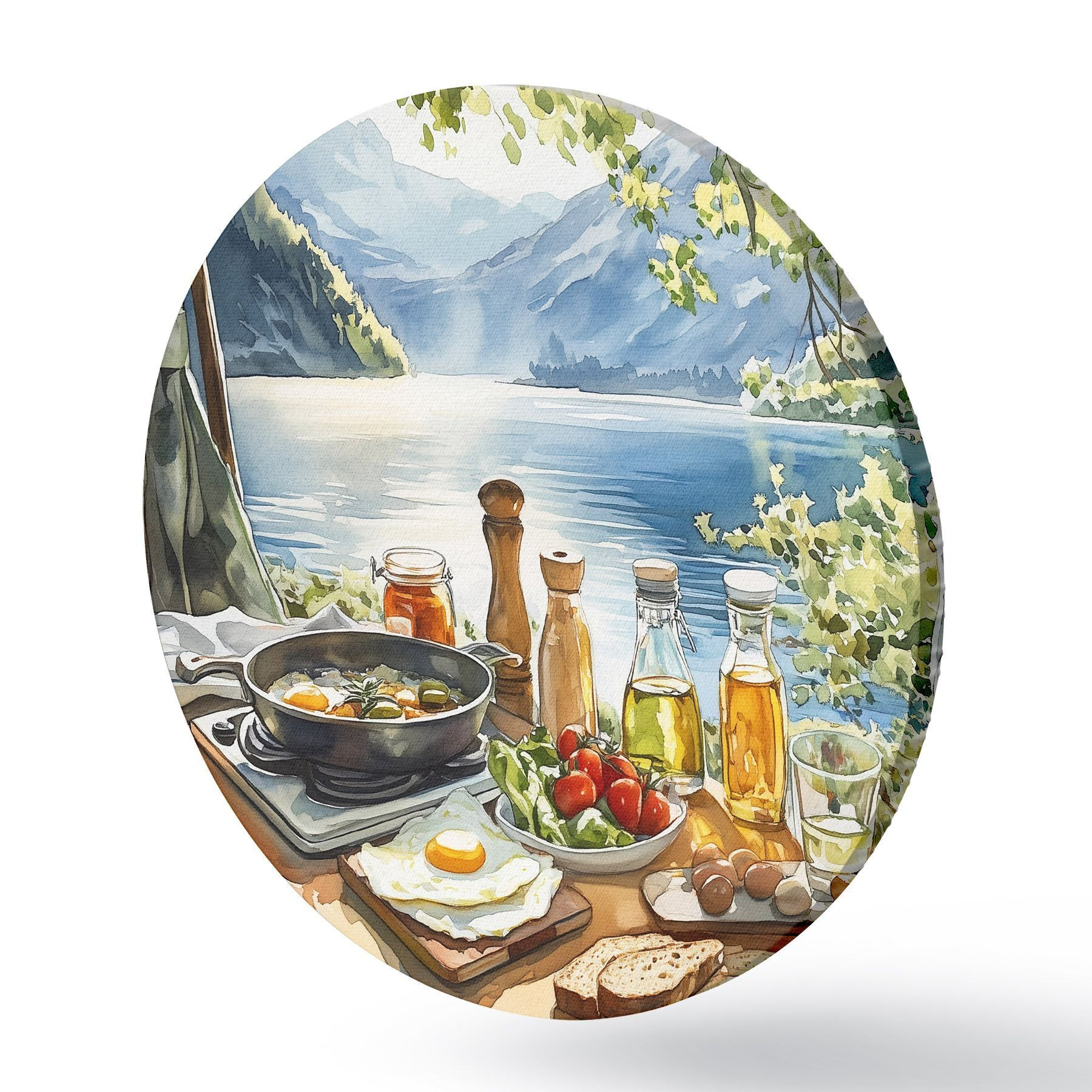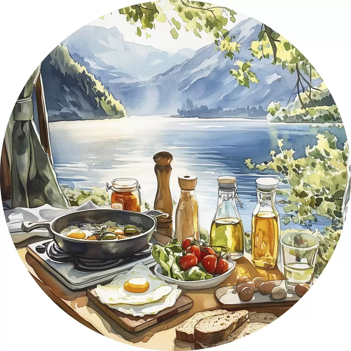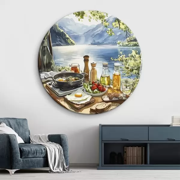 Pilt Ilus suvehommik, järv, akvarellstiil, hommikusöök, reisimine Nr r42433