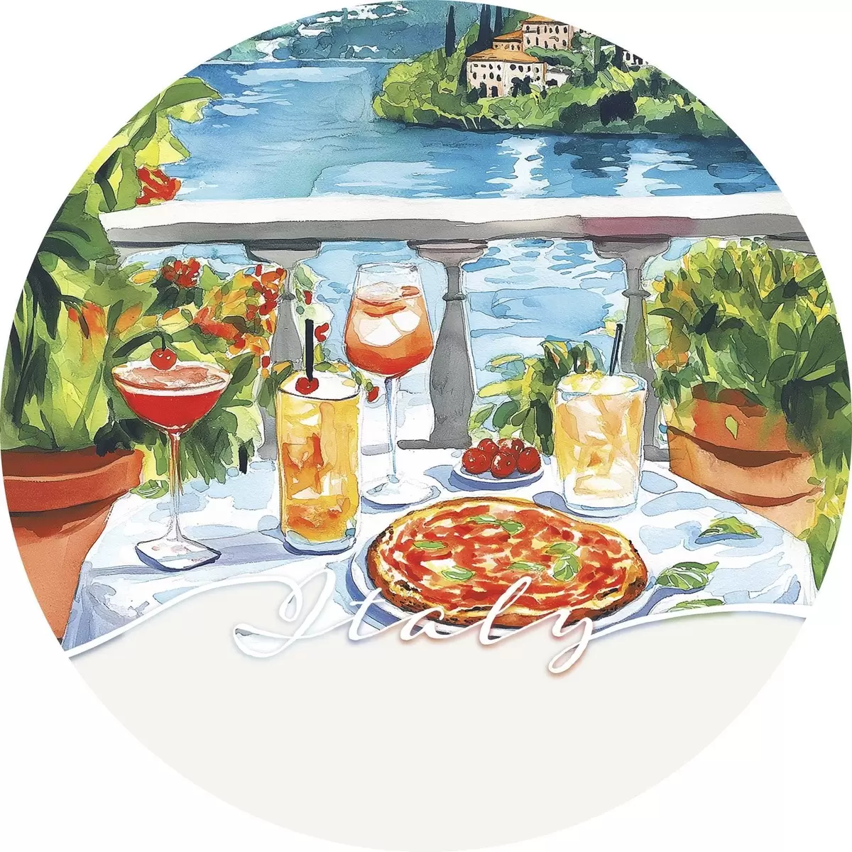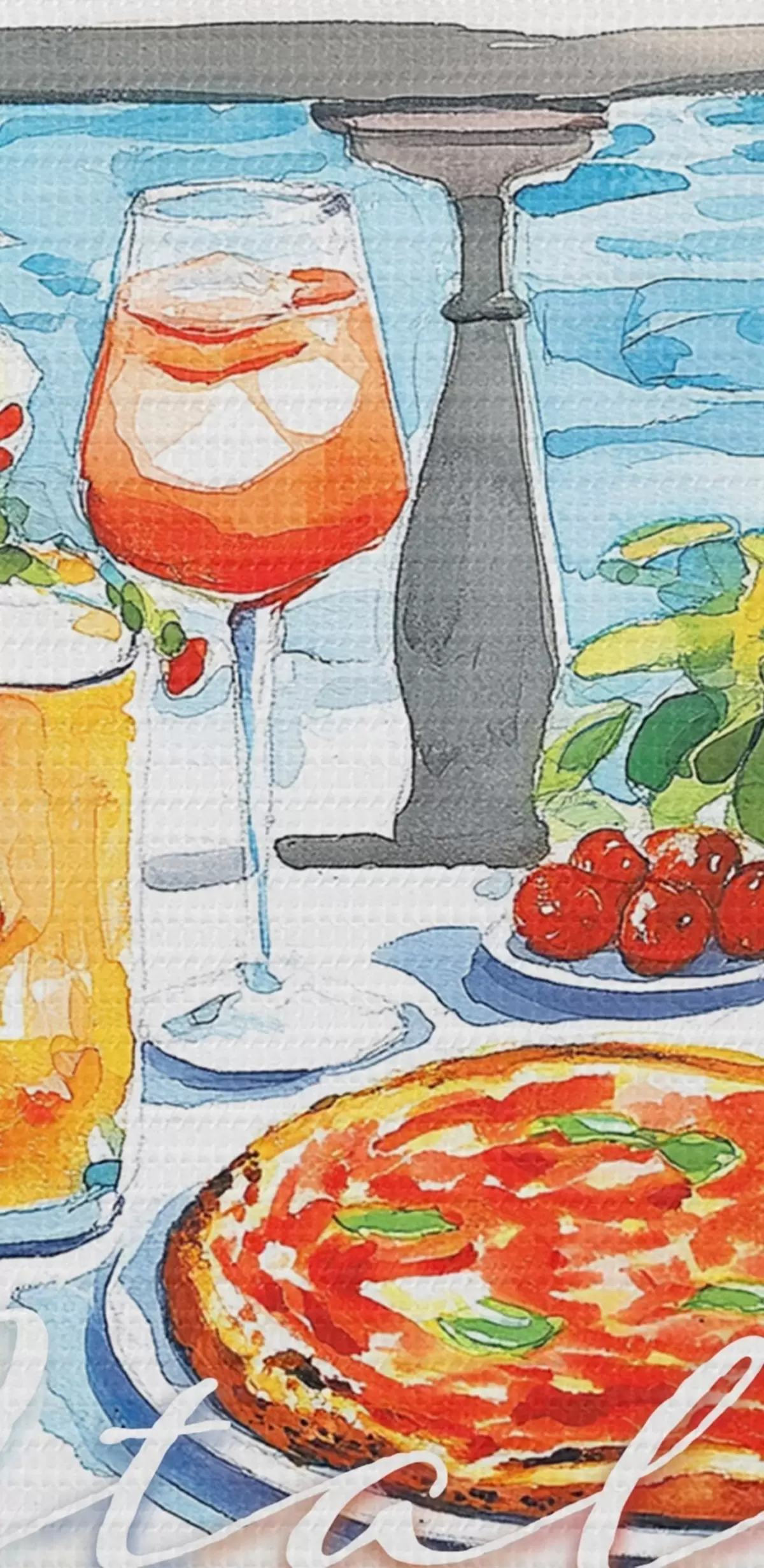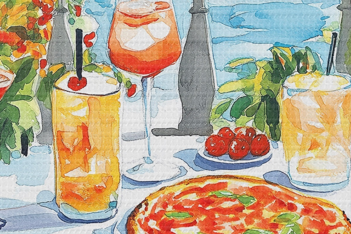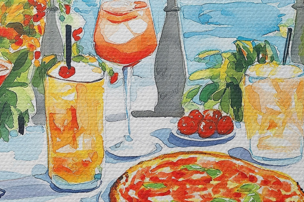 Pilt Itaalia esteetika, akvarellistiil, pitsa ja kokteilid, mäed Nr r42434