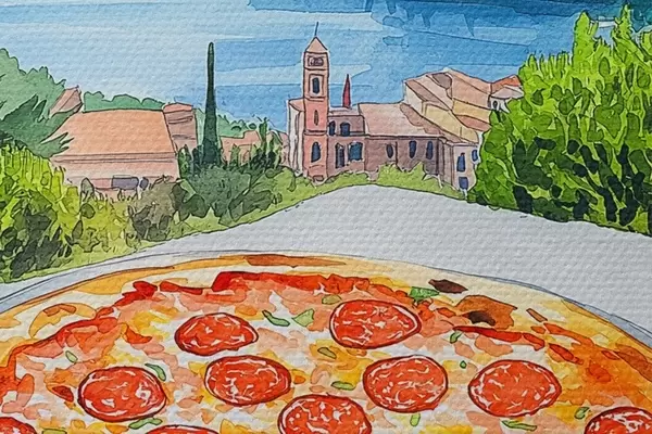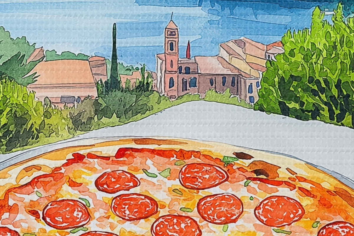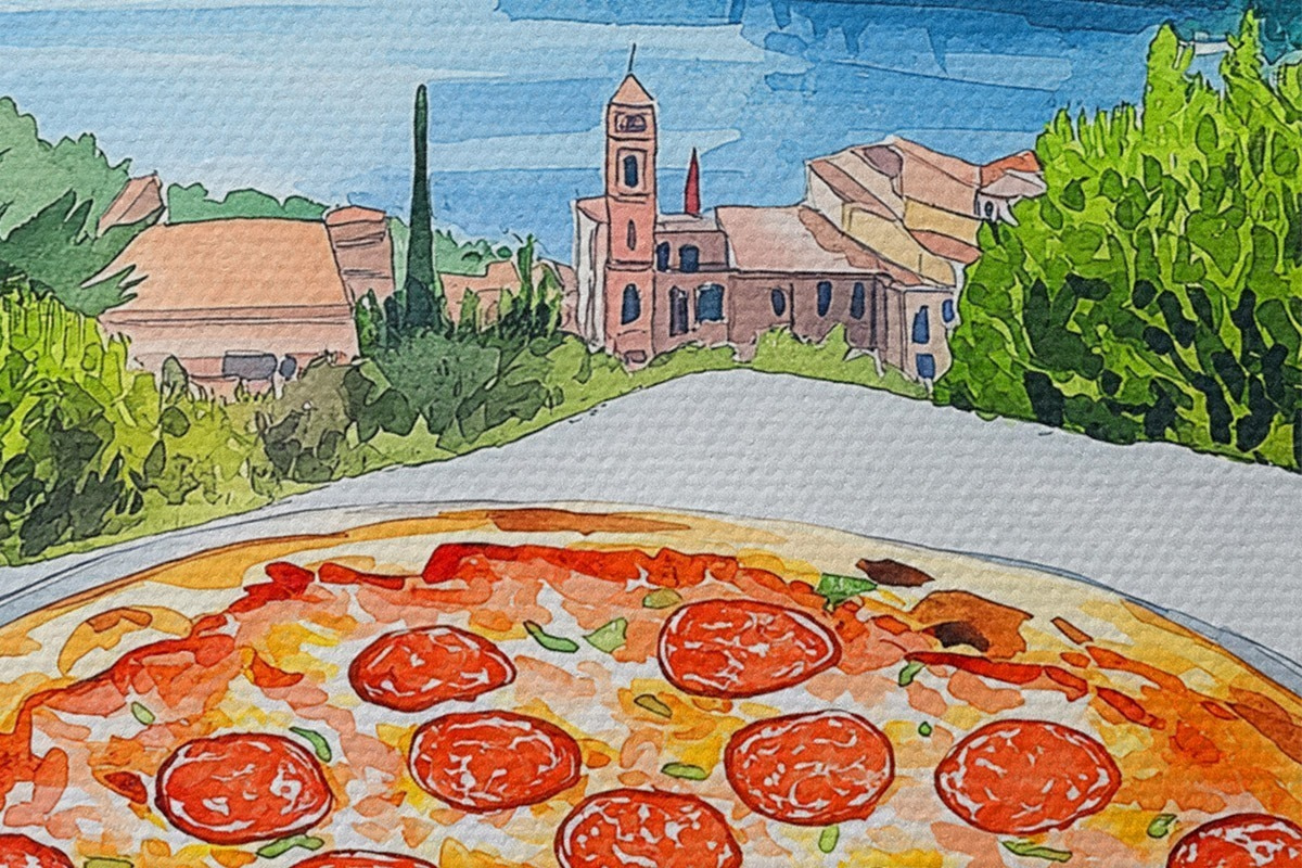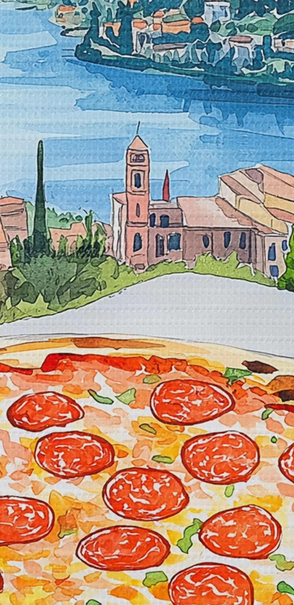 Pilt Akvarellistiil, Itaalia, pizza, vanalinn, mäed maastik Nr r42435
