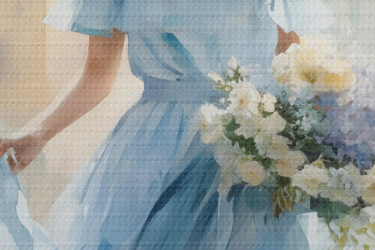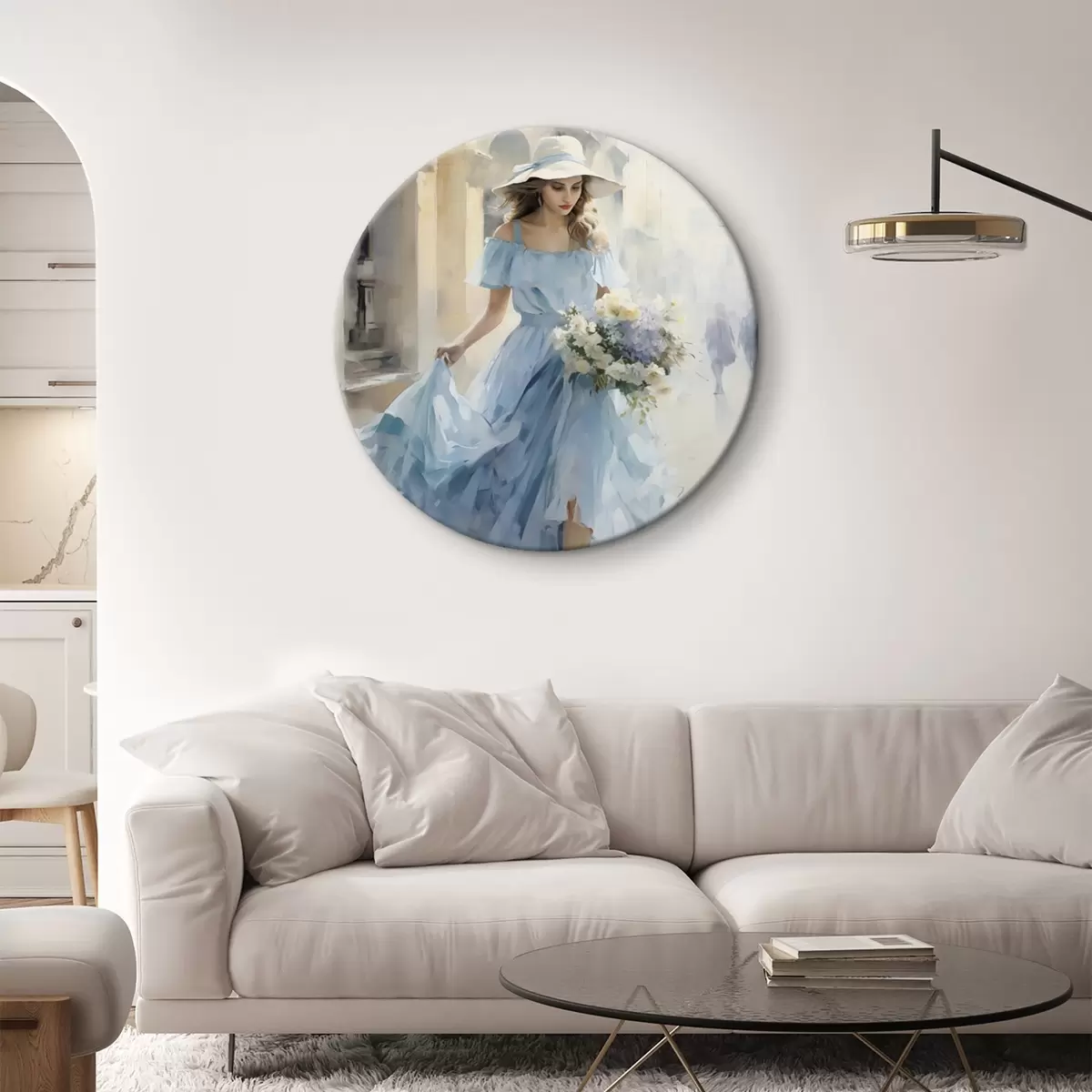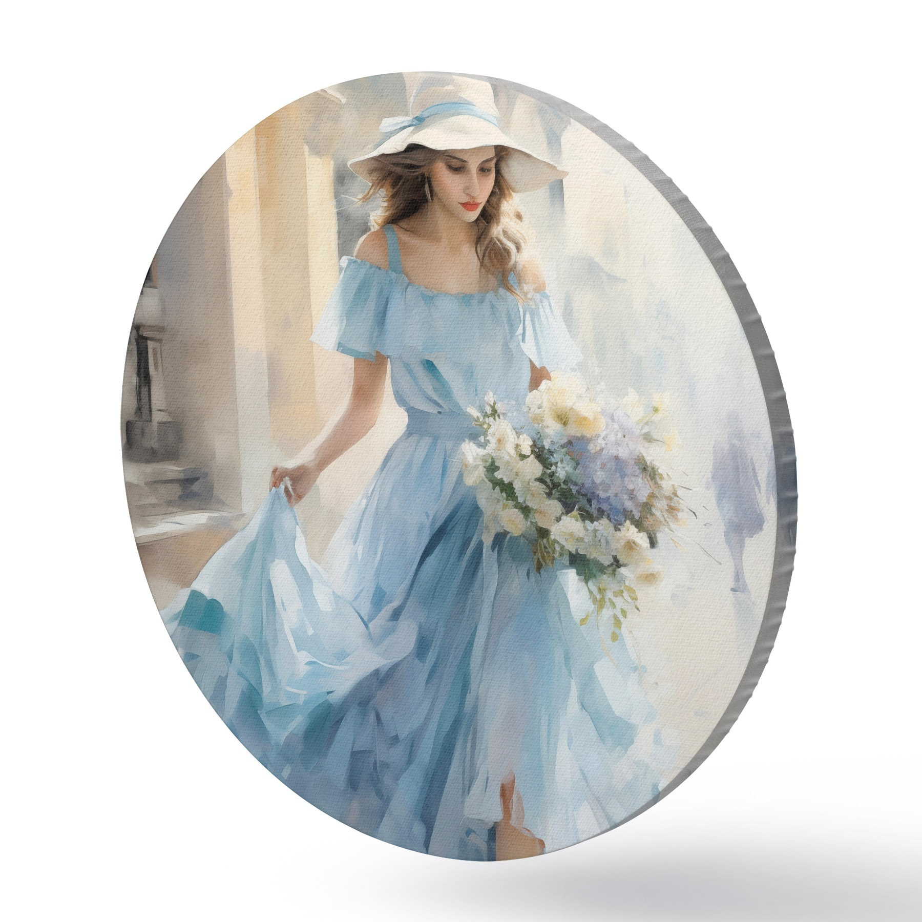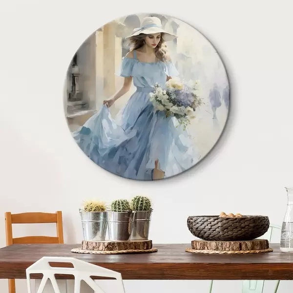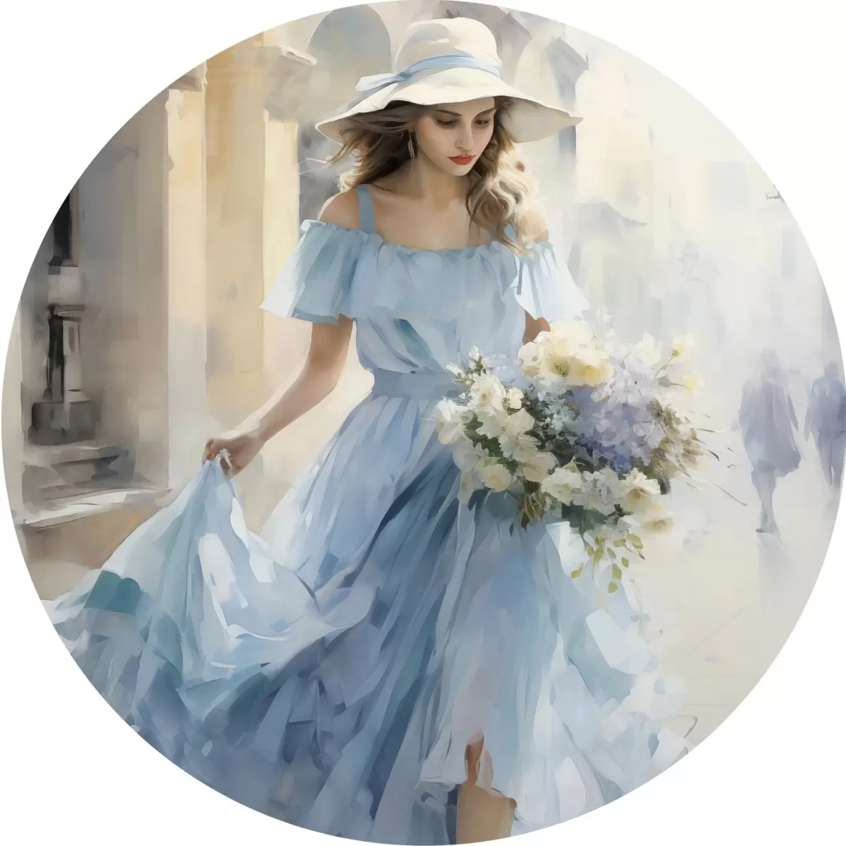 Pilt Elegantne tüdruk helesinises kleidis ja mütsis jalutamas läbi linna, käes lillekimp, kerge ja romantiline meeleolu Nr r42580