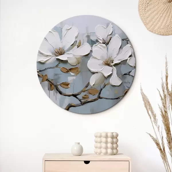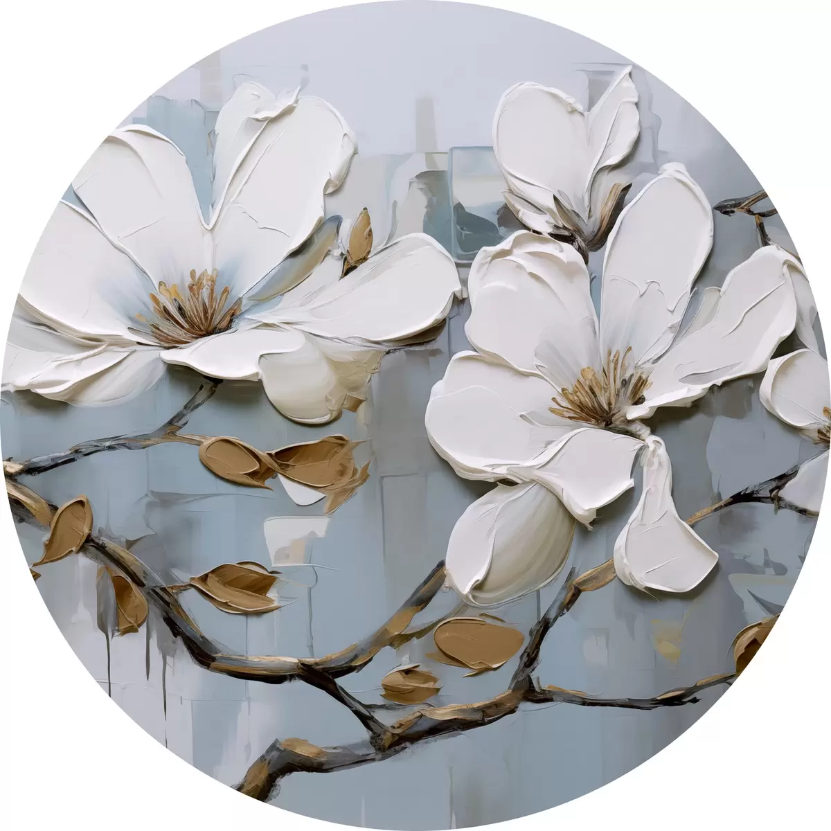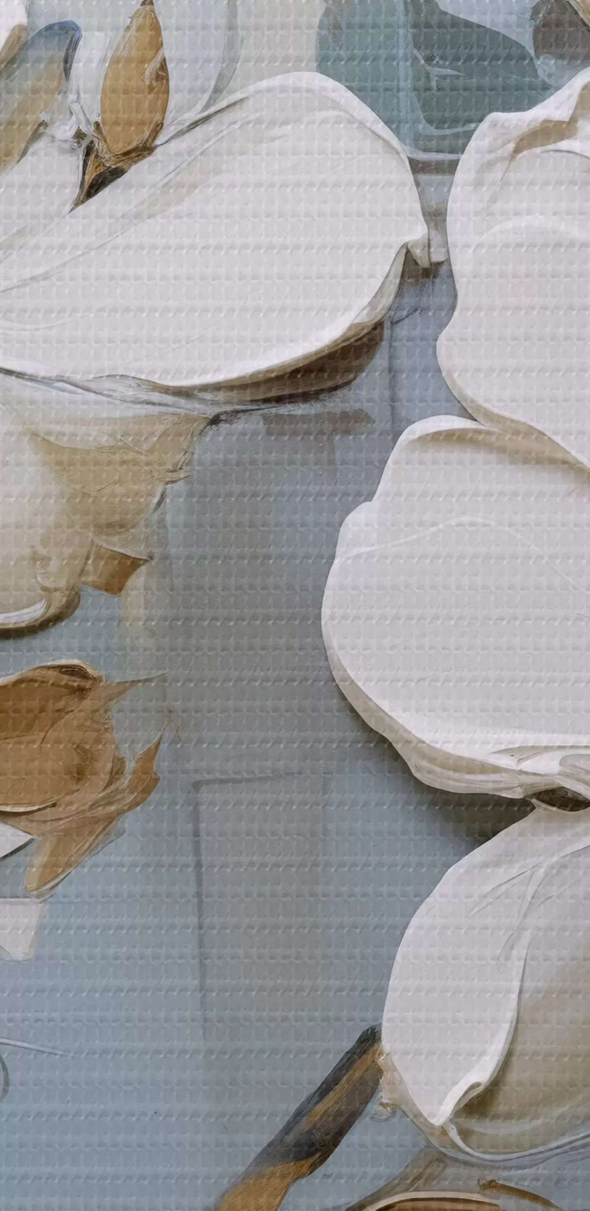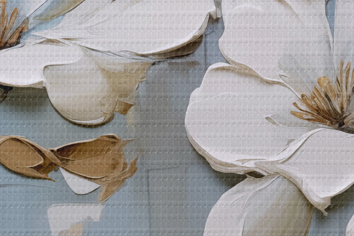 Pilt Valged magnoolia lilled tekstuursete kroonlehtede ja pruunide lehtedega pehme sinise taustaga õlimaalide jäljendusega Nr r42711
