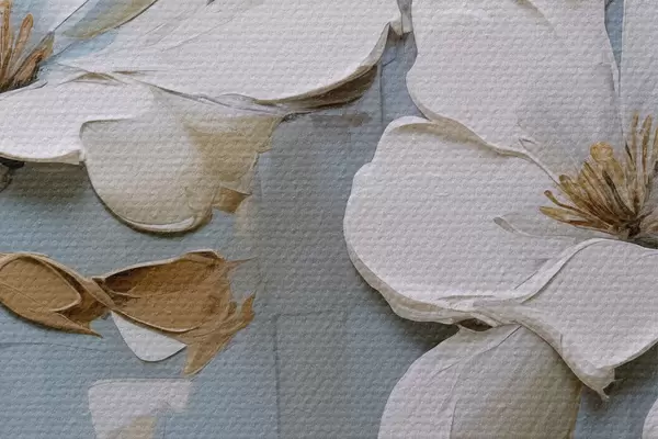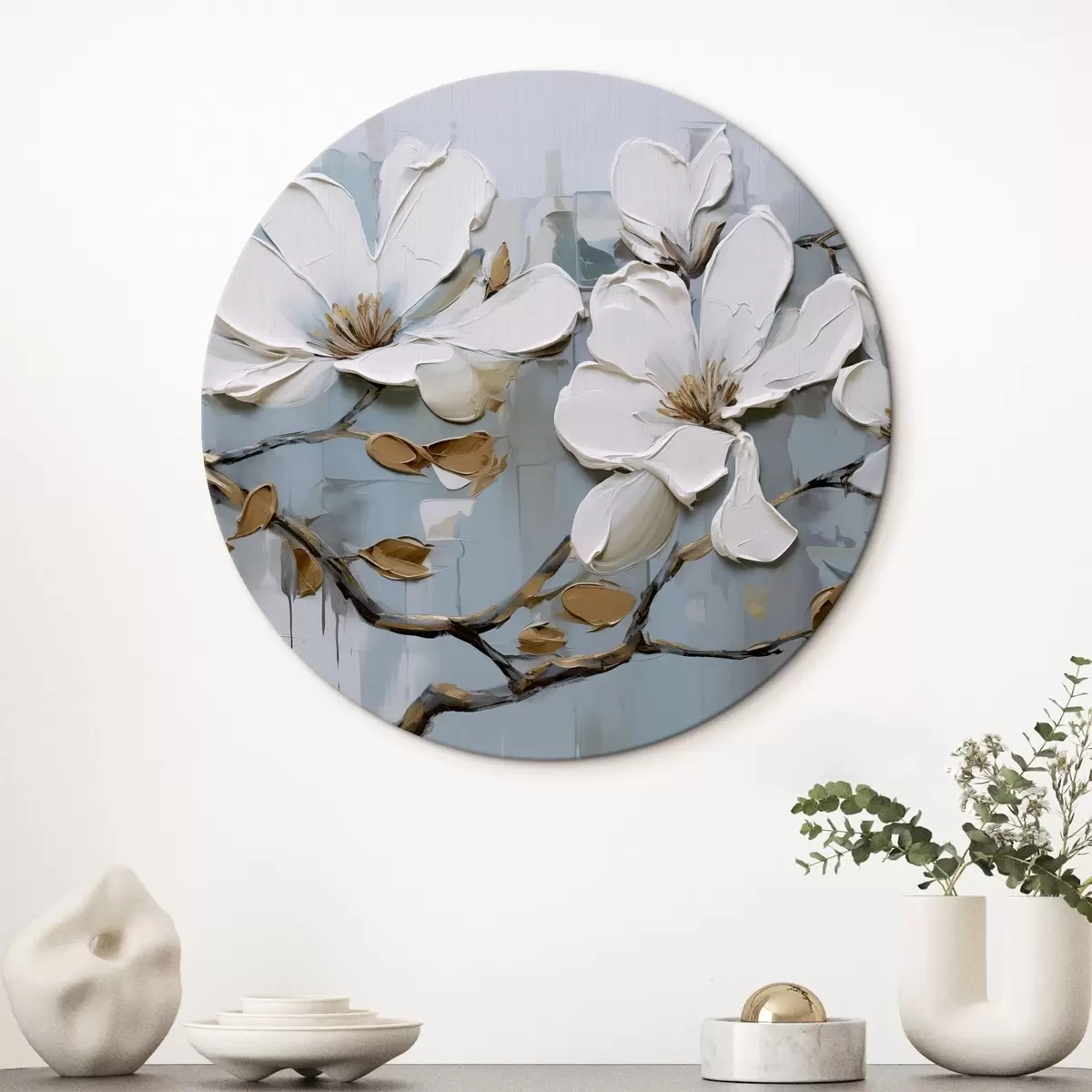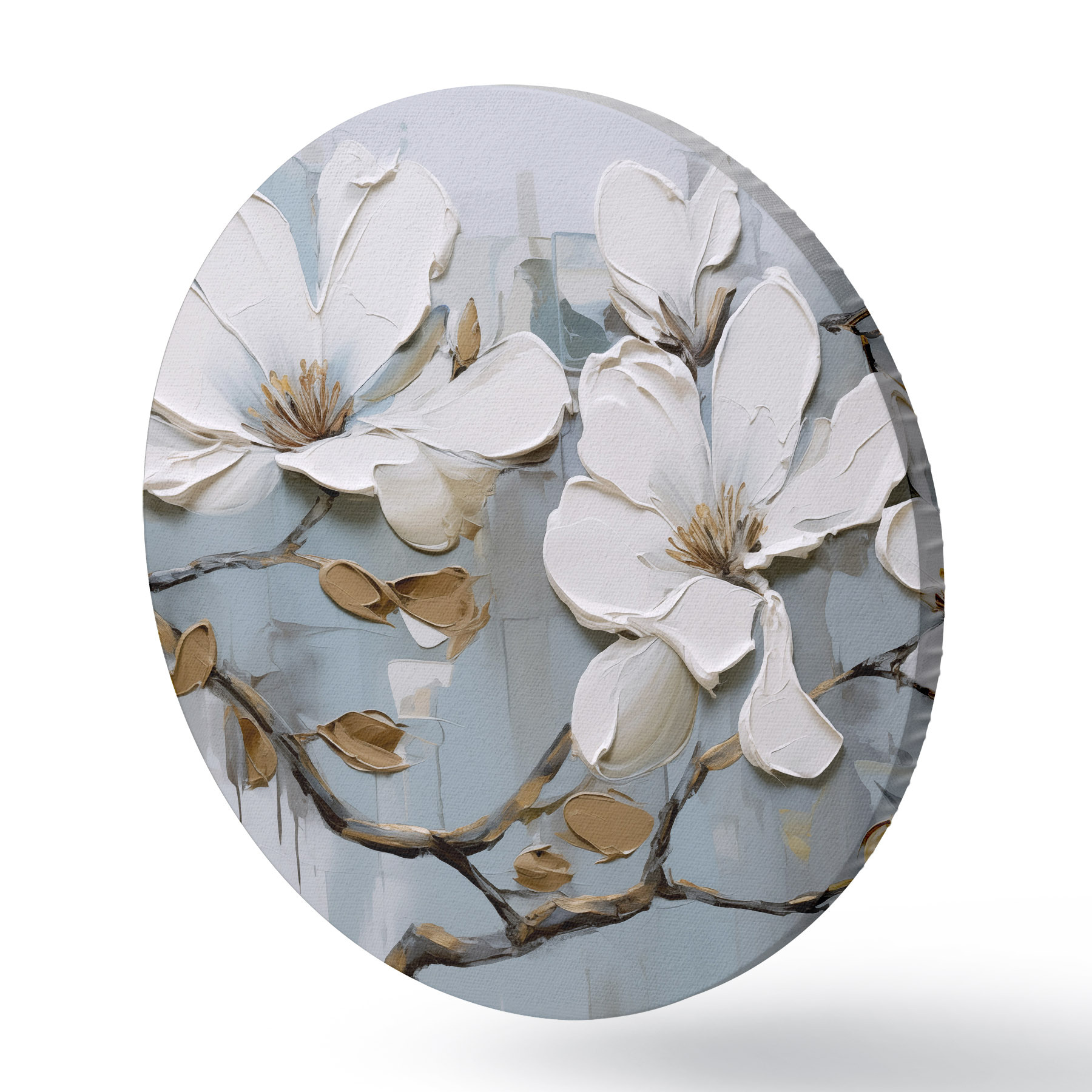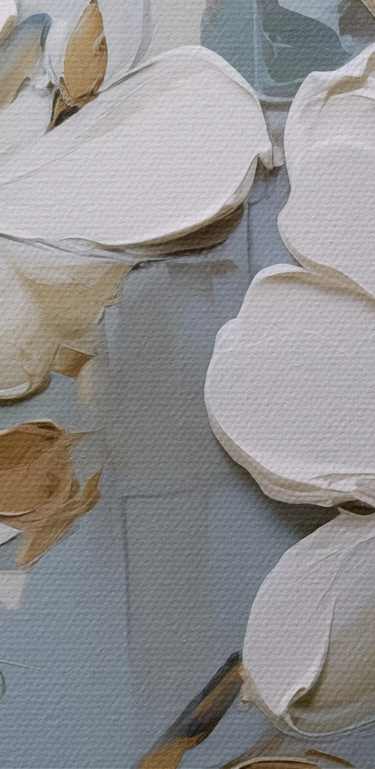 Pilt Valged magnoolia lilled tekstuursete kroonlehtede ja pruunide lehtedega pehme sinise taustaga õlimaalide jäljendusega Nr r42711
