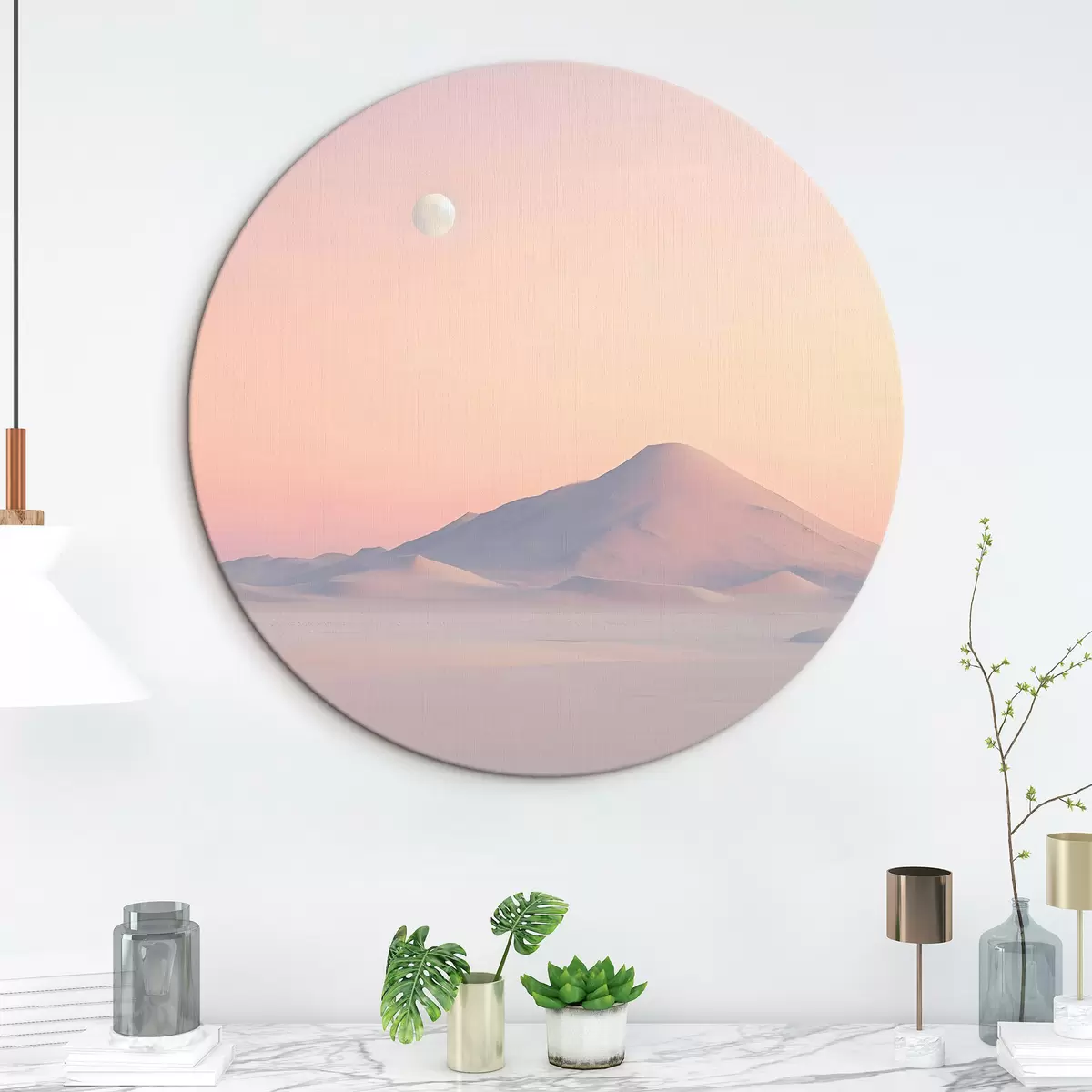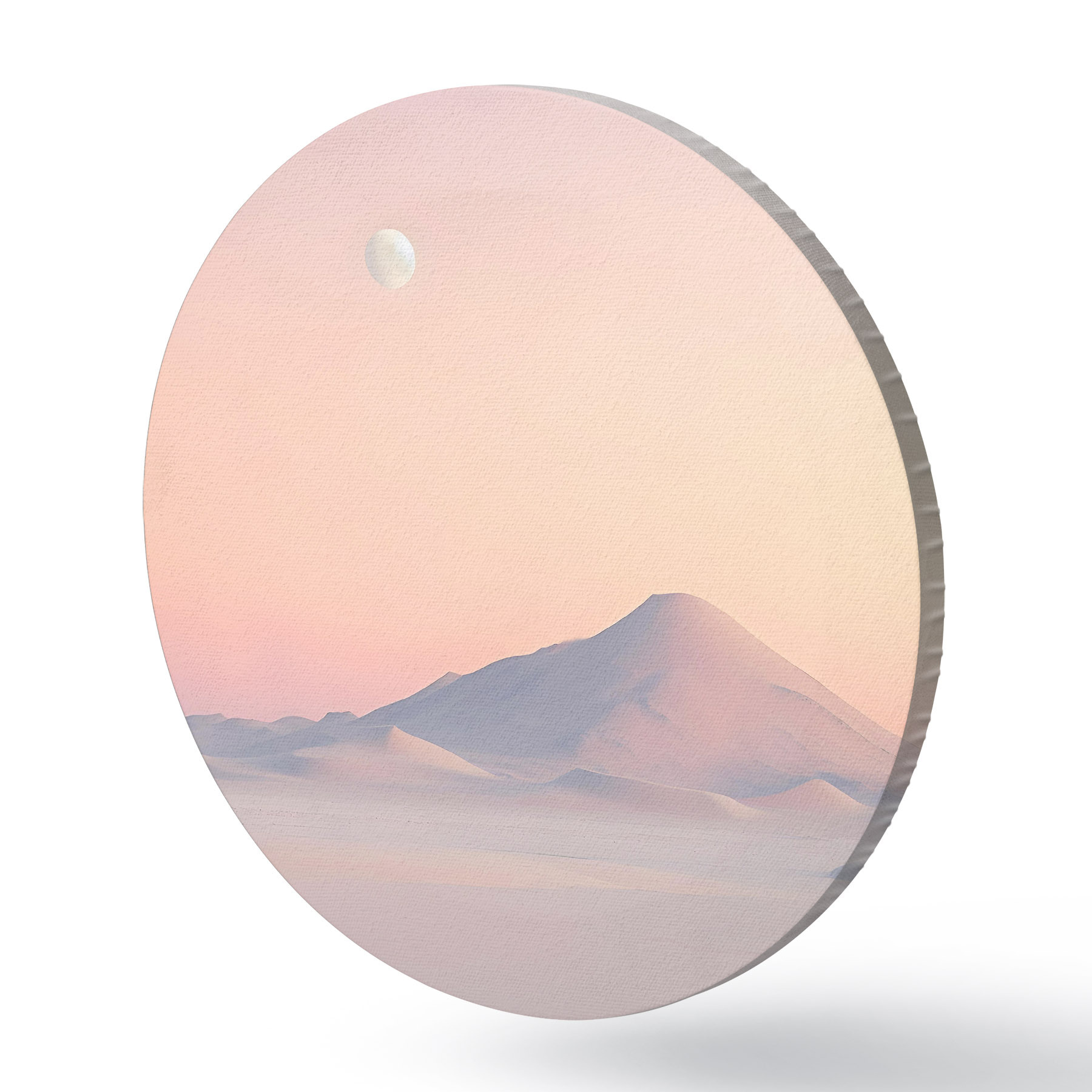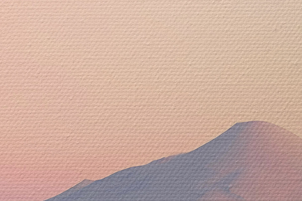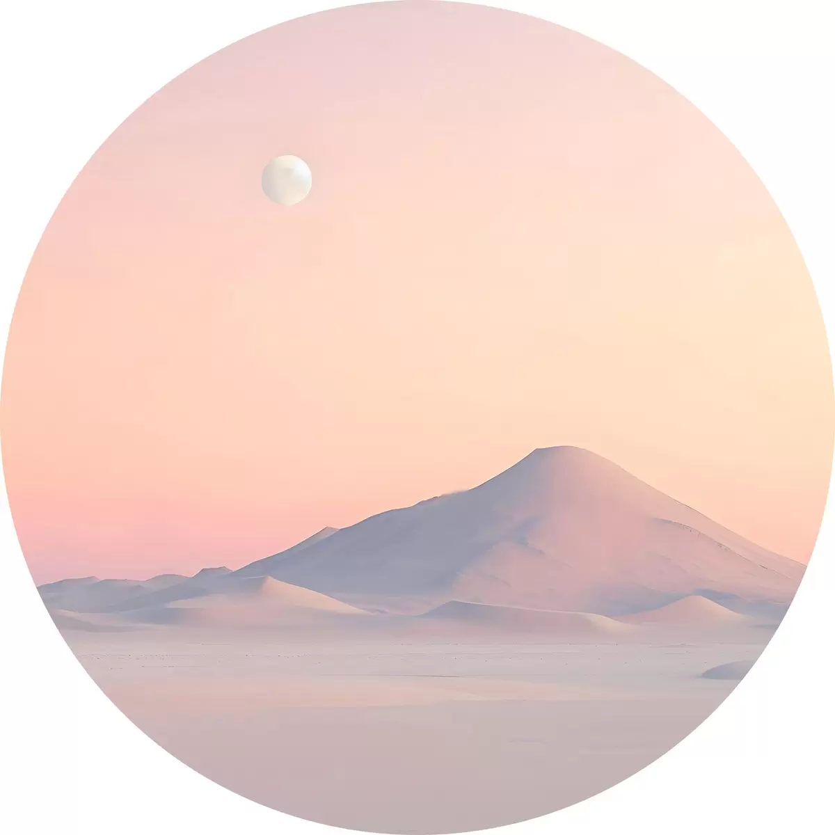 Pilt Pehmete pastelsete värvidega suur mägi õrna nõlvaga, kus taevas on näha kahvatu kuu Nr r42718