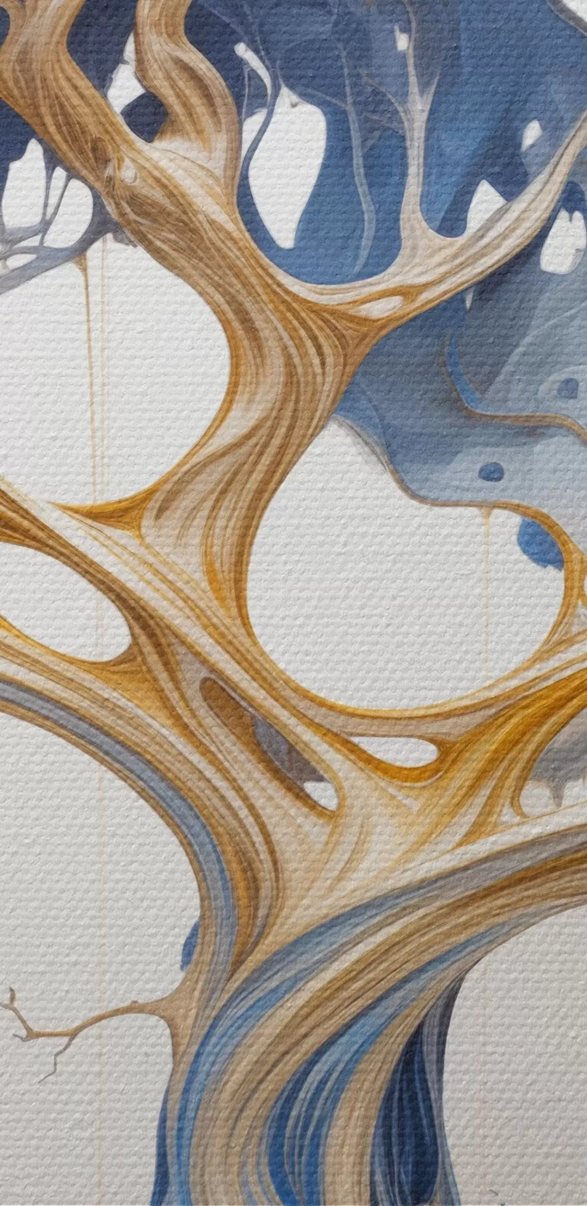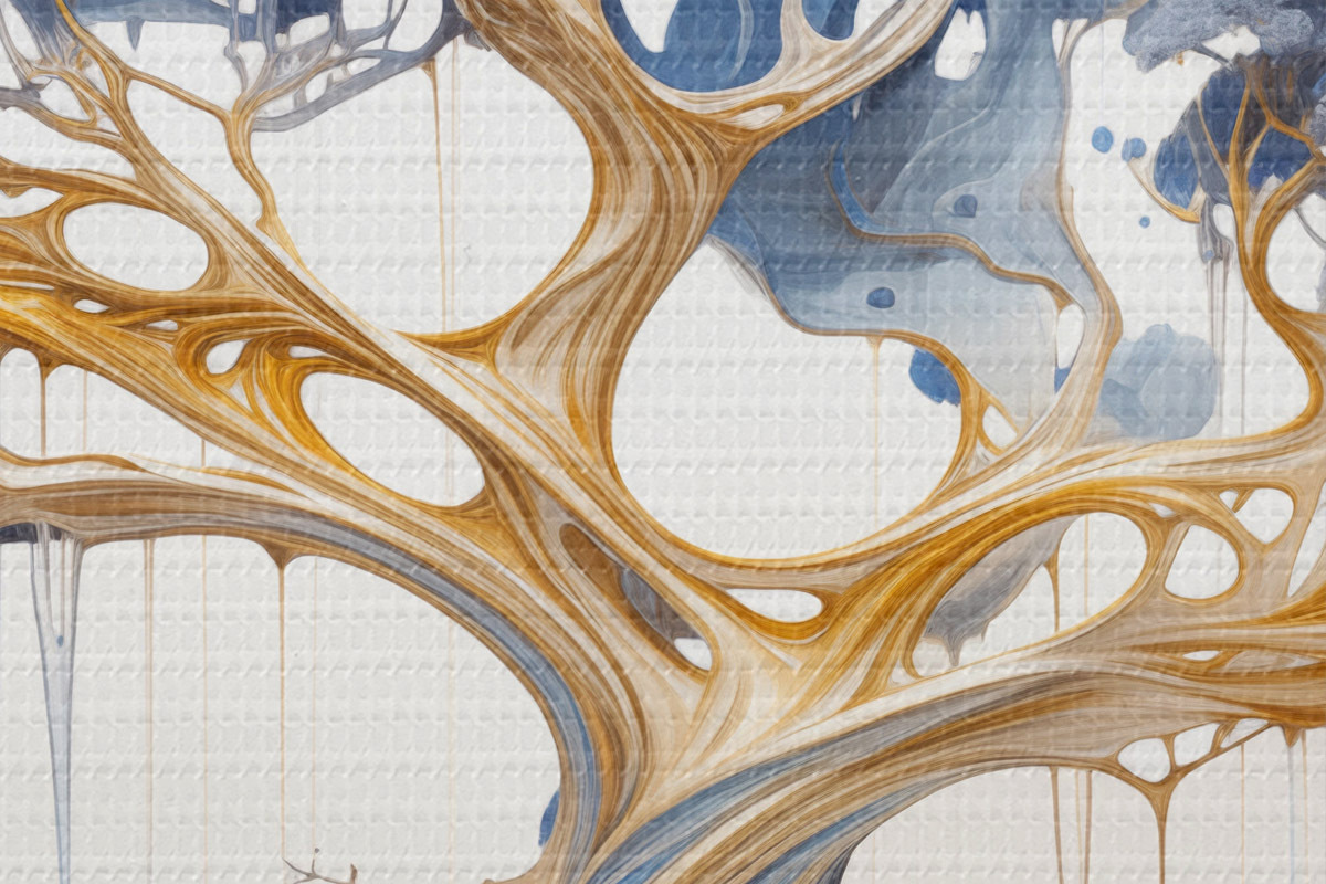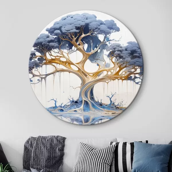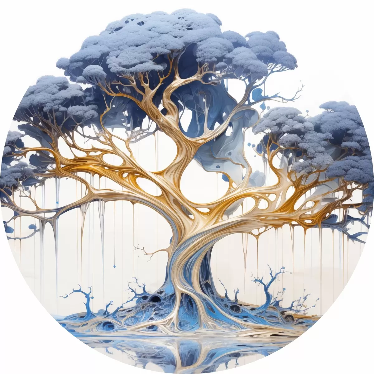 Pilt Stiliseeritud puu keeruliste okste ja lehtedega, millel on siniste ja kollaste toonide segu Nr r42722